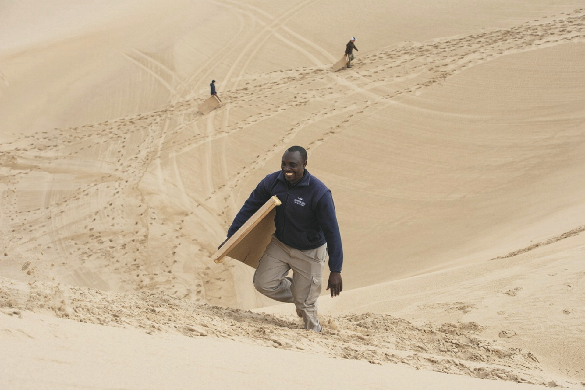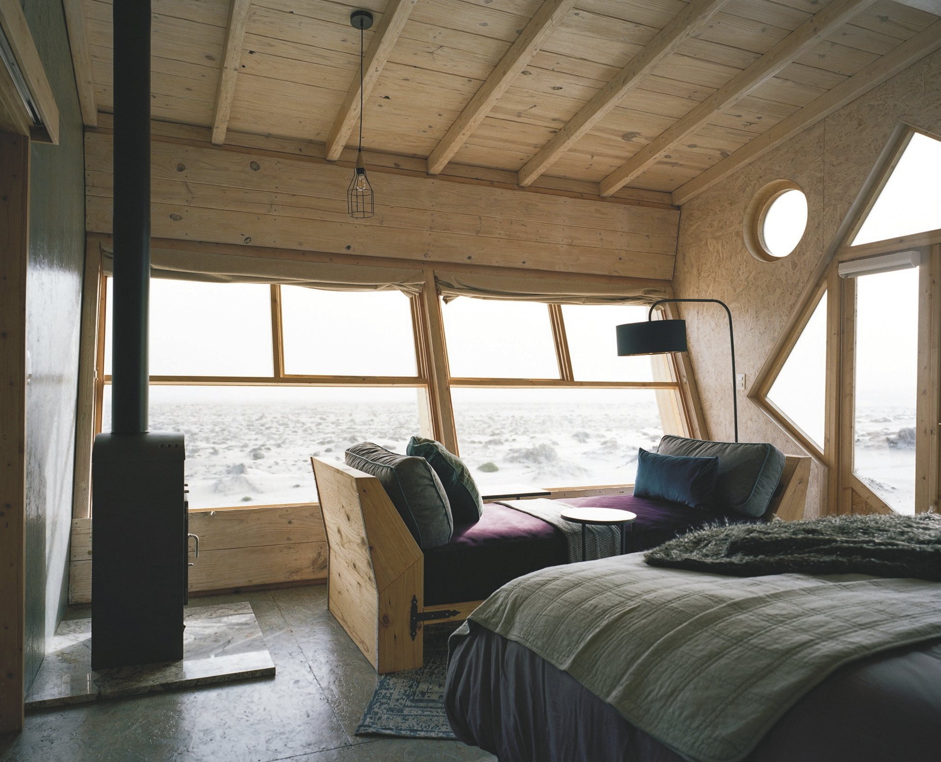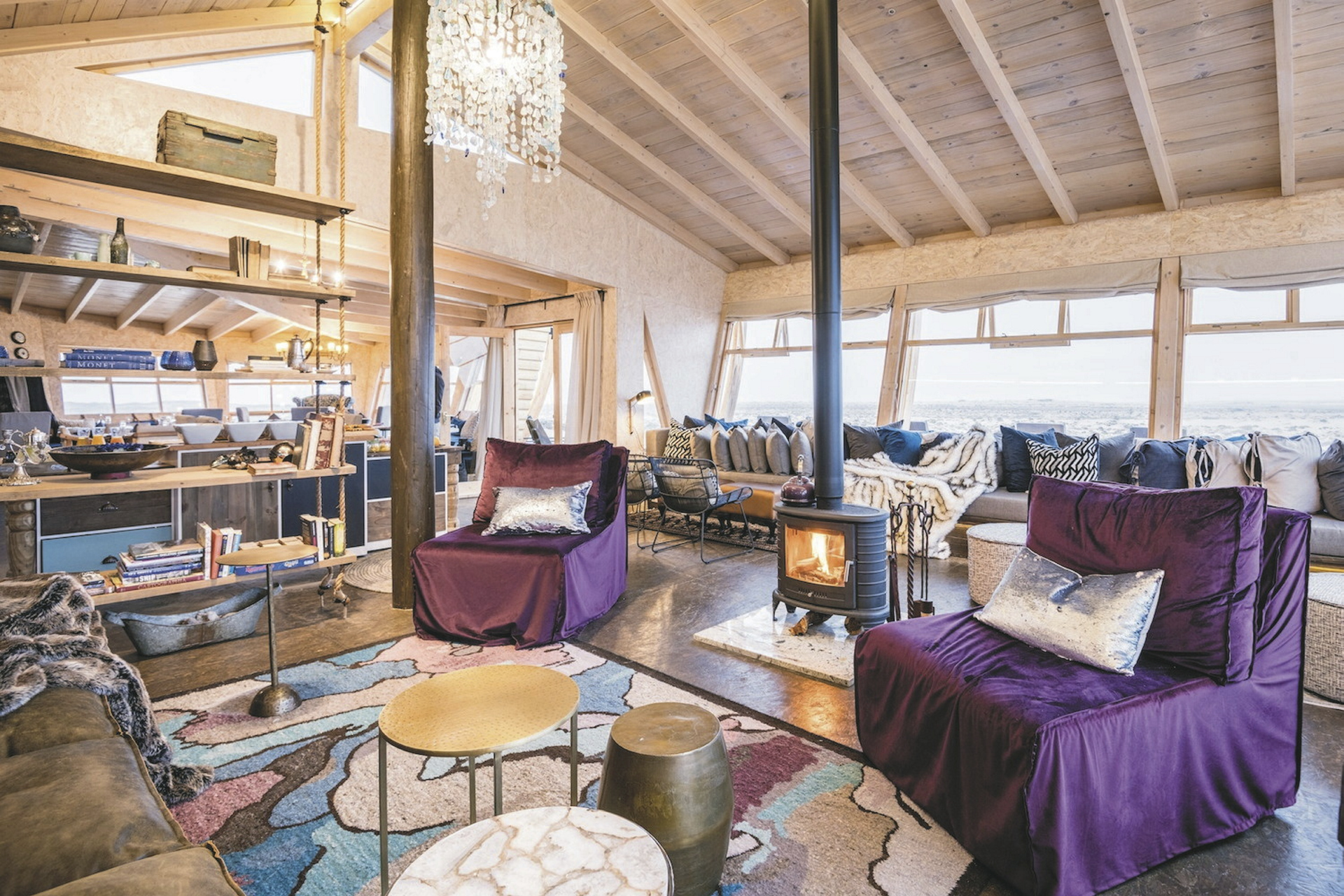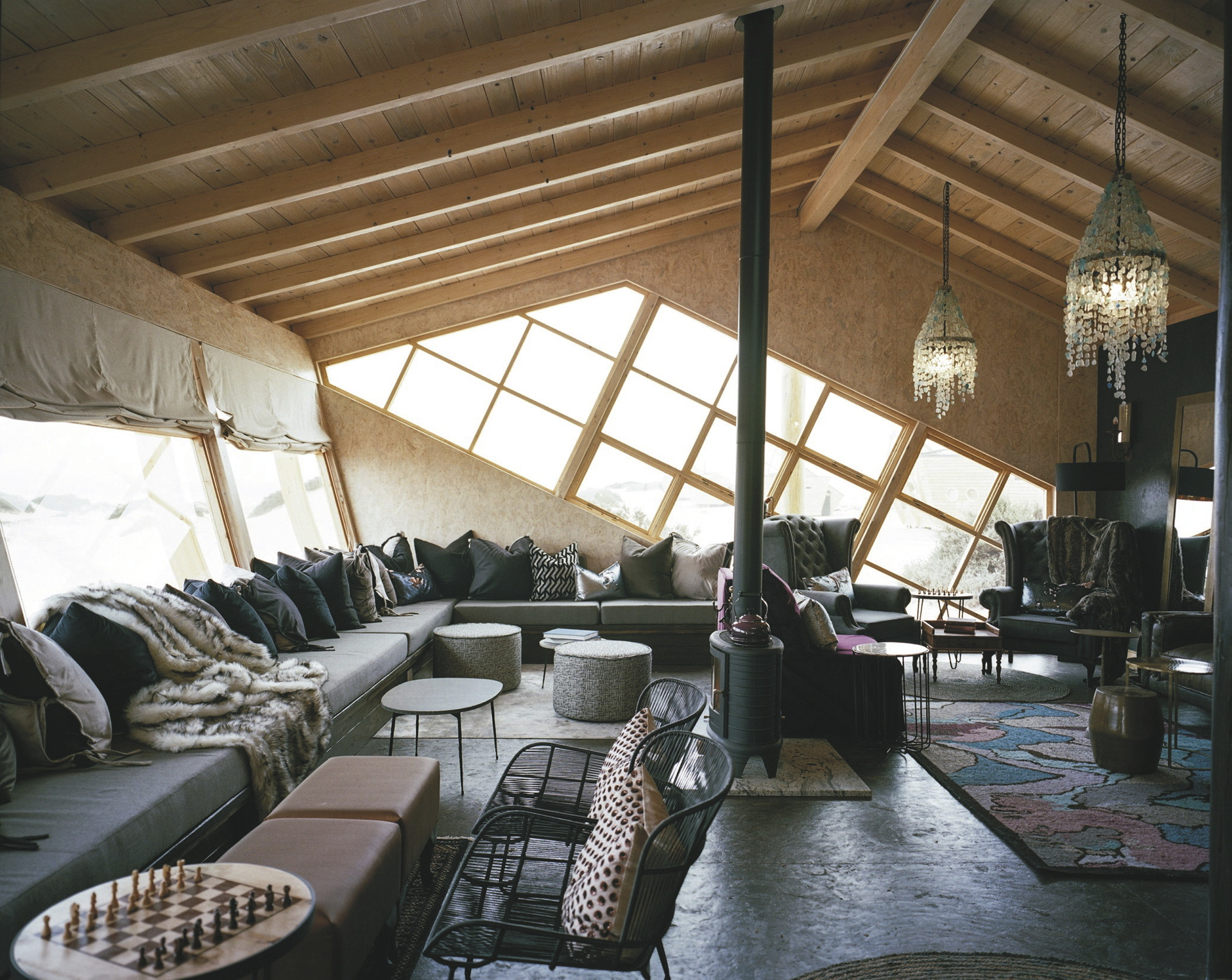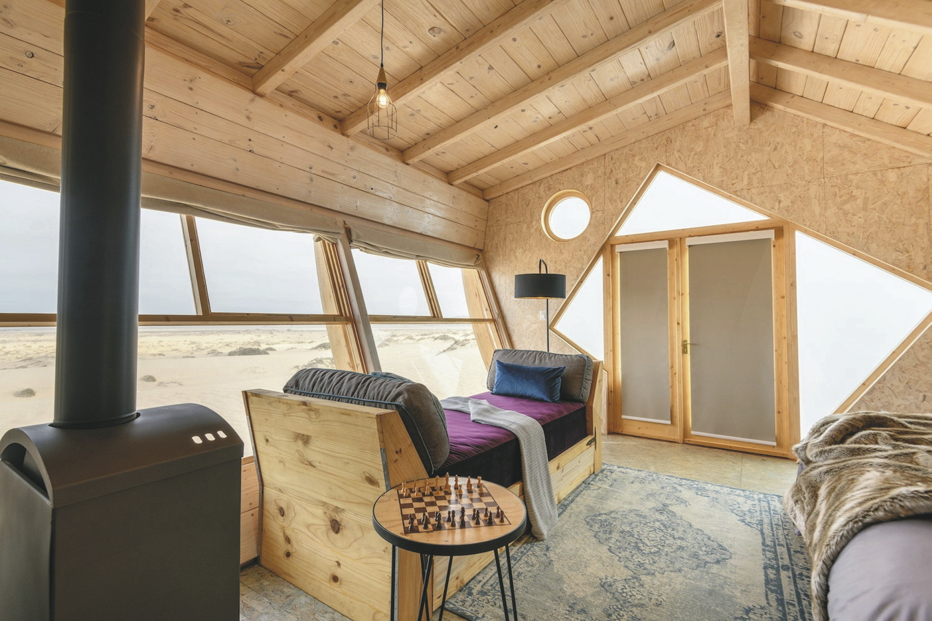 Neben dem Hauptgebäude reihen sich 10 freistehende Chalets, die ebenfalls einem Schiffswrack nachempfunden sind, auf dem Dünengürtel auf. Holz und warme Farben dominieren die Einrichtung, Eleganz und Komfort inmitten der rauen Umgebung stehen klar im Vordergrund. Von der Terrasse oder dem Bett hat man eine fantastische Aussicht auf die Wüste und das Meer. Jedes Chalet verfügt über ein geräumiges Bad sowie über einen Safe und einen Kamin, der an nebeligen Abenden für behagliche Gemütlichkeit sorgt. Heißes Wasser für den Tee-/Kaffeezubereiter können Sie jederzeit vom Personal bekommen. Für Familien gibt es 2 geräumige Chalets für 4 Personen. Holzstege und Sandwege verbinden die Chalets mit dem Hauptgebäude.