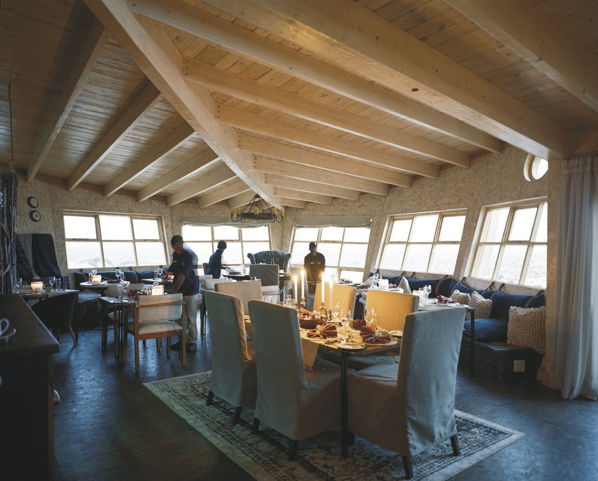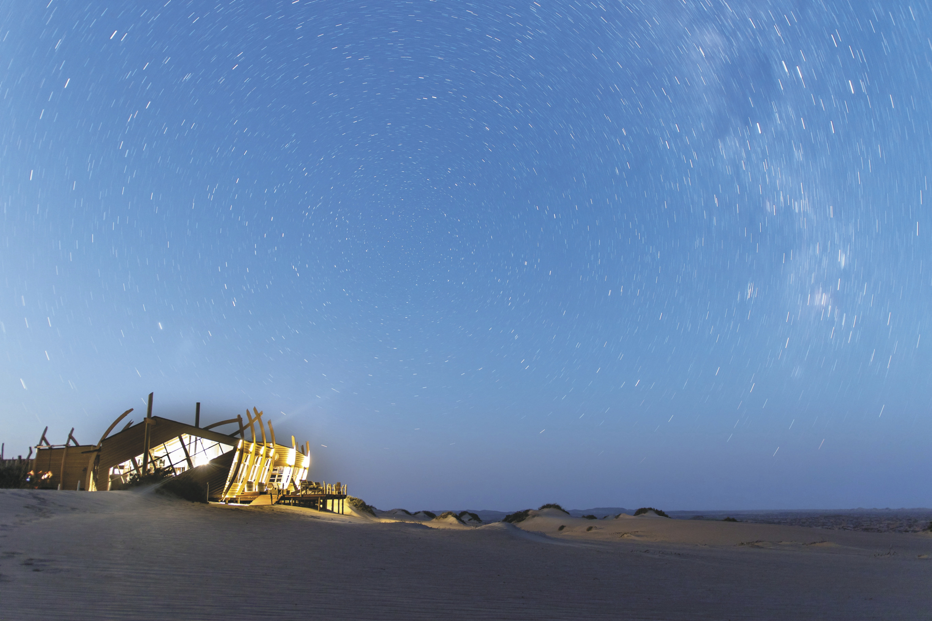 Die einzigartige Konstruktion der Lodge und der Zimmer ähneln den gestrandeten Schiffen, die an den Ufern und in den Gewässern dieser Küste zu finden sind. Zerbrochene Spiere ragen in den Himmel, und die Holzkonstruktionen scheinen im immer tiefer werdenden Sand der Wüste zu liegen. Im Haupthaus finden Sie einen kombinierten Lounge-, Bar- und Essbereich, ausgestattet in einer exquisiten Mischung aus warmen Hölzern, handgefertigten Möbeln und klassischen Details, die von lokalen Designern und Künstlern entworfen wurden, mit kräftigen Farben abgerundet. Hier trifft man sich zum Austausch mit anderen Gästen, genießt den traumhaften Blick durch die große Fensterfront und nimmt am Abend einen guten Tropfen vor dem knisternden Kaminfeuer. Die Terrasse ist der perfekte Ort, um sich zurückzulehnen und zu beobachten wie die untergehende Sonne im Atlantik versinkt. Mit etwas Glück läuft auch ein tierischer Bewohner durch die Kulisse. Neben Wüstenelefanten leben hier auch die an die Wüste angepassten Löwen, braune Hyänen, Schakale, Oryx-Antilopen und eine Vielzahl kleinerer Wildtiere, die gelernt haben in dieser trostlosen Umgebung zu überleben. Eingeschlossene Aktivitäten: Fahrt zum Sonnenuntergang, Quad Bike Tour, Sandboarden, Tagesausflug Skelettküste oder ins Tal des Harusib Rivers, Strand-Picknick.