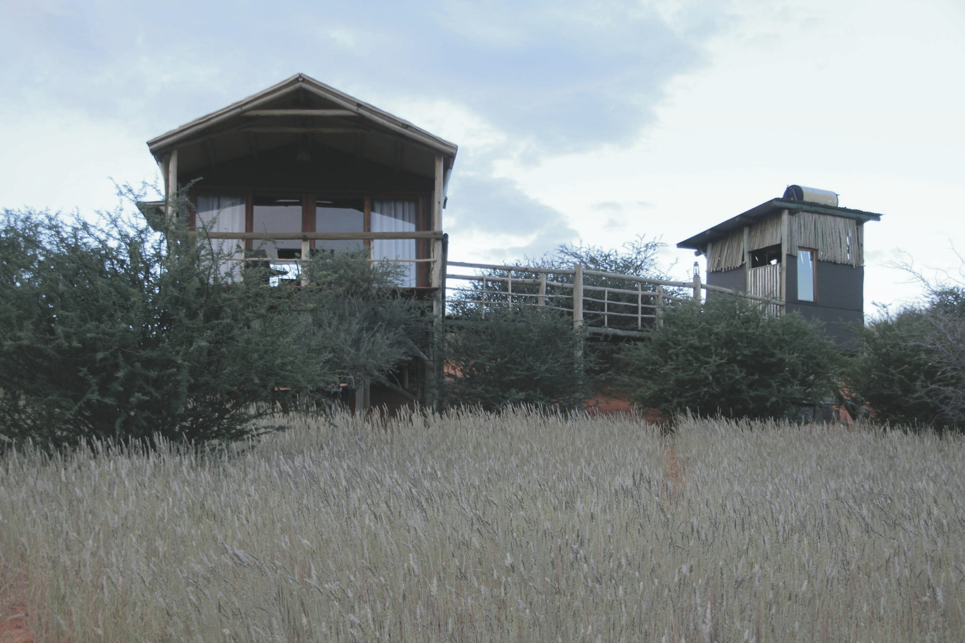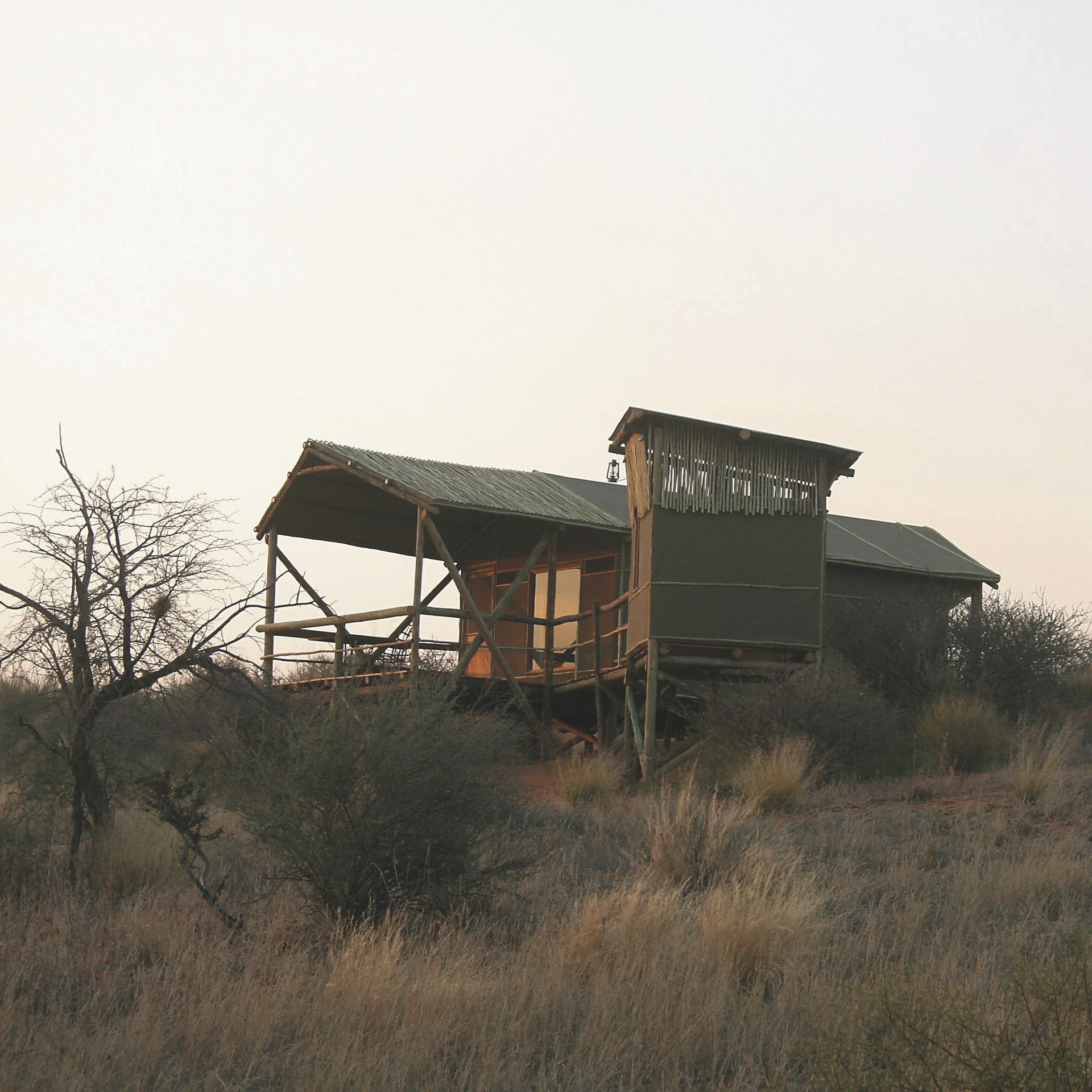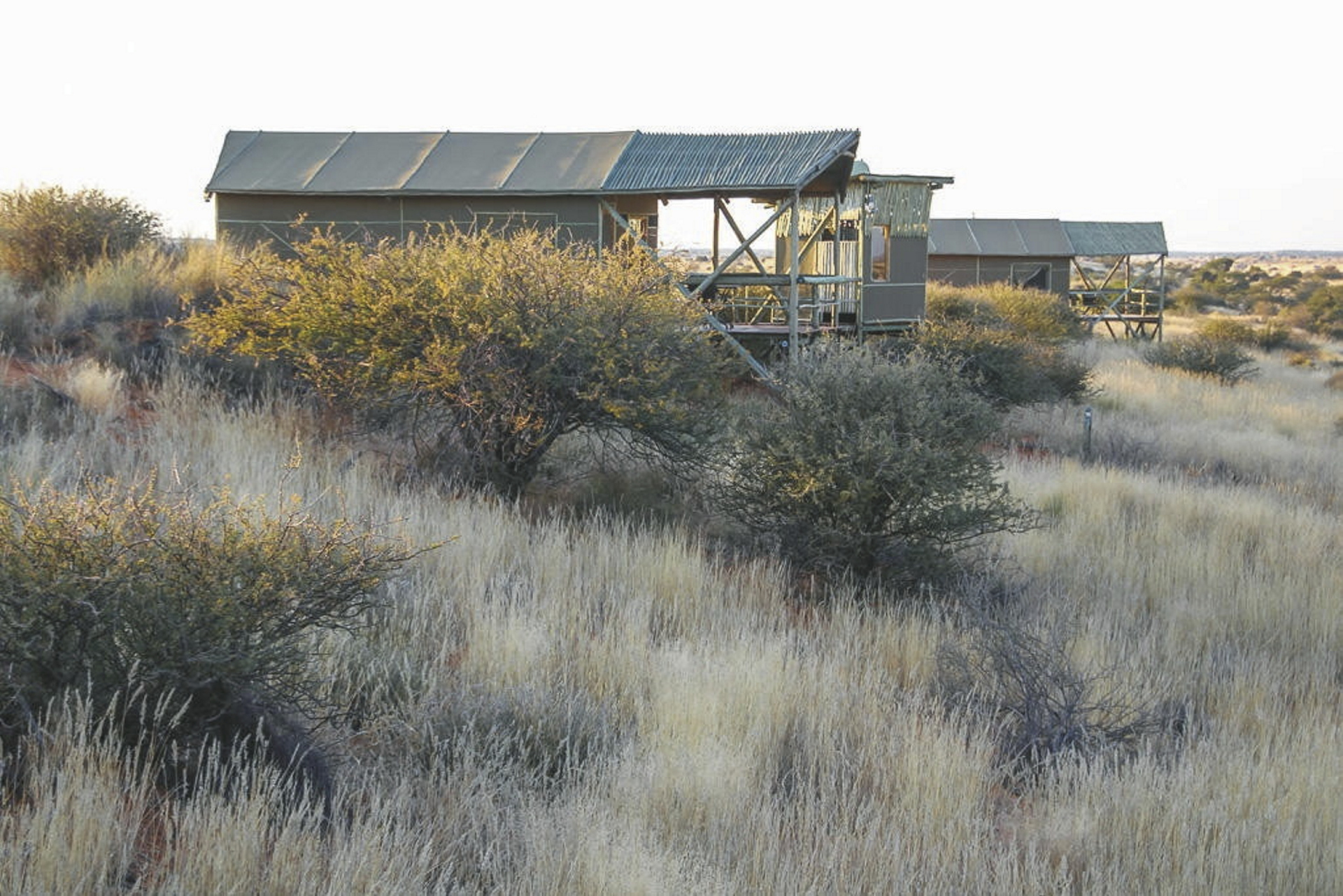 Die 6 urigen Zelthäuser sind auf Stelzen erbaut und liegen etwa 3 km vom Haupthaus entfernt auf einer der erste Kalahari Dünen mit tollem Rundumblick in die Kalaharilandschaft. Das Badezimmer ist nur wenige Schritte über einen kurzen Steg entfernt. Alle Zelte sind ausgestattet mit eigenem Bad, Kühlschrank, Moskitonetz, Tee-/Kaffeezubereiter, Ventilator und einer überdachten Terrasse.