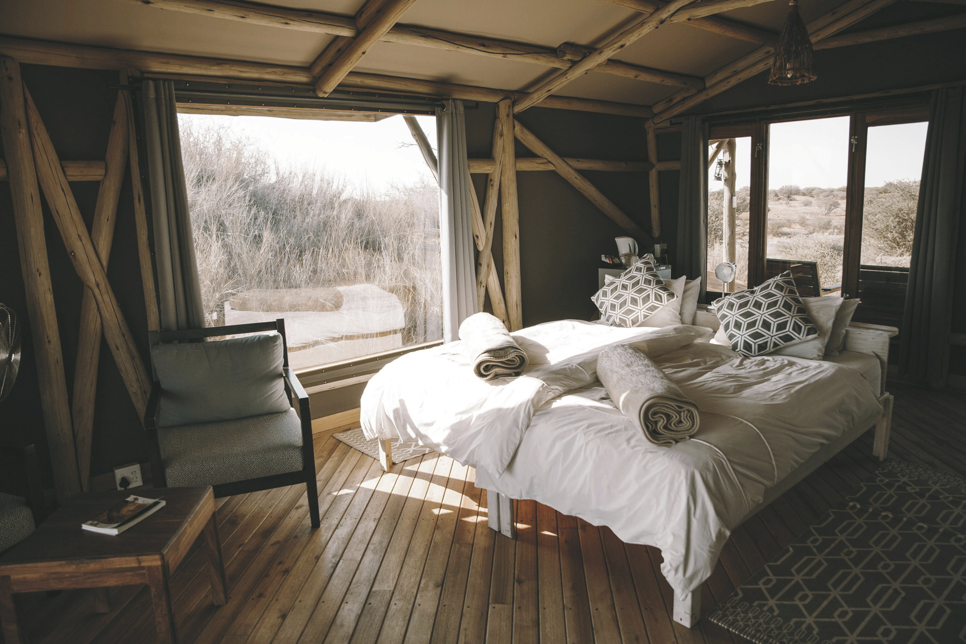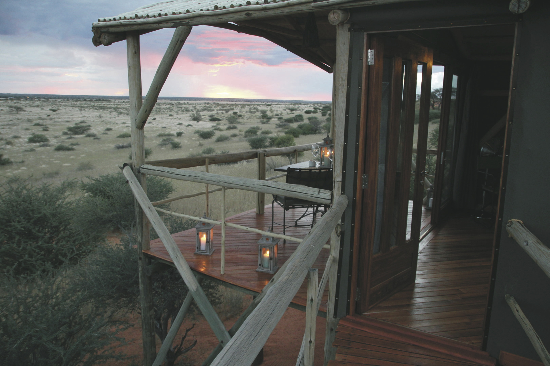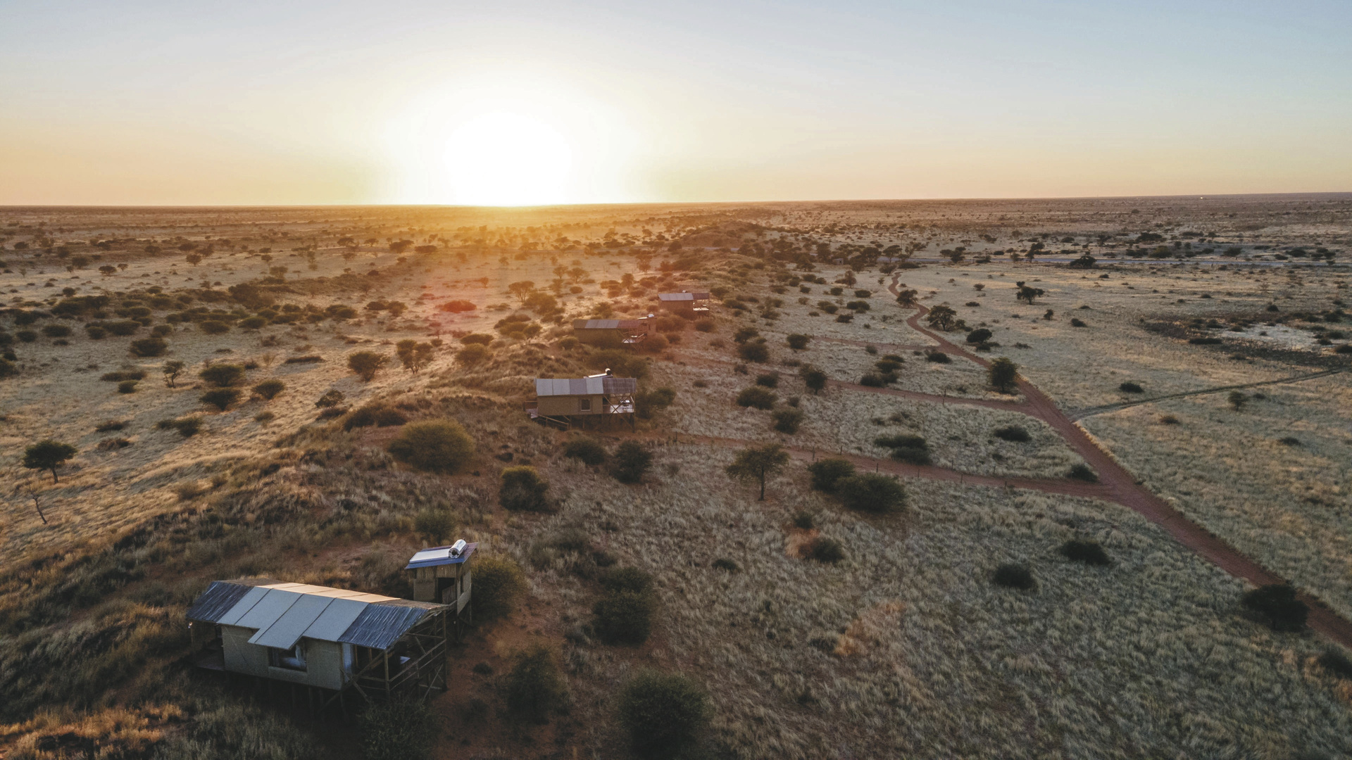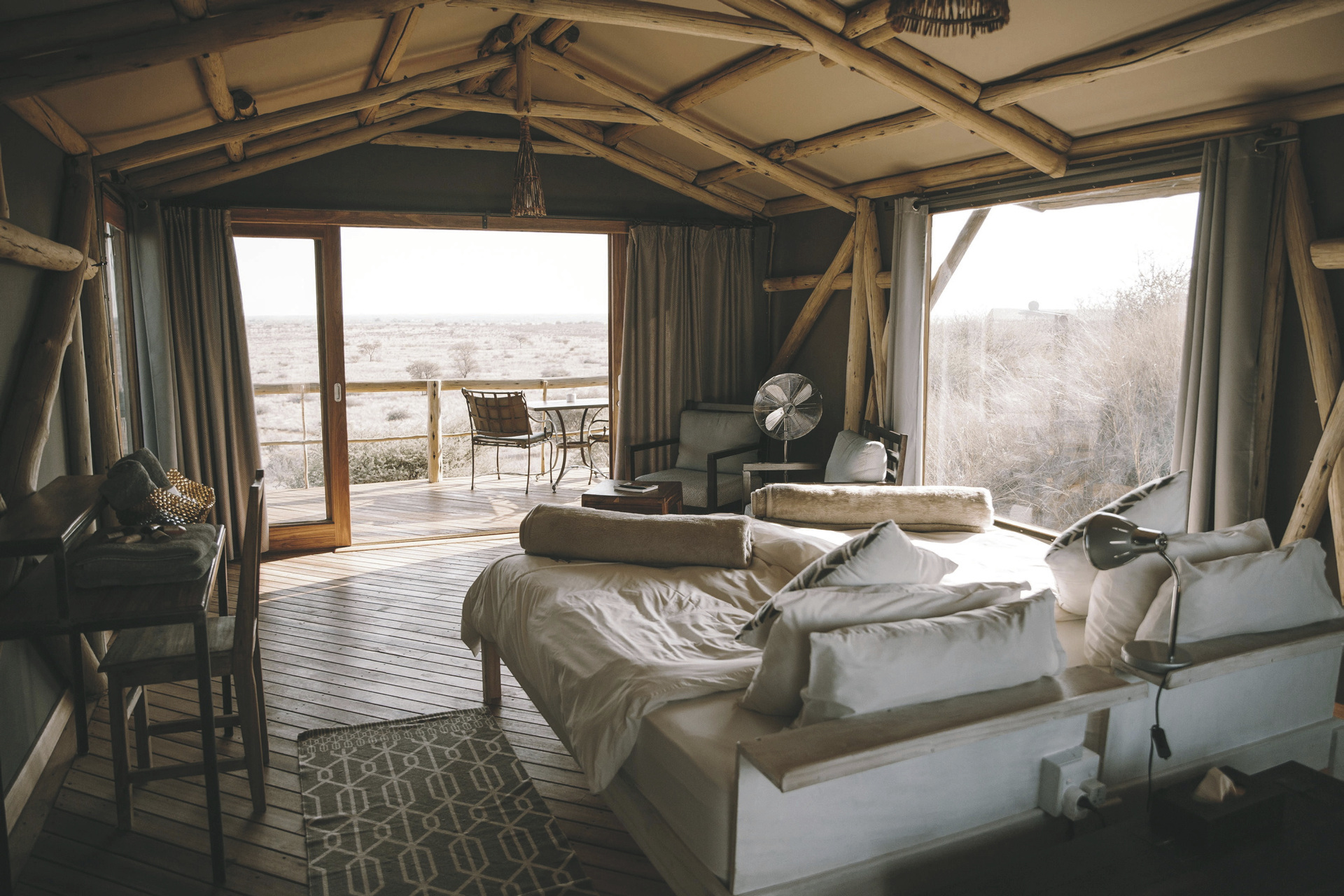 Die 6 urigen Zelthäuser sind auf Stelzen erbaut und liegen etwa 3 km vom Haupthaus entfernt auf einer der erste Kalahari Dünen mit tollem Rundumblick in die Kalaharilandschaft. Das Badezimmer ist nur wenige Schritte über einen kurzen Steg entfernt. Alle Zelte sind ausgestattet mit eigenem Bad, Kühlschrank, Moskitonetz, Tee-/Kaffeezubereiter, Ventilator und einer überdachten Terrasse.