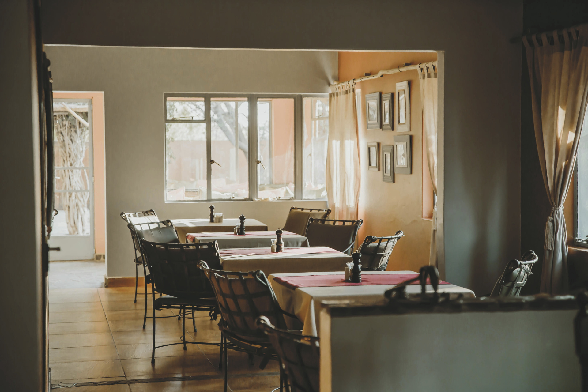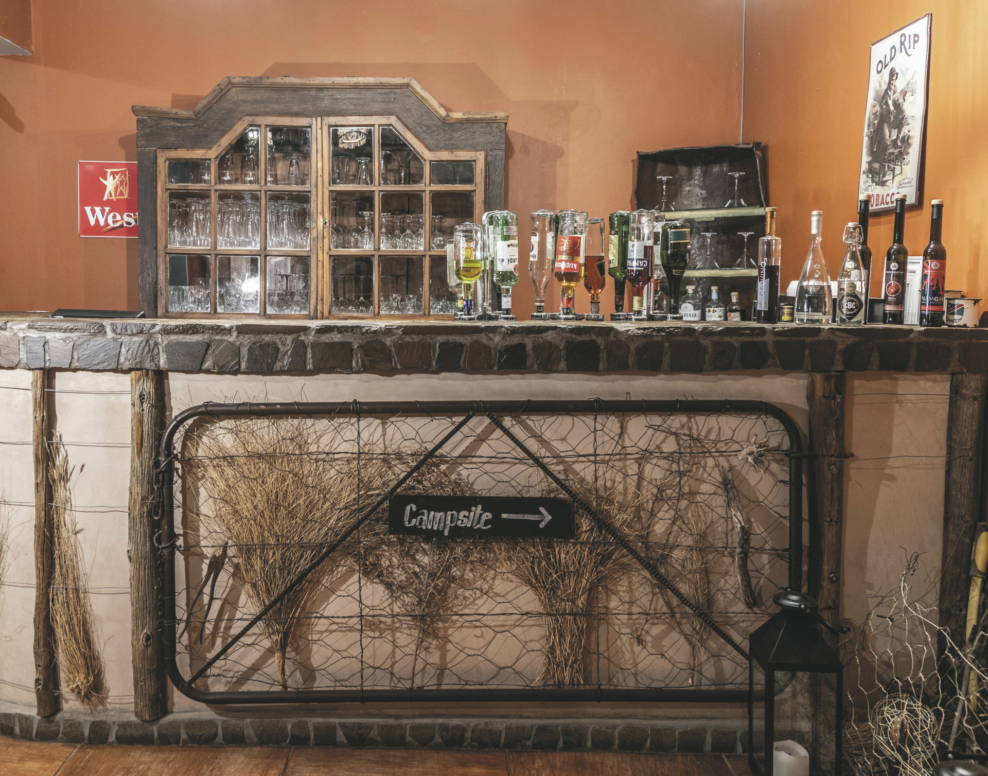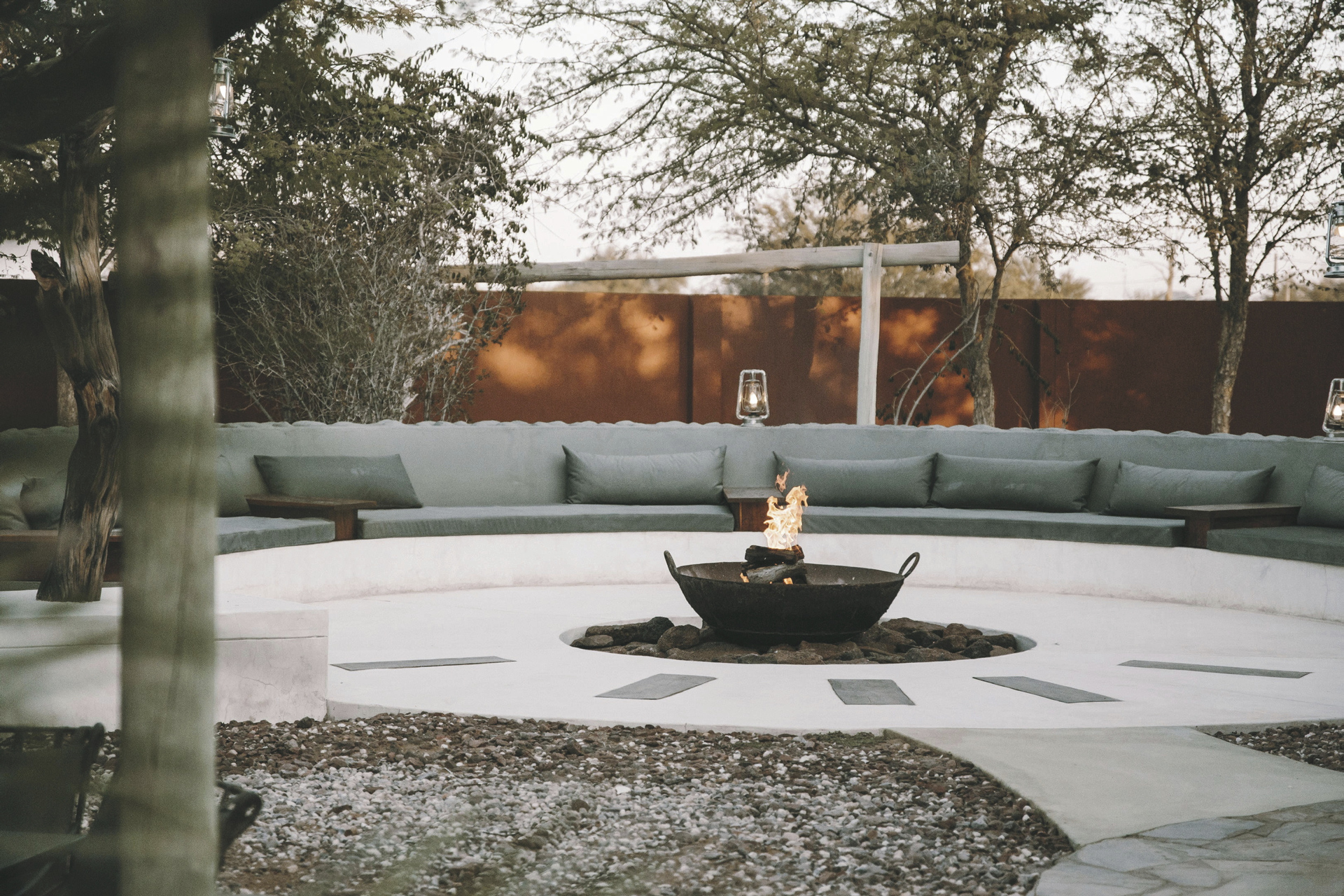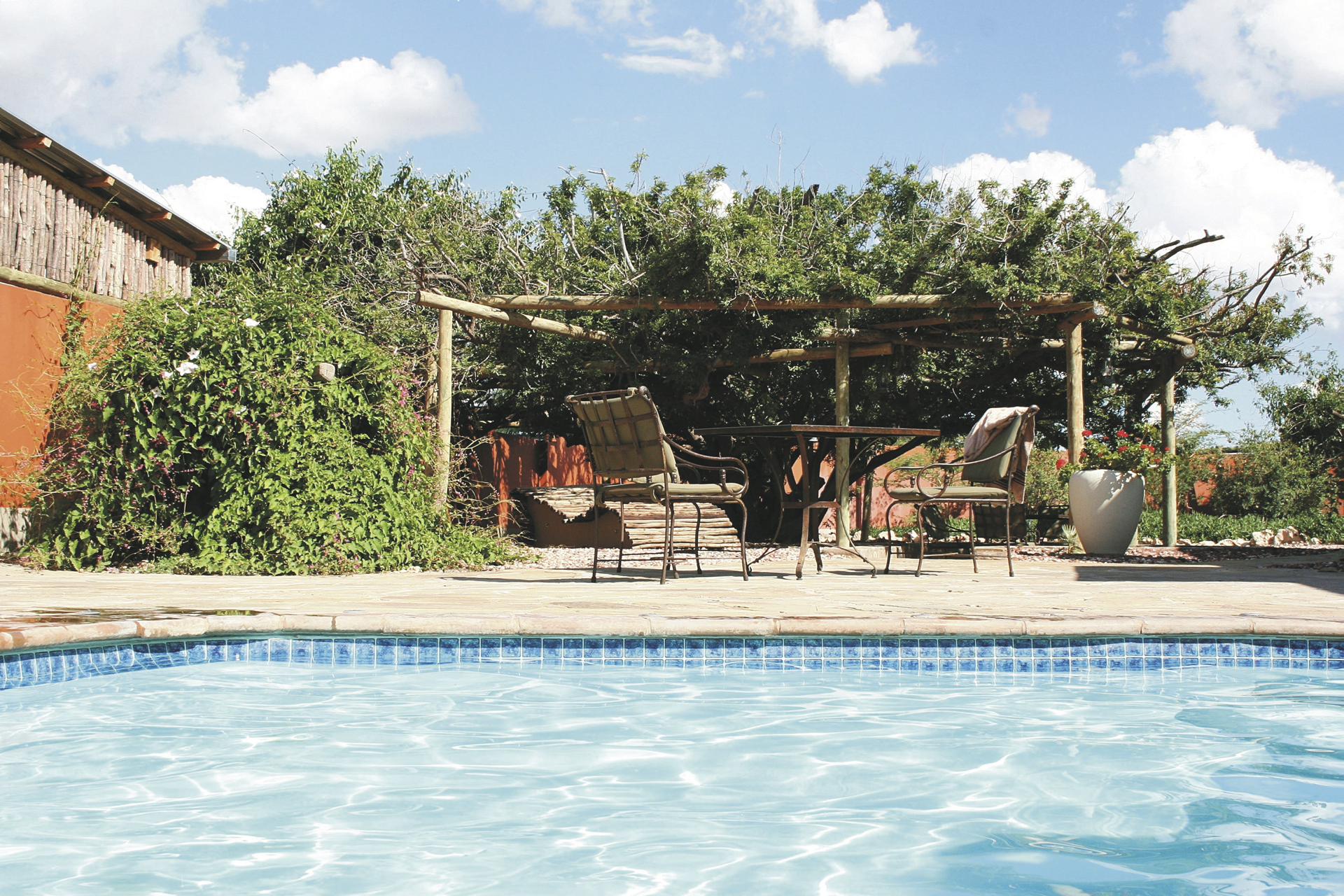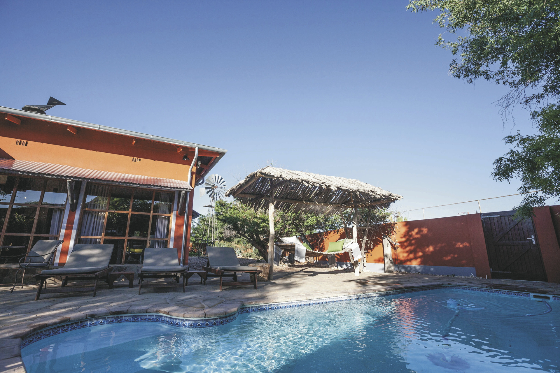 Im gemütlichen, alten Farmhaus befinden sich die Rezeption, eine Lounge mit Kamin und kostenlosem WLAN und das Restaurant. Entspannen können Sie im Pool oder auf der Sonnenterrasse und am Abend lockt die Feuerstelle zum gemütlichen Beisammensein. Optionale Aktivitäten: markierte Wanderwege; ab der Schwesterlodge Kalahari Red Dunes Lodge (10 km, 30 Fahrminuten): Mountainbike Verleih, geführte Wanderungen, Pirsch-/Panoramafahrten.
