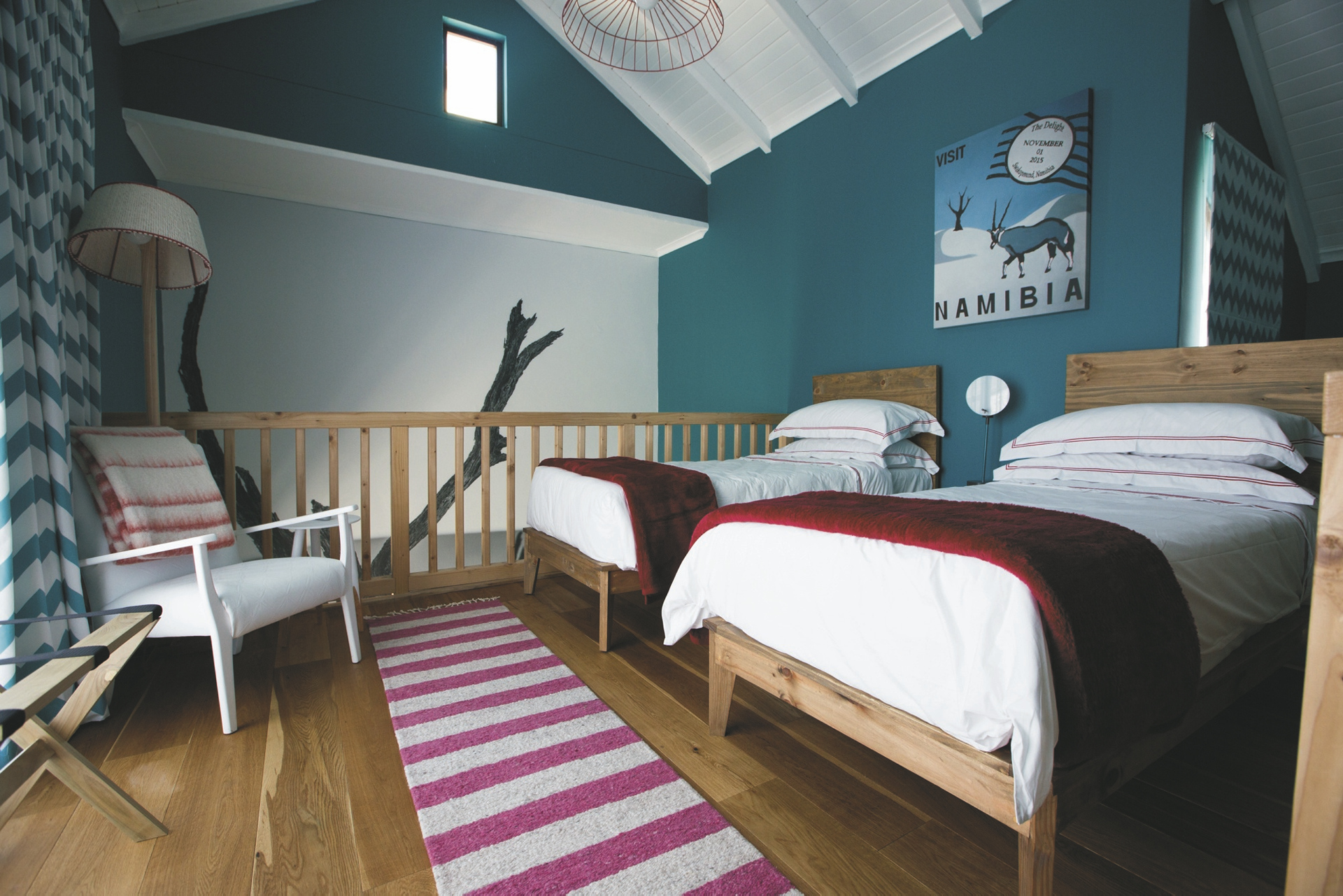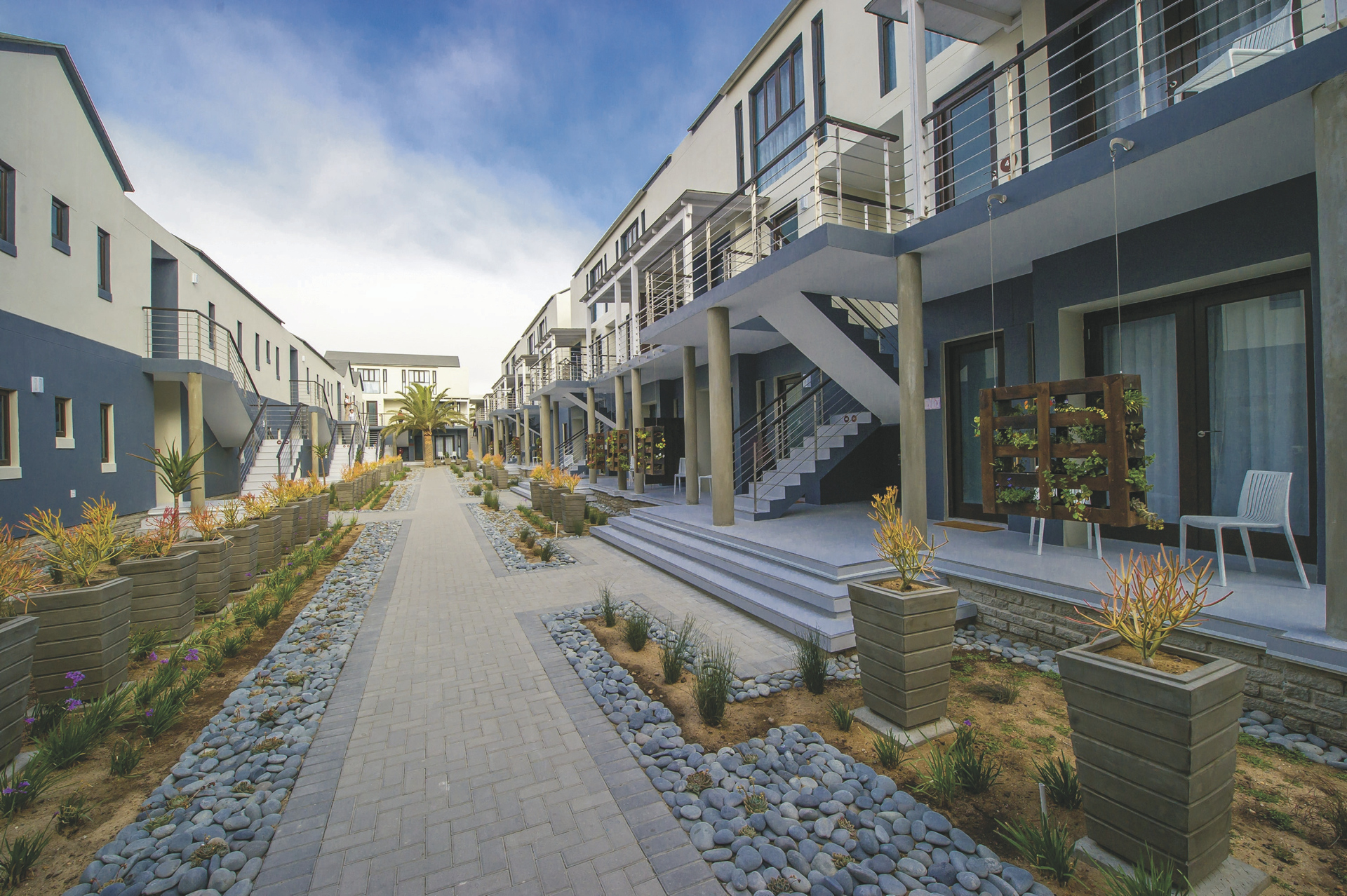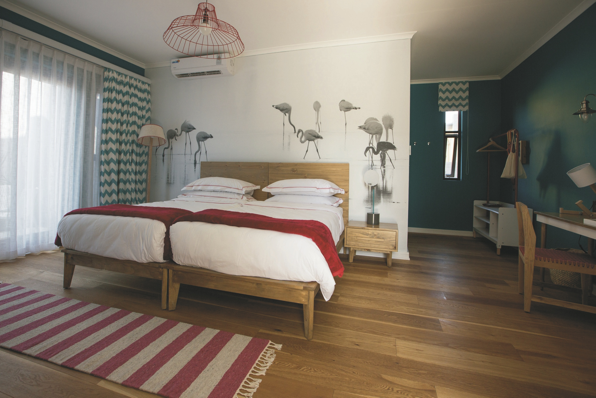Die 54 einladend gestalteten Zimmer sind auf ein hufeisenförmiges, zweistöckiges Gebäude verteilt, das einen ansprechenden Garten umschließt. Sie sind in kräftigen Farben gehalten und haben eine hübsche Wanddekoration mit namibischen Motiven. Jedes mit eigenem, modernem Bad, Klimaanlage/Heizung, Kühlschrank, Safe, Fön, TV sowie Tee-/Kaffeezubereiter, einige Zimmer haben eine Sitzmöglichkeit vor dem Zimmer oder einen kleinen Balkon. Es gibt 10 doppelstöckige Familienzimmer mit 2 Betten auf der offenen Galerie.
