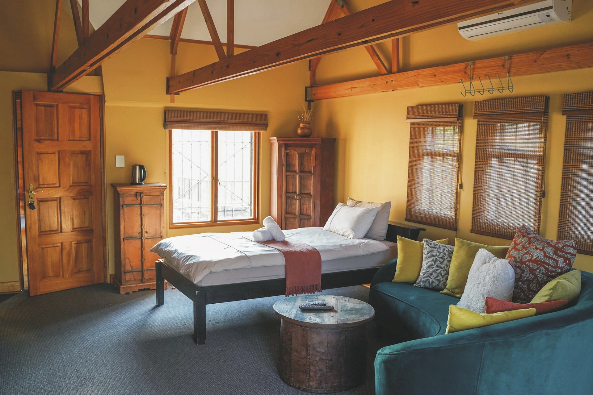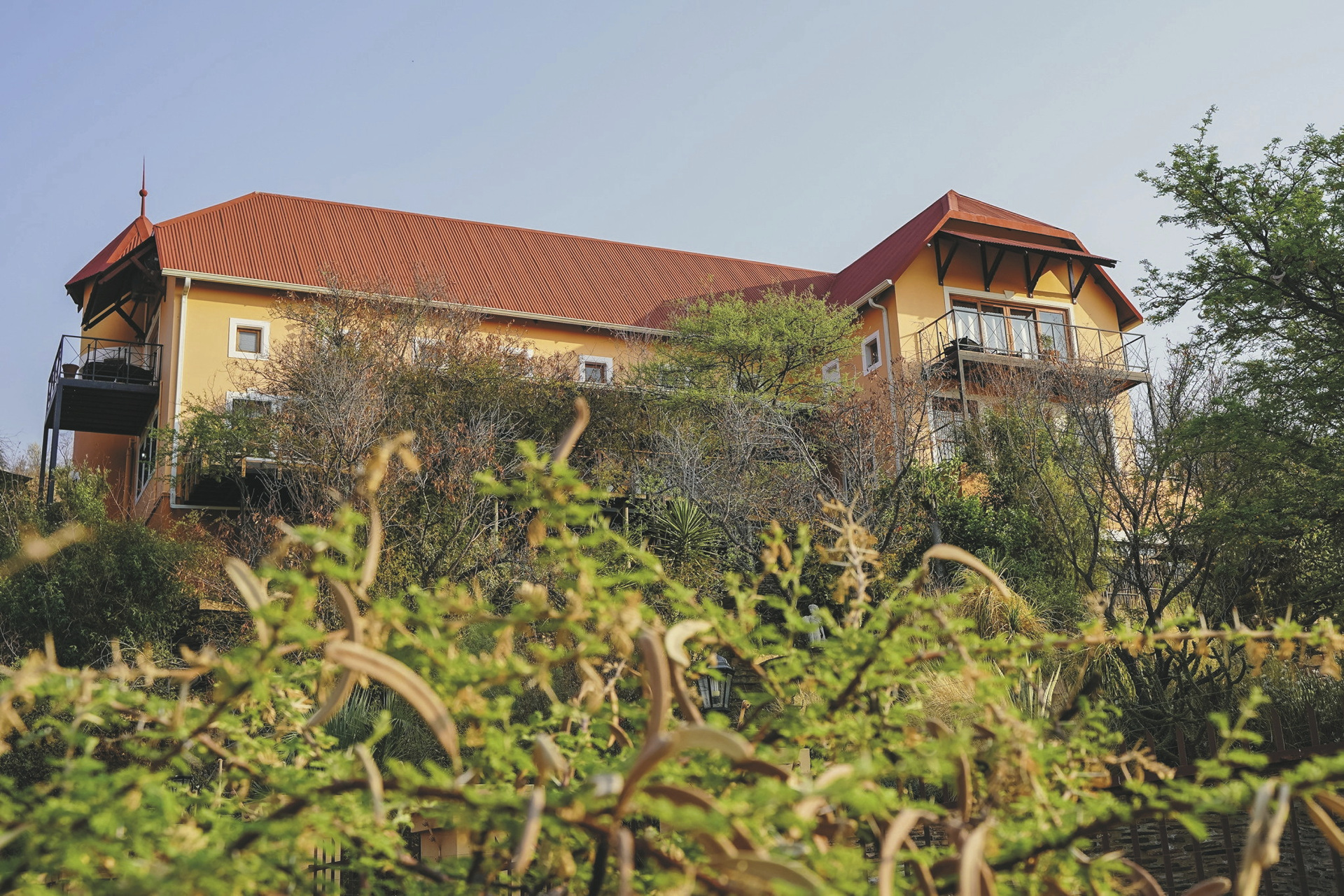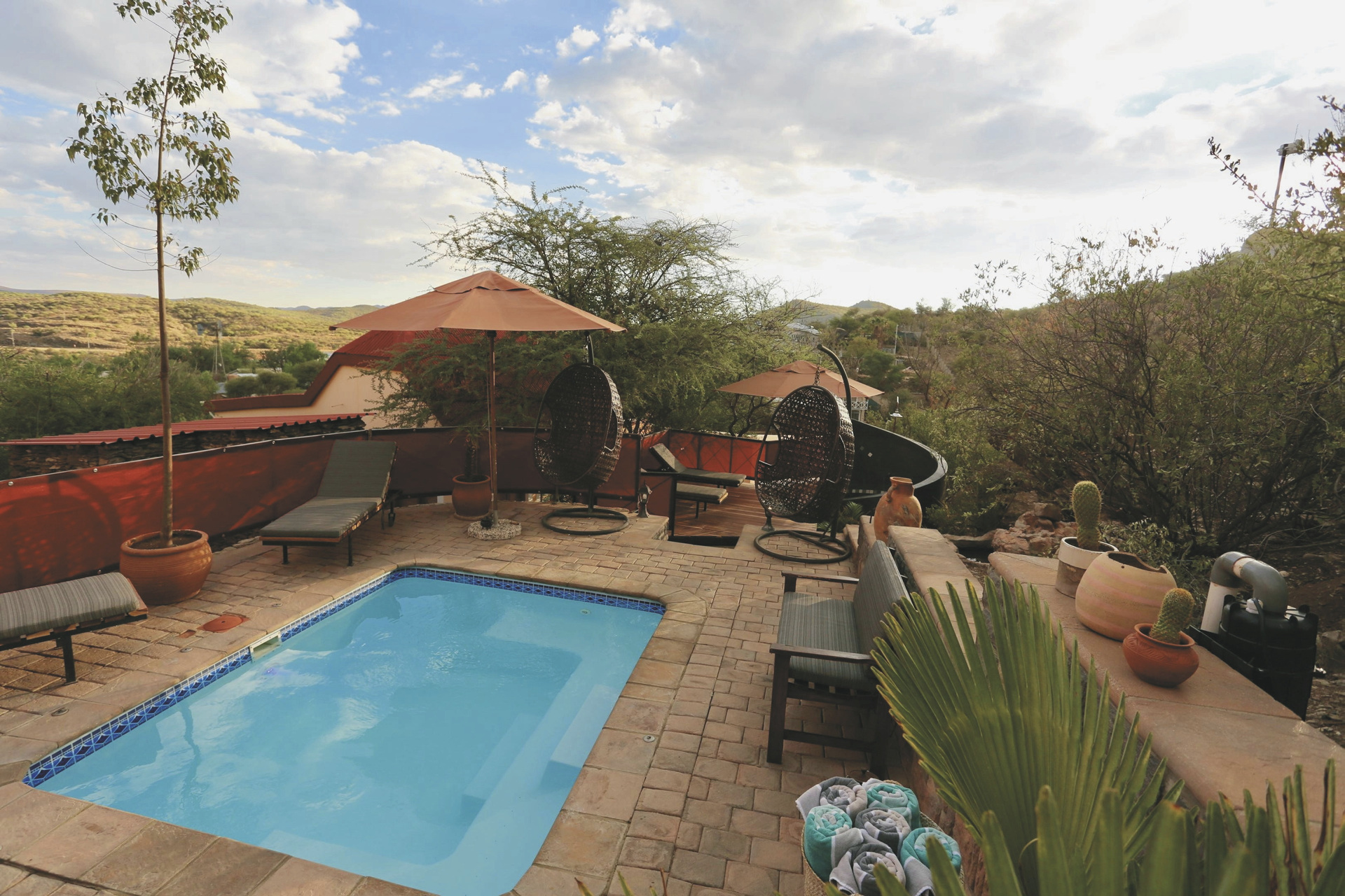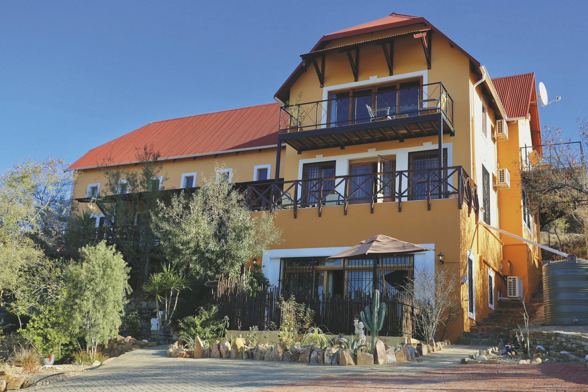 Das gemütliche Gästehaus ist modern und etwas afrikanisch eingerichtet, es strahlt eine entspannte Atmosphäre und Geborgenheit aus. Die Liebe zum Detail lässt den Gast mit offenen Augen durch das Haus und den Garten schlendern, um zu sehen, was es zu entdecken gibt. Im Garten finden sich zahlreiche Skulpturen, hier hängt ein altes Telefon, dort steht eine Kamera, die ebenfalls reif fürs Museum ist. Lassen Sie sich überraschen. Der Tag beginnt mit einem guten Frühstück entweder auf der Terrasse oder im lichtdurchfluteten Frühstücksraum. Die gemütliche Lounge ist zu jeder Jahreszeit ein geselliger Treffpunkt. Im Winter spendet ein Kamin behagliche Wärme, an lauen Sommerabende sitzt man eher auf der Terrasse. Der üppige Garten lädt mit vielen Sitzmöglichkeiten zum Verweilen ein, ein kleiner Pool dient der Erfrischung nach einem ereignisreichen Tag in Namibias Hautstadt. Auf dem Gelände gibt es sichere Parkplätze für Ihren Mietwagen.