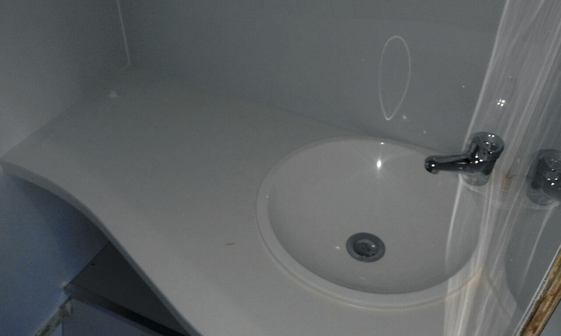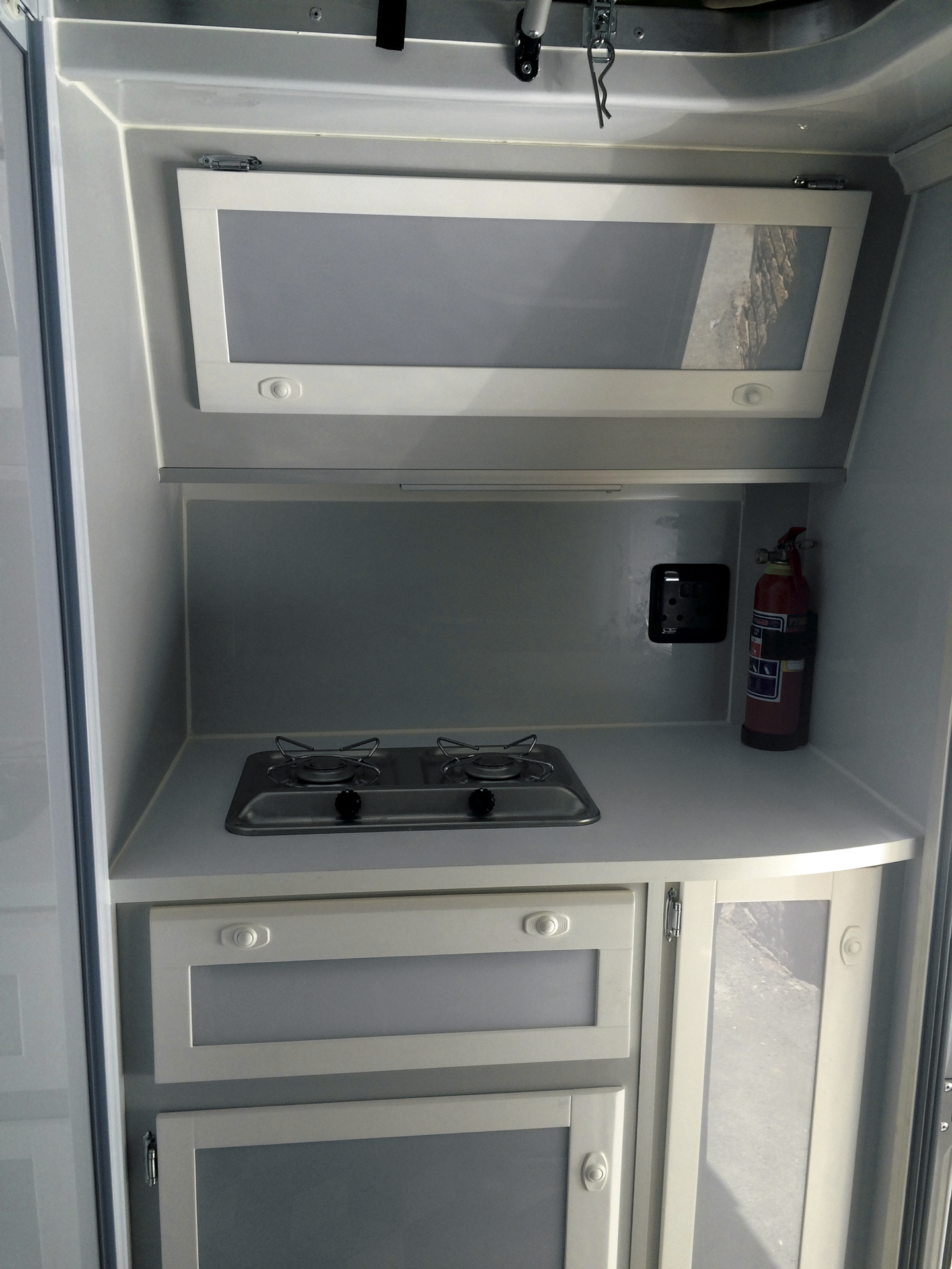 • Wohnkabine mit seitlichem Zugang, aufklappbarem Dach, Sitzgruppe mit Esstisch, Toilettenraum mit Chemie-WC und Außen-Handdusche; zwei 2-flammige Gasherde (innen und außen)