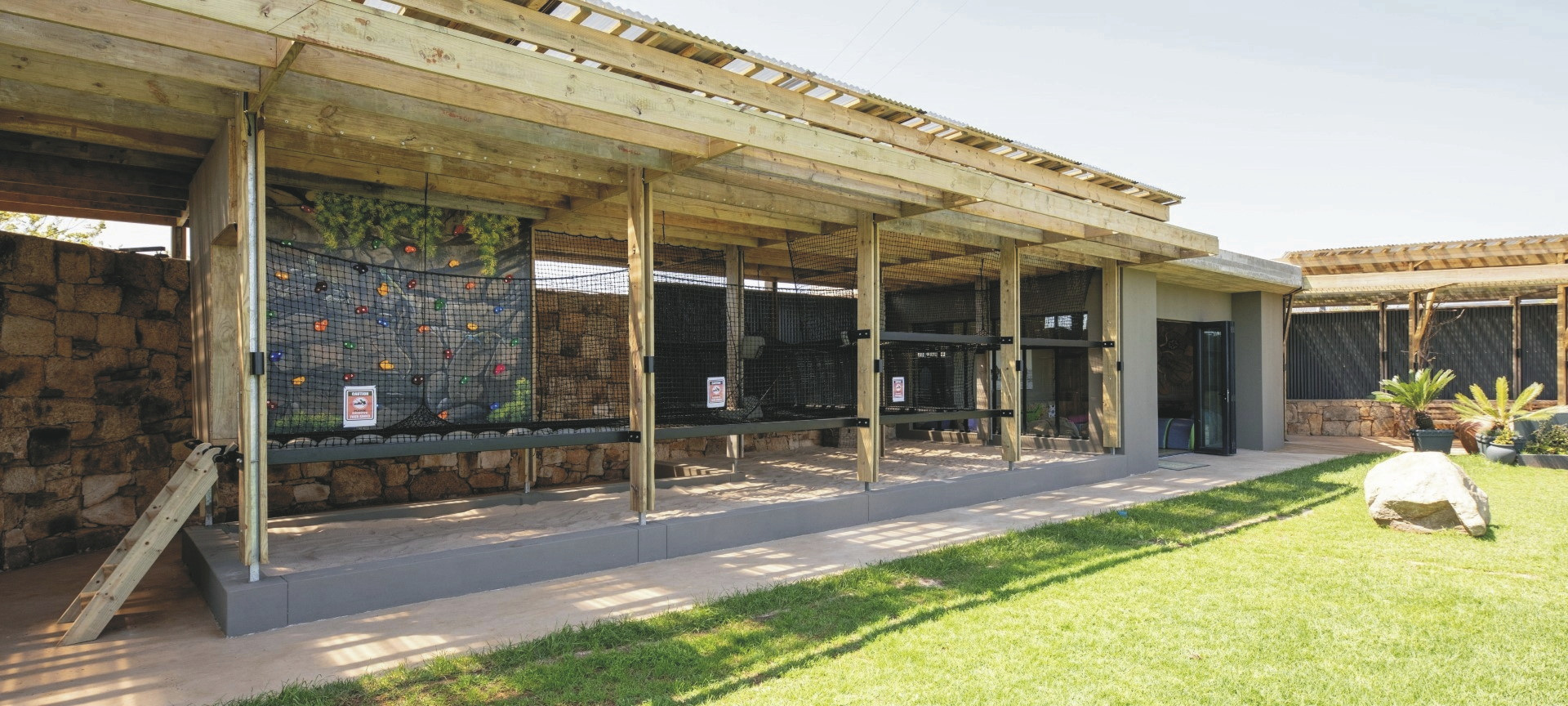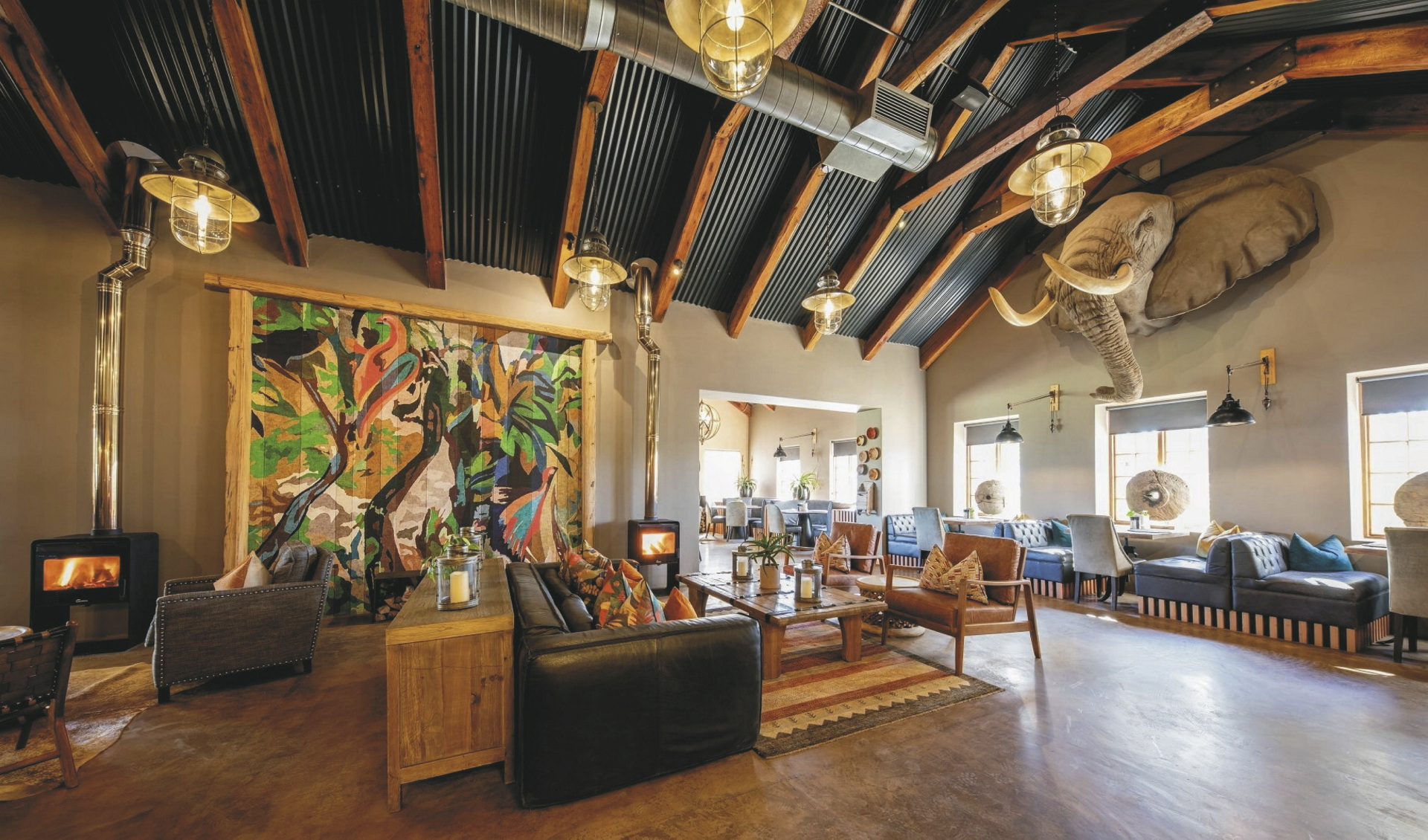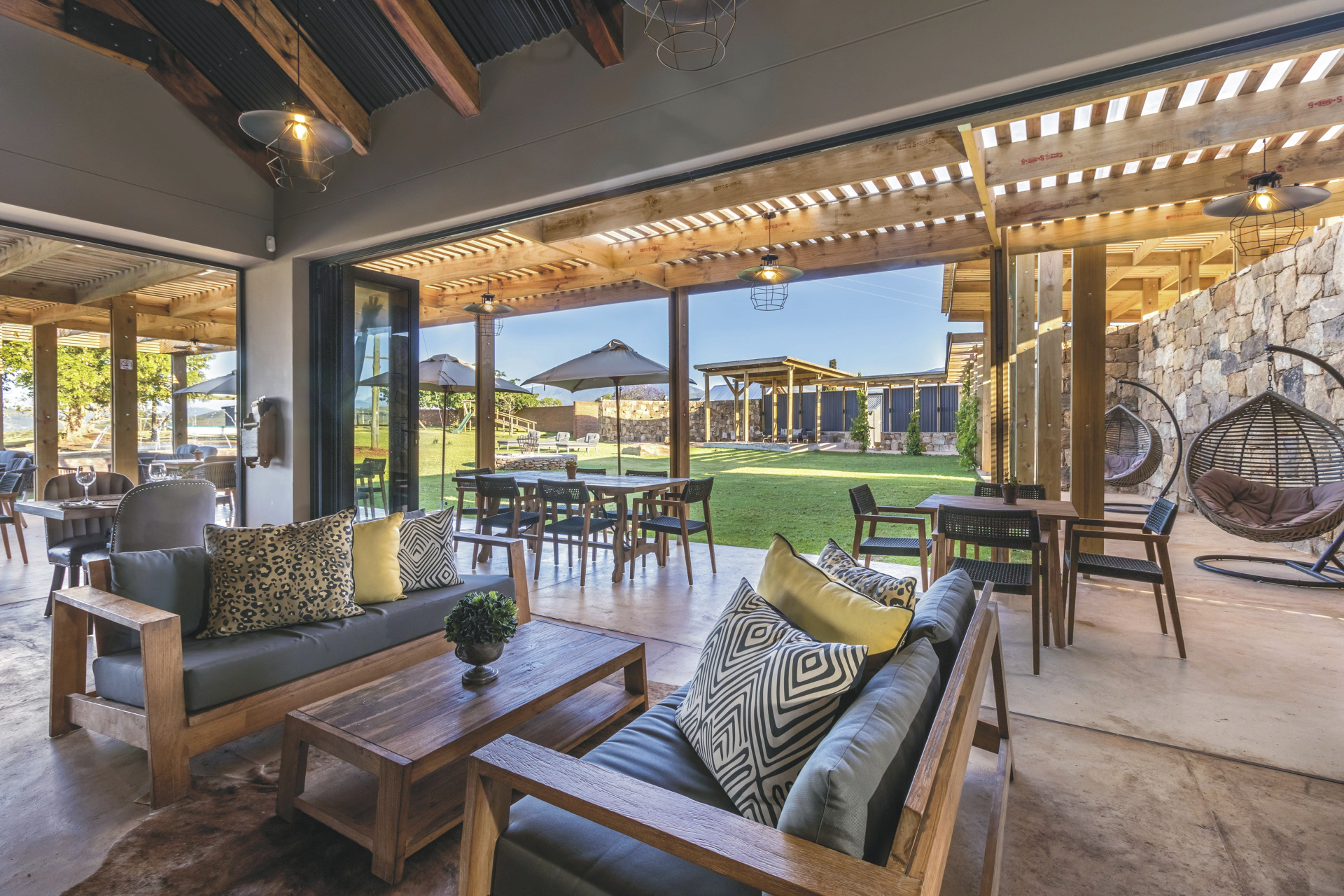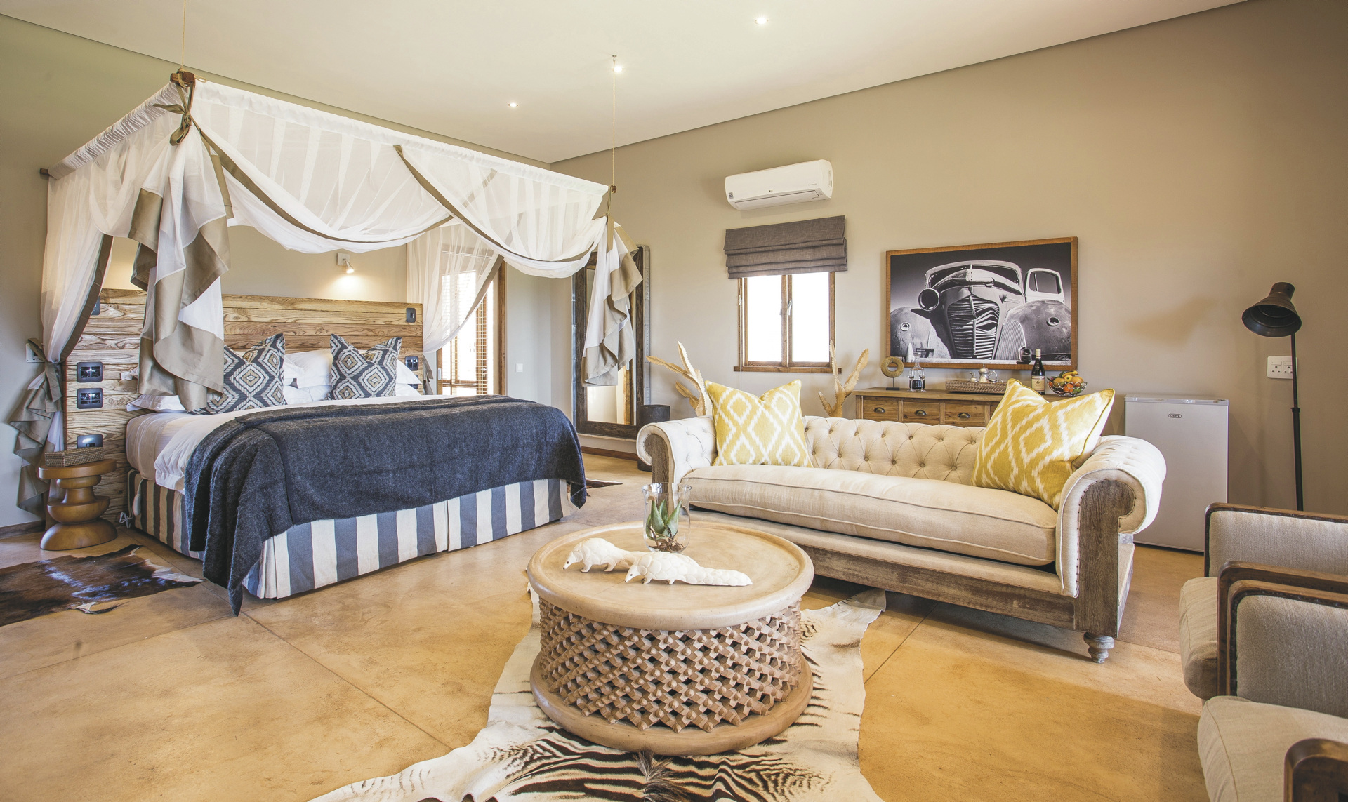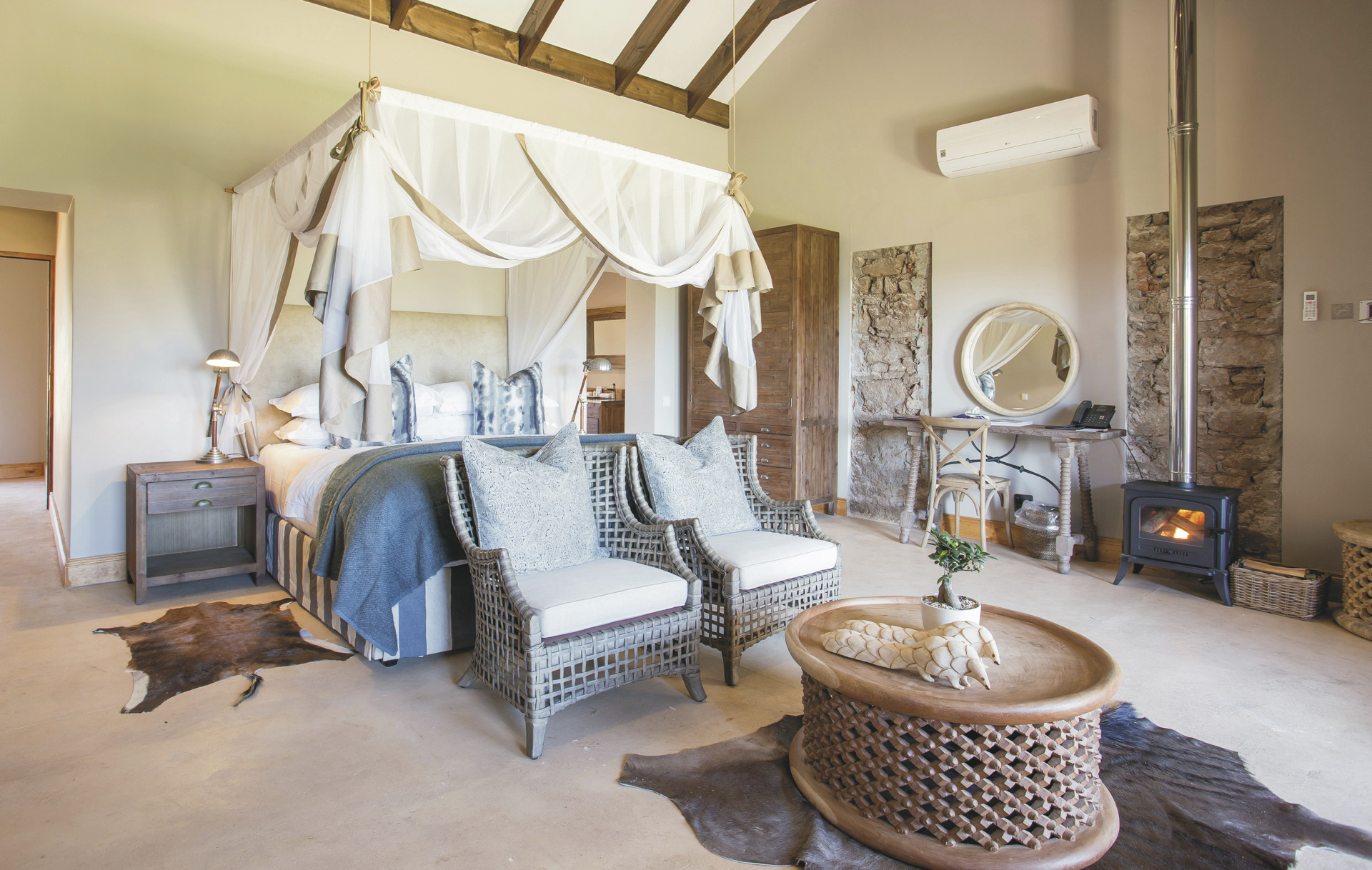 Die 16 Zimmer sind behaglich im modernen afrikanischen Stil eingerichtet und unterscheiden sich in Größe und Ausblick. Jedes hat ein eigenes, offenes Bad, außerdem Moskitonetz, Minibar, Klimaanlage/Heizung, Tee-/Kaffeezubereiter, Fön, Safe, Telefon, WLAN, eine gemütliche Lounge sowie einen Balkon oder eine Terrasse. Zwei Standardzimmer befinden sich im ersten Stock, alle anderen Zimmer sind ebenerdig. Die 3 Familienzimmer verfügt über zwei Schlafzimmer, eine Innen- und einen Außenlounge sowie ein gemeinsames Badezimmer.