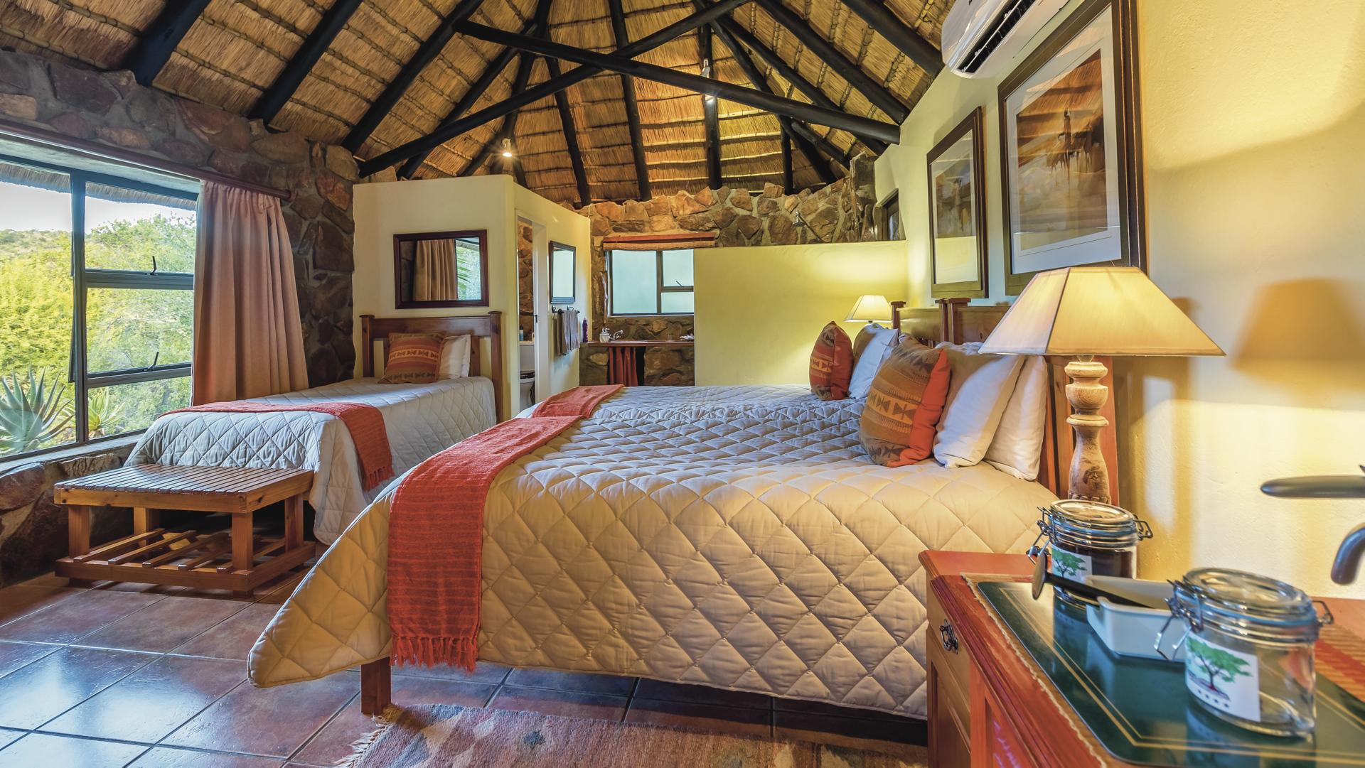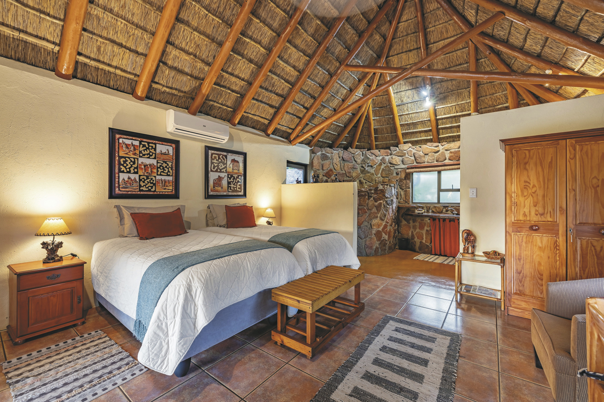 Es gibt 5 großzügige, reetgedeckte Chalets, die mit afrikanischem Dekor ausgestattet sind. Im Badezimmer finden Sie sowohl eine Innen- als auch eine Außendusche vor, nicht alle Badezimmer sind in sich geschlossen. Zu Ihrem Komfort verfügt jedes Chalet über einen Sitzbereich sowie über einen Fön, Tee-/Kaffeezubereiter, Minibar, Safe, Klimaanlage, WLAN und über eine überdachte Terrasse. Für Familien steht ein Chalet mit 2 Schlafzimmern zur Verfügung.