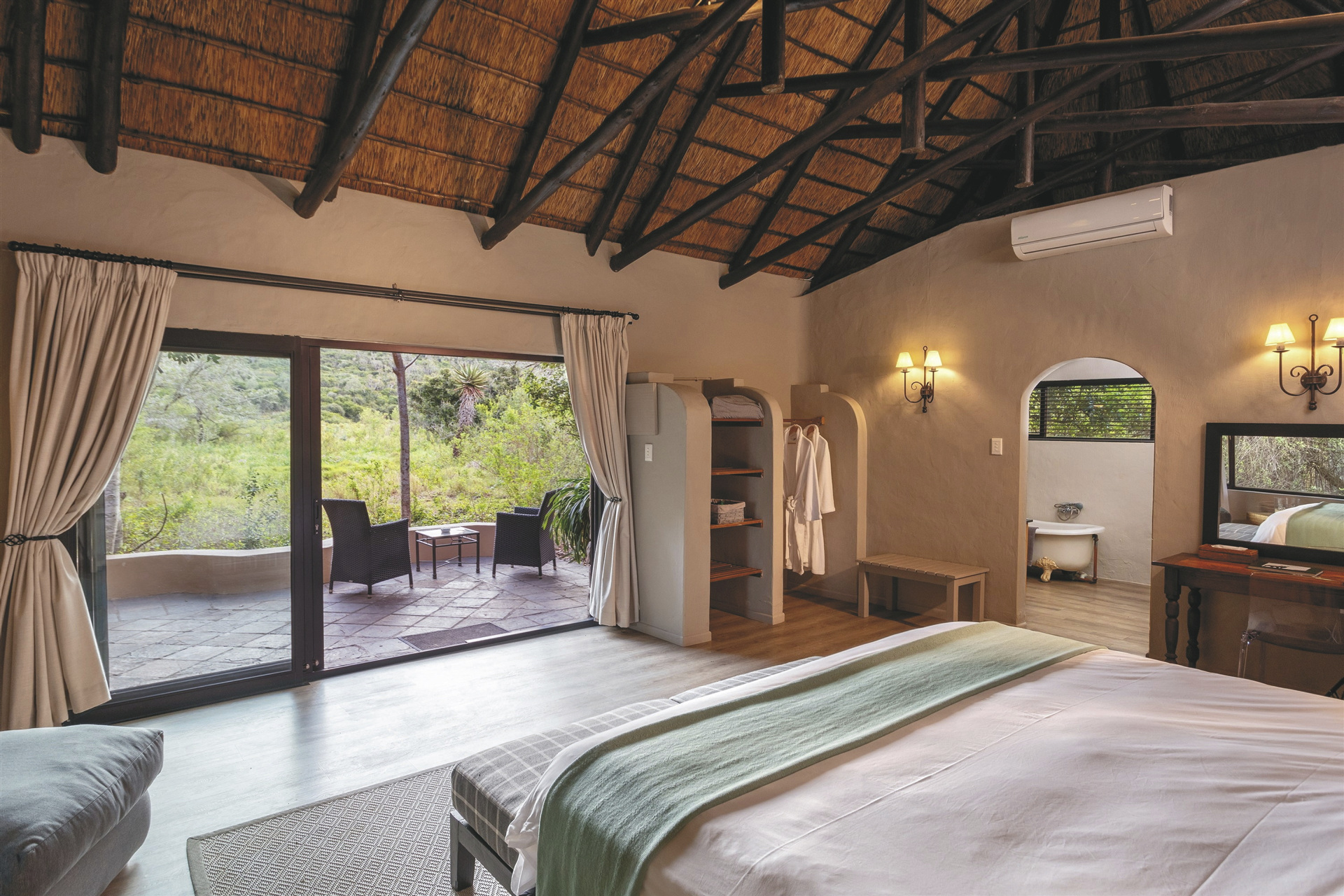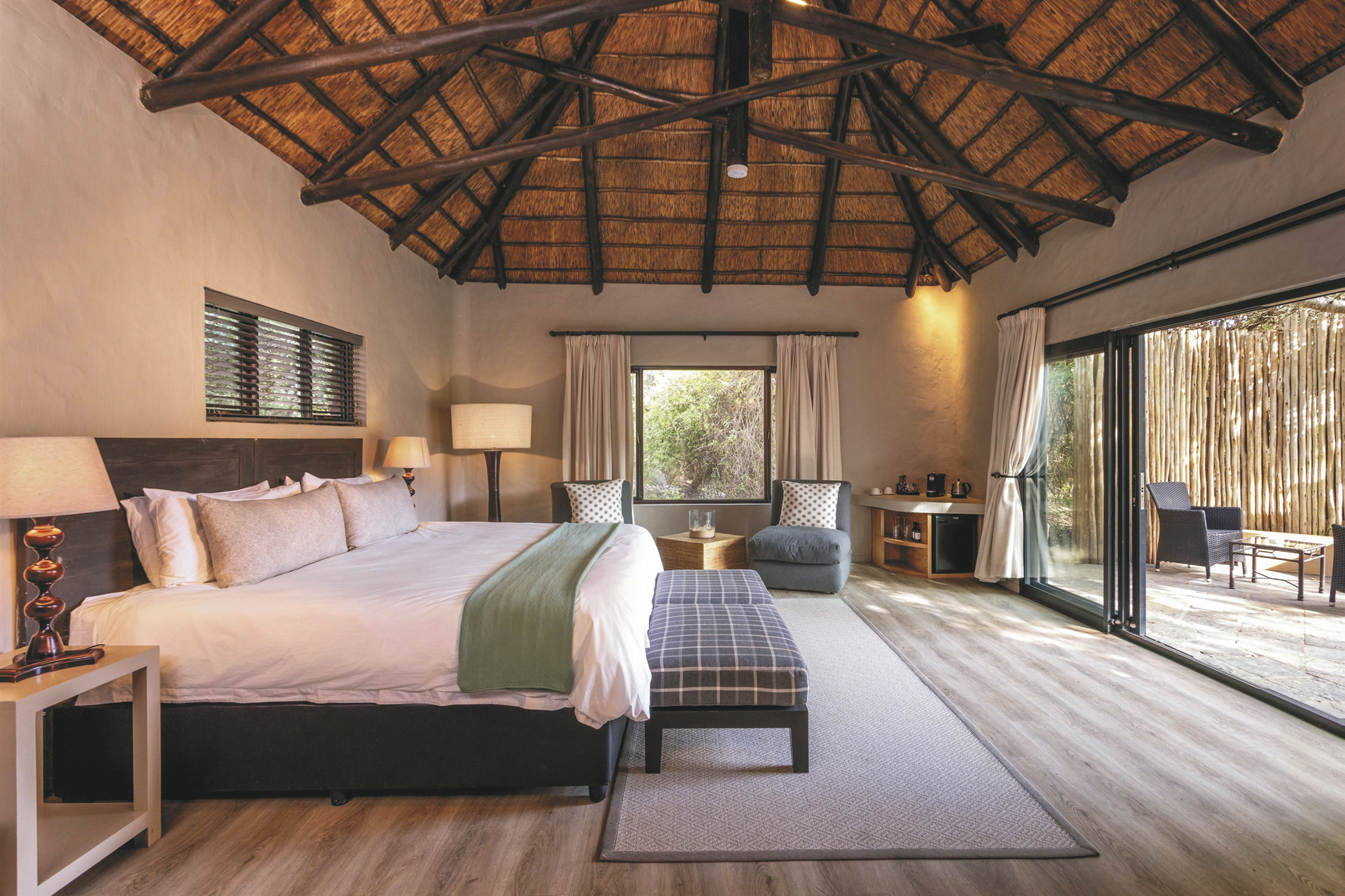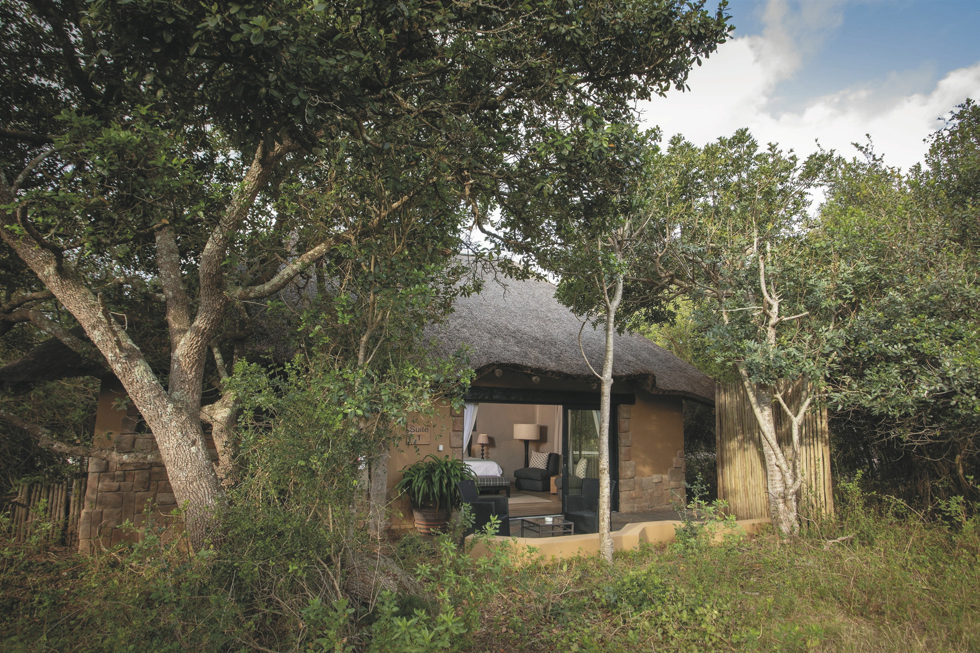 Die 10 geräumig und geschmackvoll ausgestatteten Strohdach-Suiten liegen direkt am Ufer des Bushman’s River und bieten den Gästen himmlische Ruhe und eine grandiose Aussicht. Alle Suiten haben ein modernes Bad; Minibar, Tee-/Kaffeezubereiter, Fön, Telefon, Klimaanlage und Deckenventilator sowie eine gemütliche Aussichtsterrasse mit Blick über den Fluss und die gegenüberliegende Schwemmlandschaft, Tierbeobachtungen sind bereits morgens noch vor dem Aufstehen vom Bett aus möglich. Einen Safe finden Sie an der Rezeption.