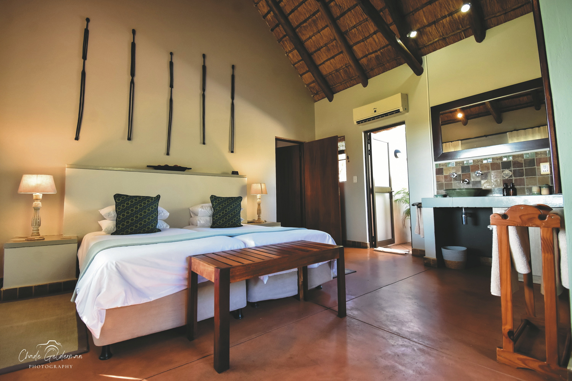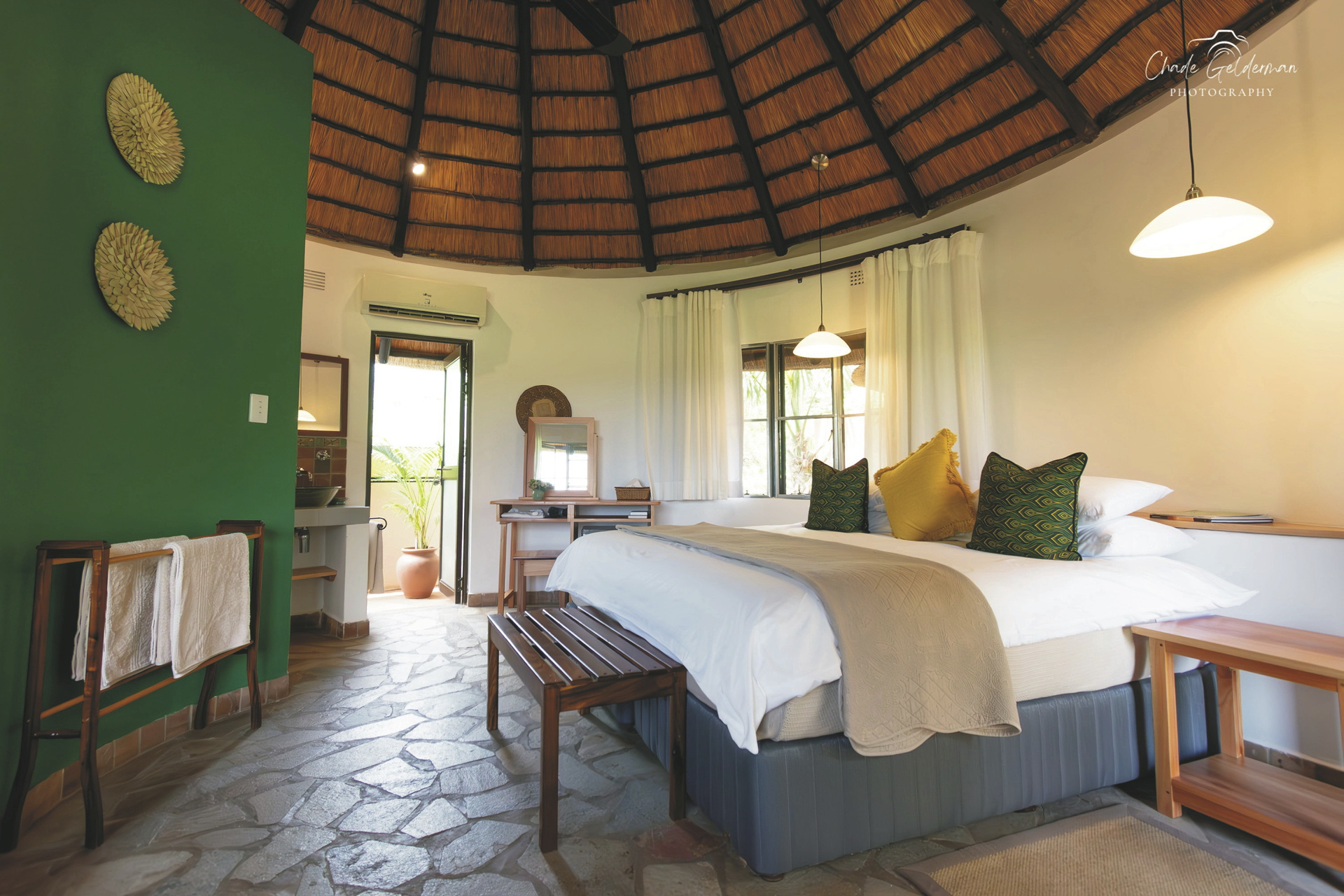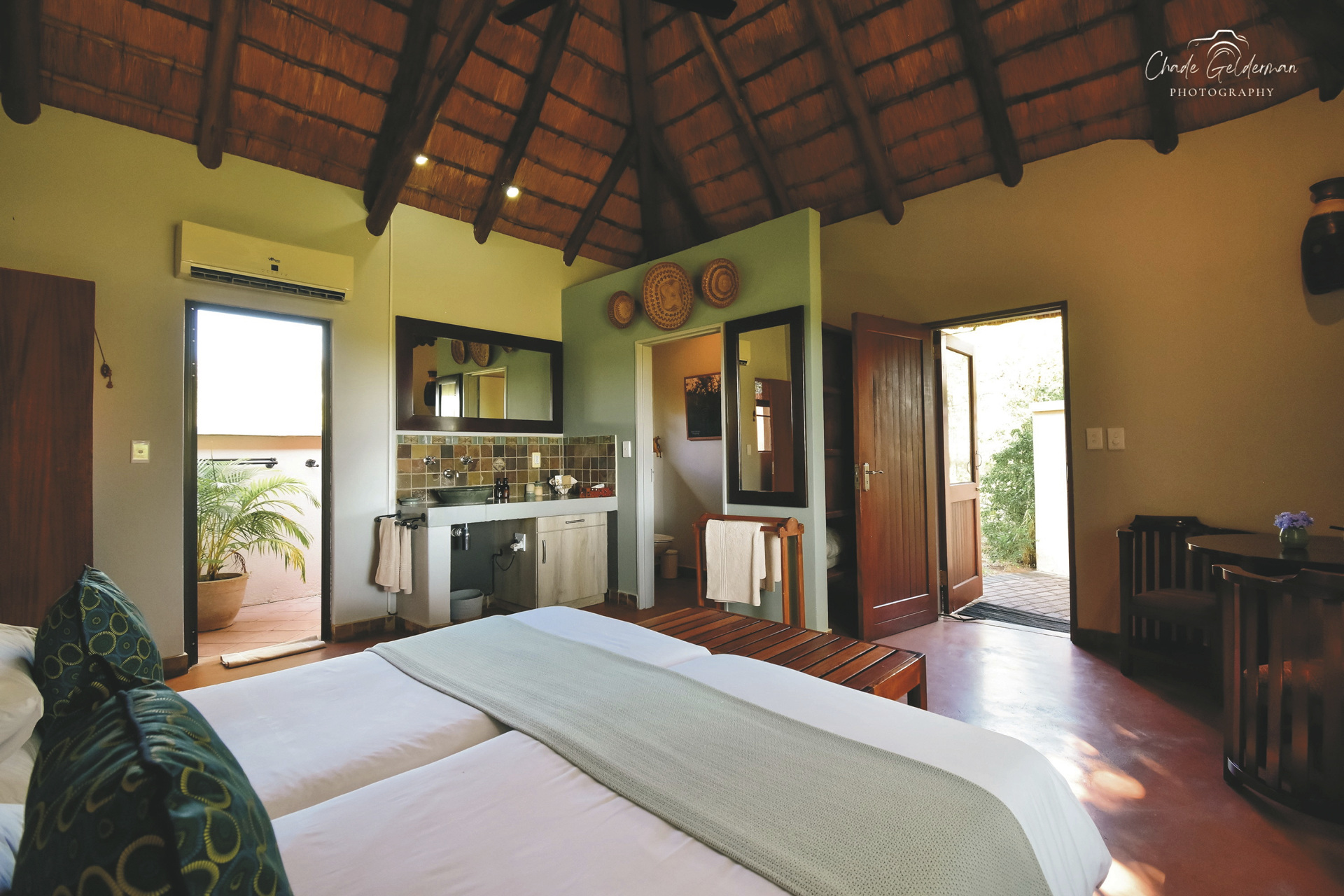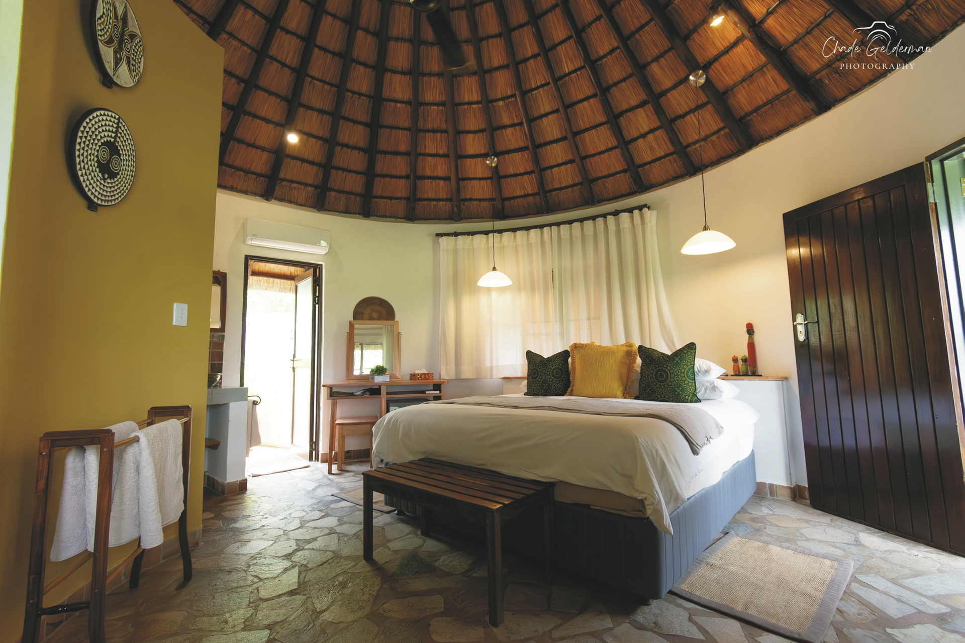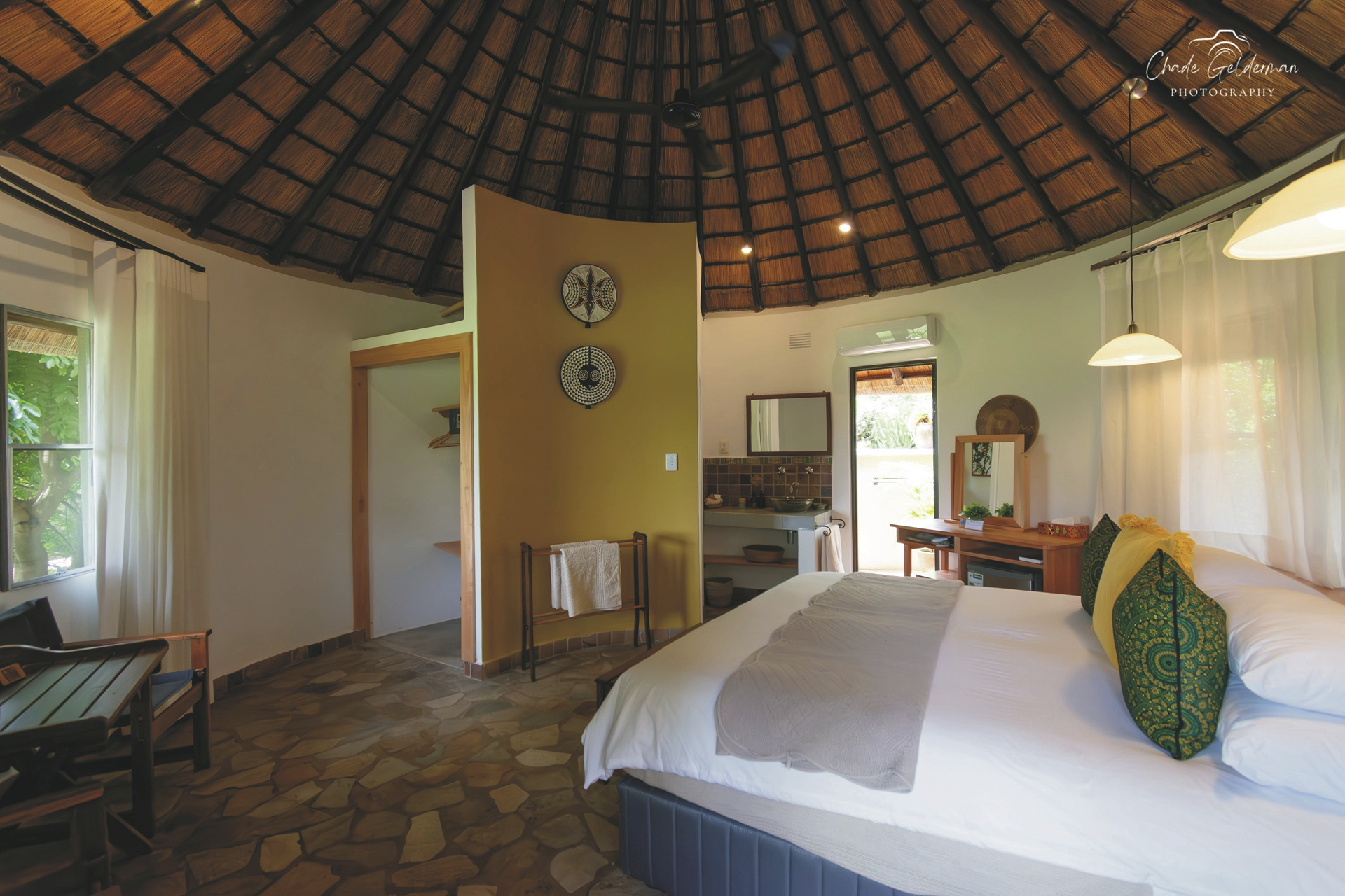 Die Lodge verfügt über 10 wunderschöne riedgedeckte, im afrikanisch-ethnischen Stil dekorierte Rondavels, die unter Schatten spendenden Bäumen stehen. Jedes hat natürlich ein eigenes Bad mit Außendusche, außerdem einen Fön, Safe, kostenloses WLAN, Klimaanlage und einen Ventilator. Es gibt Rondavels mit Verbindungstüren für Familien. Die luxuriöse Suite ist großzügig, modern und klassisch afrikanisch, sie bietet zusätzlich eine Innendusche, Minibar, Lounge und einen privaten Plunge Pool, an dem Sie perfekt entspannen und die afrikanische Sonnen genießen können.