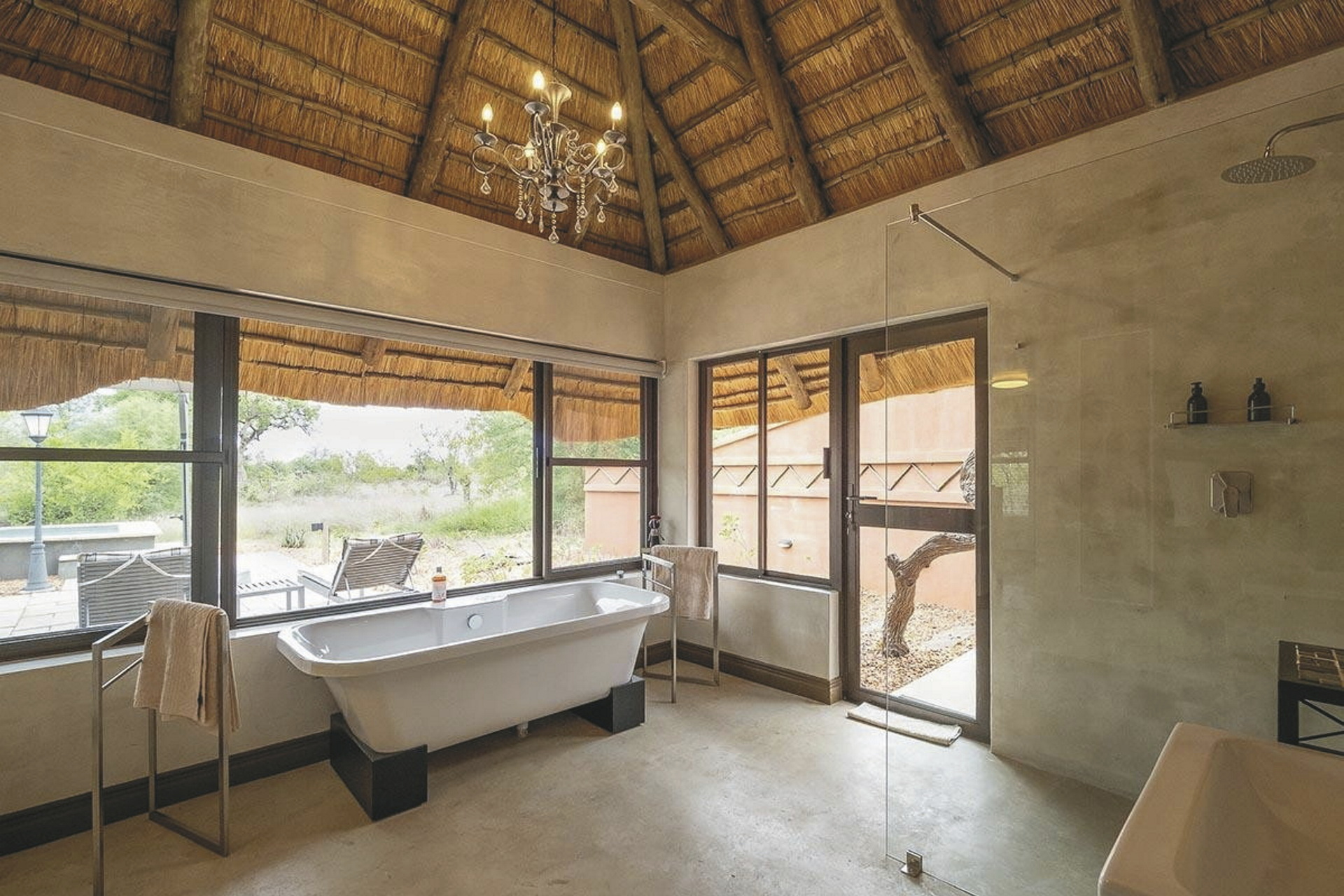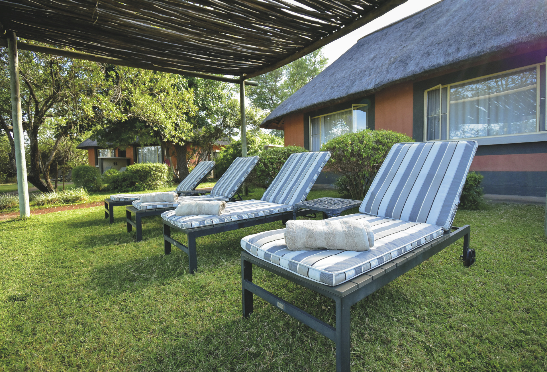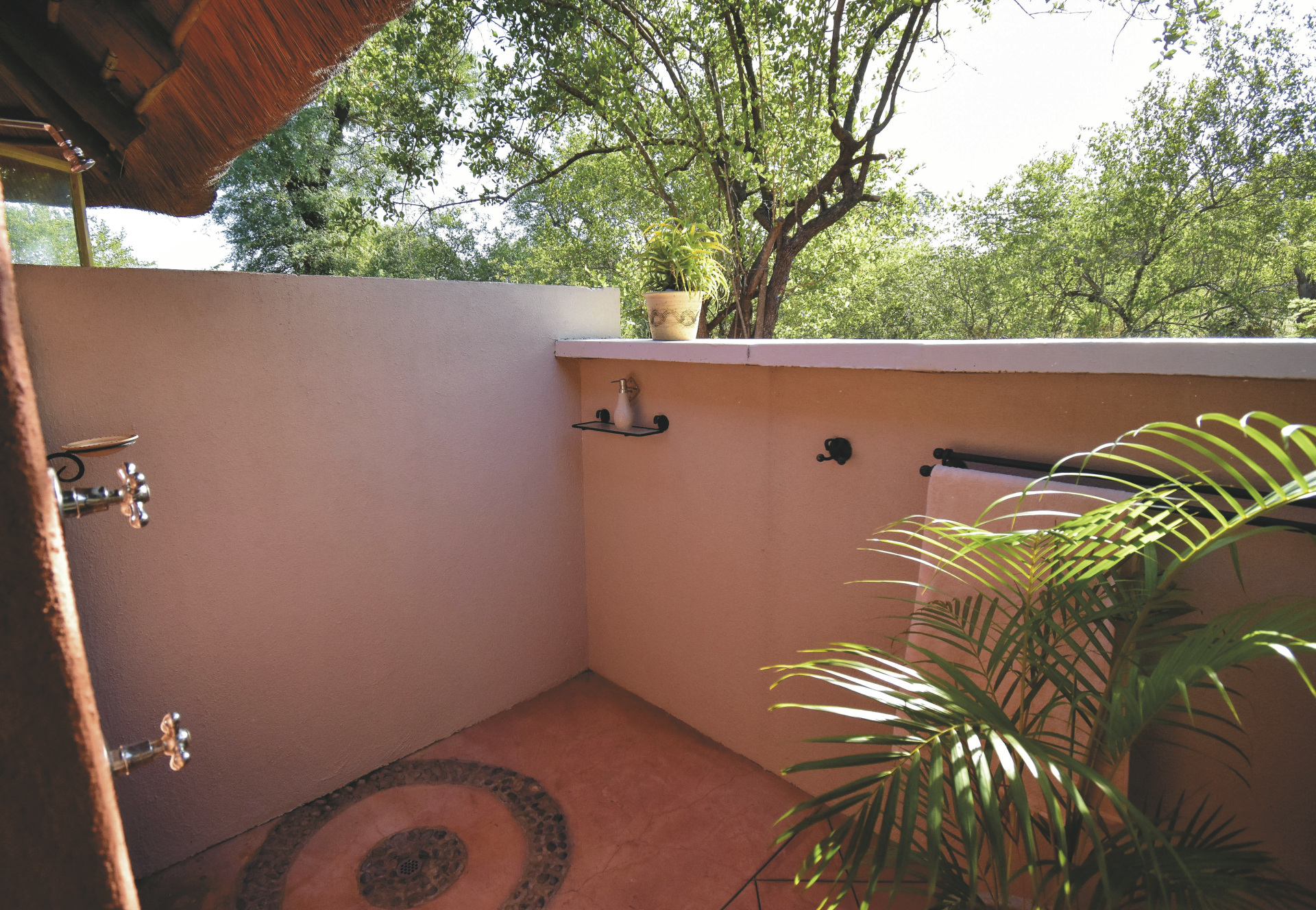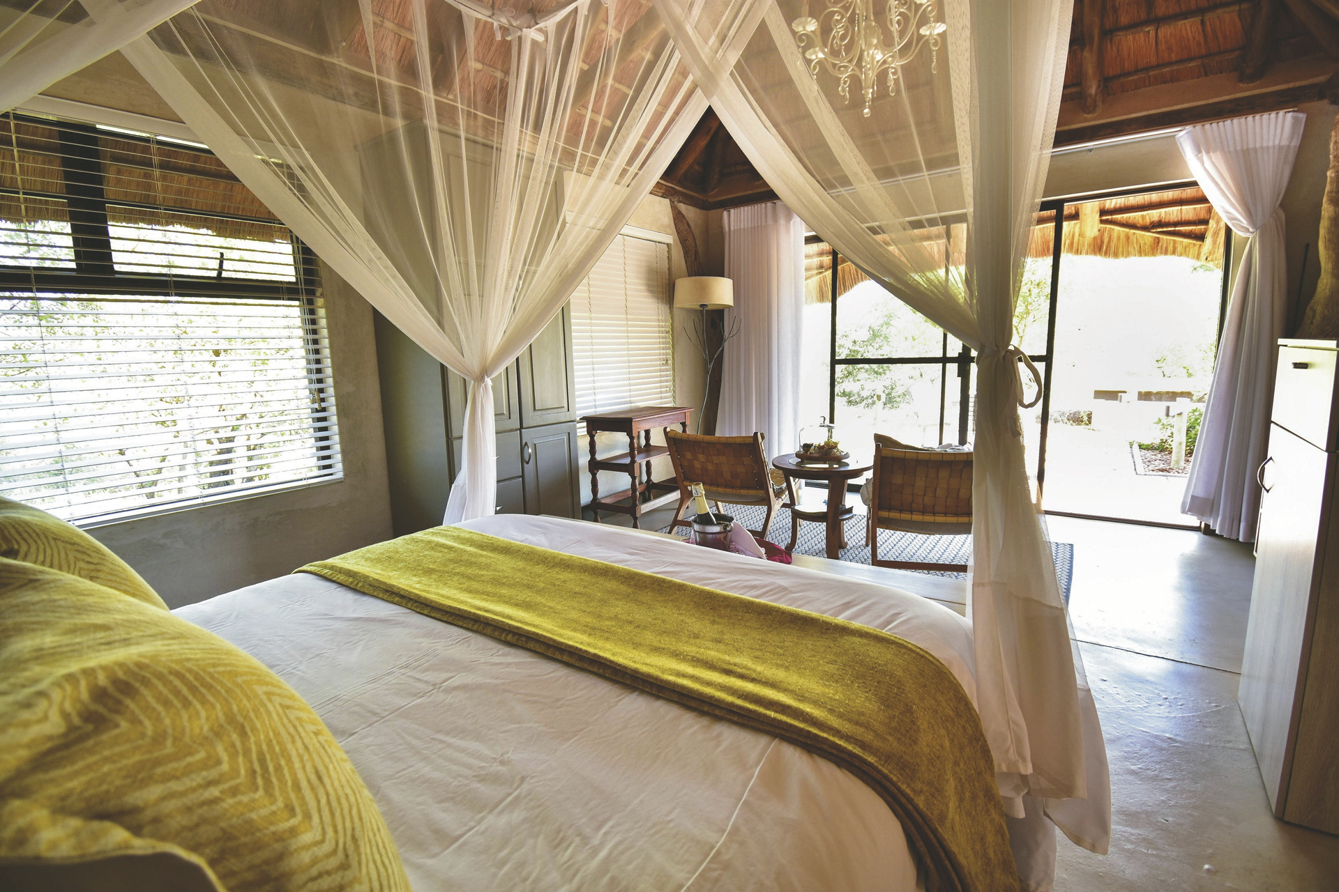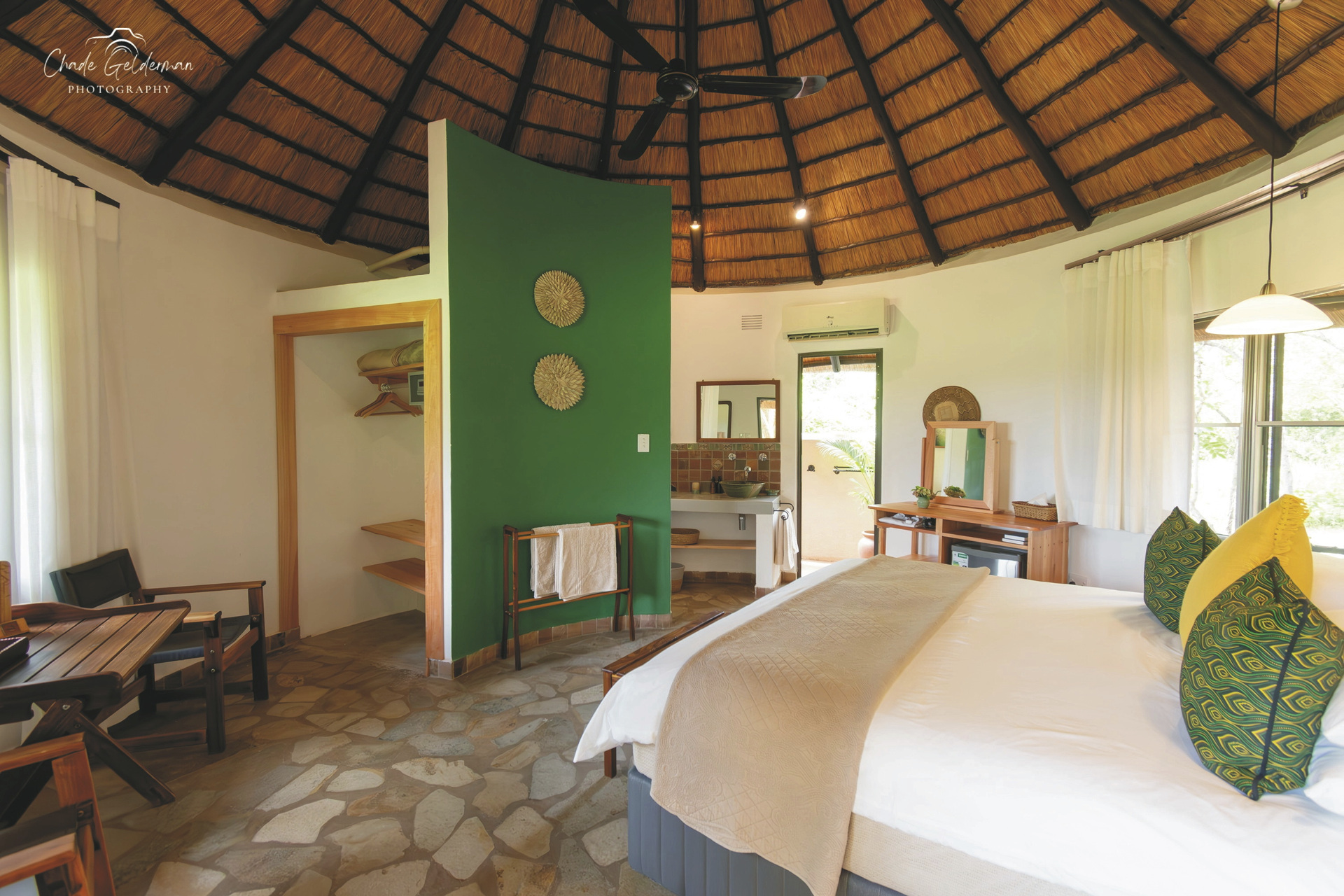Die Lodge verfügt über 10 wunderschöne riedgedeckte, im afrikanisch-ethnischen Stil dekorierte Rondavels, die unter Schatten spendenden Bäumen stehen. Jedes hat natürlich ein eigenes Bad mit Außendusche, außerdem einen Fön, Safe, kostenloses WLAN, Klimaanlage und einen Ventilator. Es gibt Rondavels mit Verbindungstüren für Familien. Die luxuriöse Suite ist großzügig, modern und klassisch afrikanisch, sie bietet zusätzlich eine Innendusche, Minibar, Lounge und einen privaten Plunge Pool, an dem Sie perfekt entspannen und die afrikanische Sonnen genießen können.