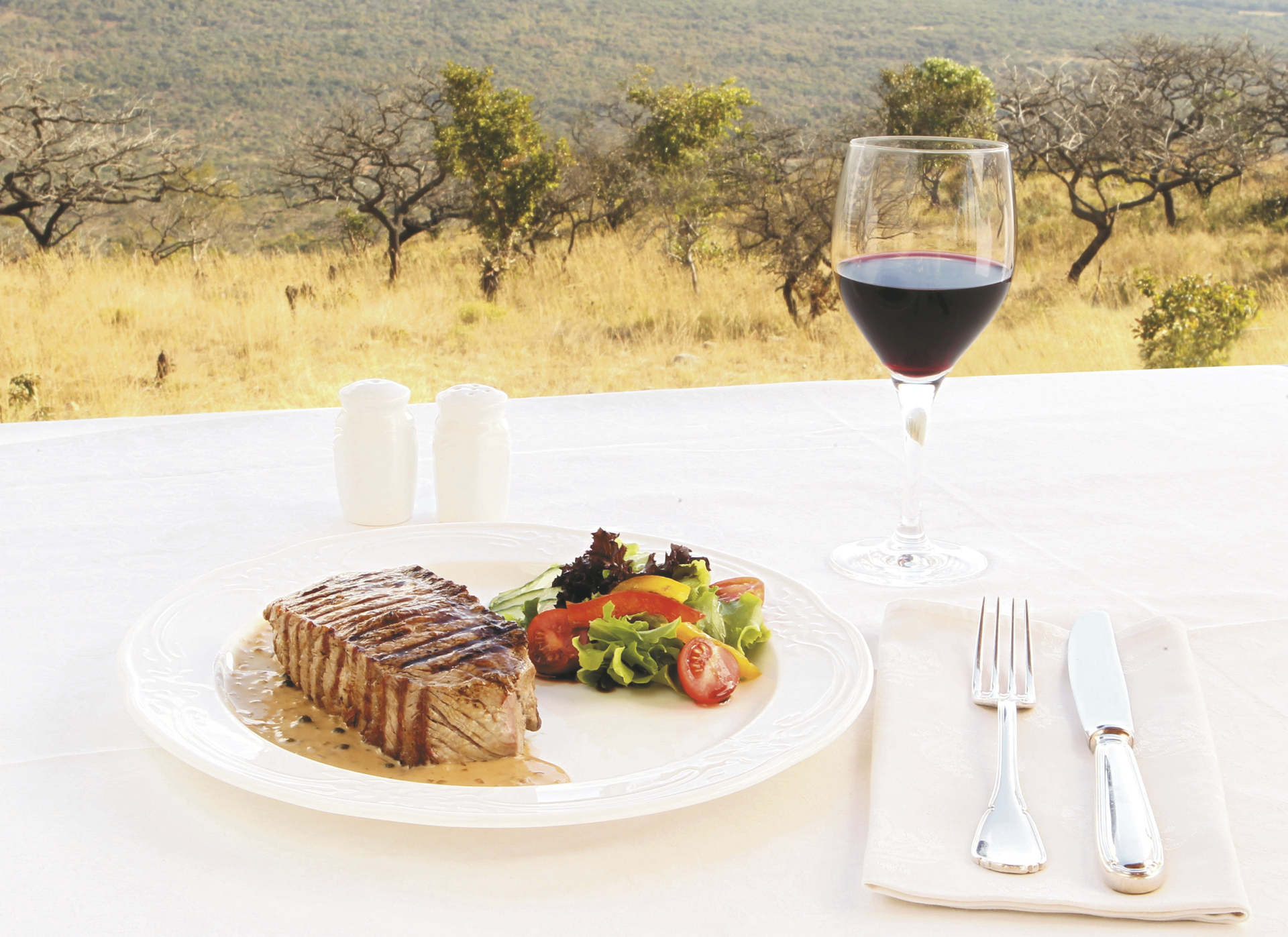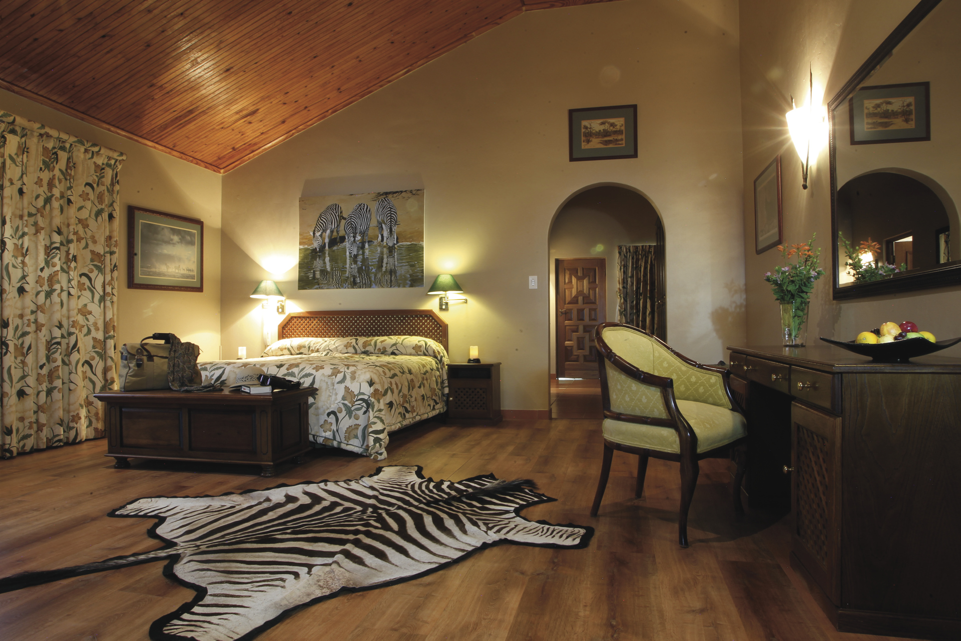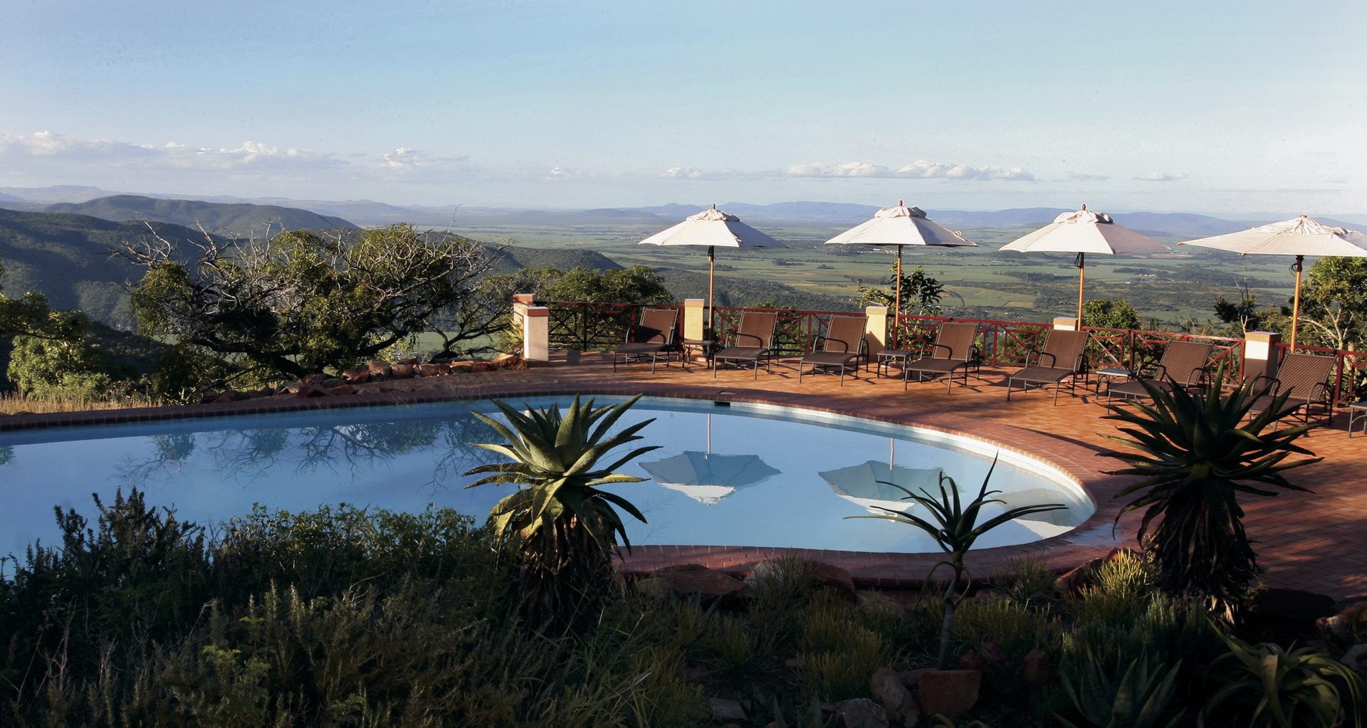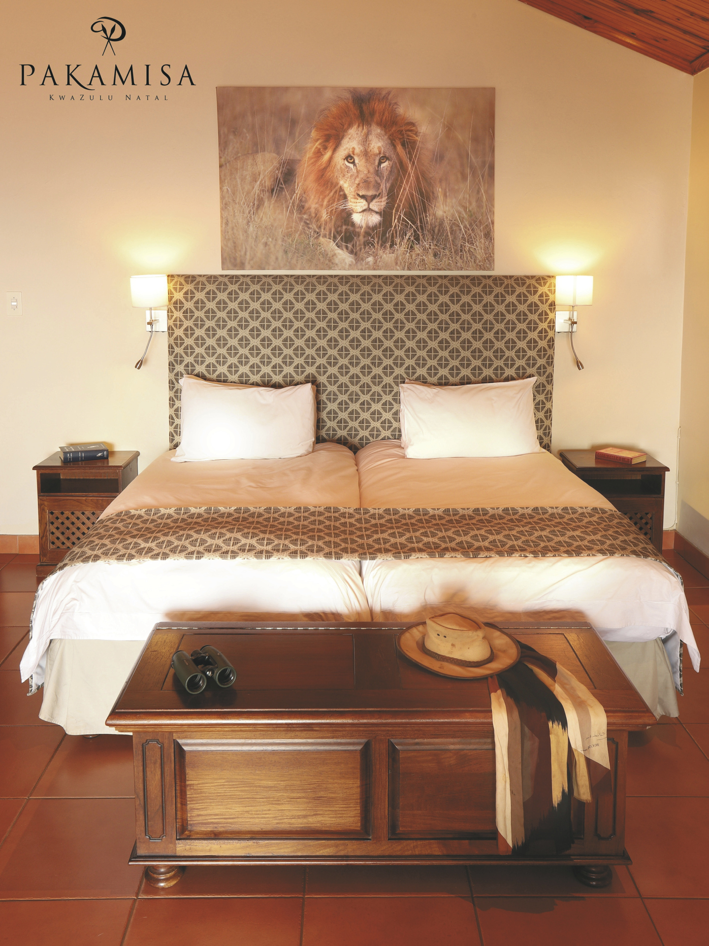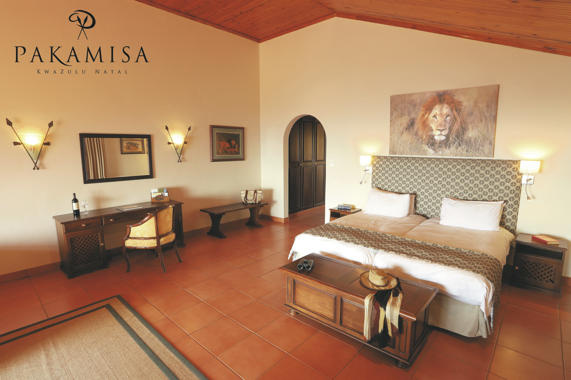Pakamisa bietet Wildbeobachtung hoch zu Ross, zu Fuß oder bequem im Safari-Fahrzeug im privaten Naturparadies an. Afrikanische und spanische Einflüsse werden auf einzigartige Weise verbunden und bieten ein außergewöhnliches Flair. Ein beliebter Treffpunkt, nicht nur am Abend, ist die Hunter´s Bar. Die umfangreiche Bibliothek lässt das Herz eines jeden Buchliebhabers höher schlagen, gemütliche Sessel laden zum Schmökern ein. Im Nebengebäude finden Sie das Restaurant El Prado mit großzügiger Veranda und weitem Blick über das Tal. Hier werden Sie mit internationalen, aber natürlich auch mit feinsten afrikanischen Wildgerichten und Gemüse aus dem eigenen Garten verwöhnt. Romantisch wird es bei einem Picknick oder einem stilvollen Abendessen unter freiem Himmel im Busch. Weine aus dem gut sortierten Keller begleiten die Mahlzeiten. Am großen Pool mit Sonnenliegen und der Poolbar können Sie es sich gut gehen lassen und das großartige Panorama genießen. Kostenloses WLAN im Hauptgebäude und ein überdachter Parkplatz für Ihren Mietwagen runden das Angebot ab. Eingeschlossene Aktivitäten - täglich 2: geführte Pirschfahrten, geführte Buschwanderung mit einem Zulu, bei der auch die Themen Kultur und Geschichte nicht zu kurz kommen; Bogen- und Luftgewehrschießen sowie Reitsafaris (1 Ausritt pro Tag), im Sattel von verlässlichen Pferden kommen Sie Antilopen, Giraffen, Zebras und Impalas unglaublich nah. Optionale Aktivitäten: Tontaubenschießen.
