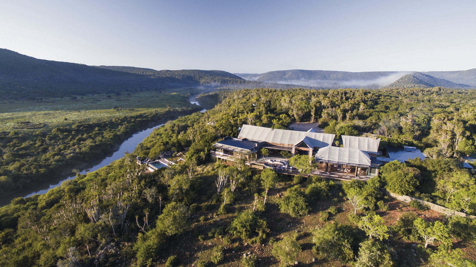 In abgeschiedener Lage mit herrlichem Blick auf den Bushman`s River thront die Lodge oben auf einem Berg inmitten dichtem Bewuchs. Ca. 140 km von Port Elizabeth entfernt. Schon die Anreise ist besonders: über den Fluss werden Sie mit dem Boot Richtung Lodge gebracht (13.00 Uhr), die letzten Meter geht es durch den Busch bergauf per Safari-Fahrzeug. Selbstverständlich können Sie bei späterer Anreise auch mit dem eigenen Mietwagen direkt zur Lodge fahren.