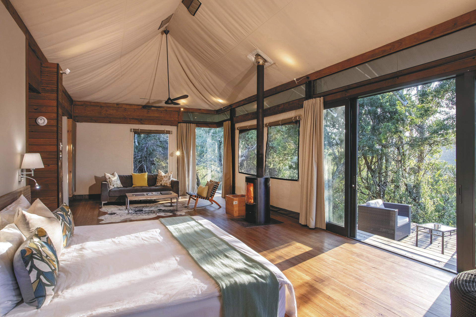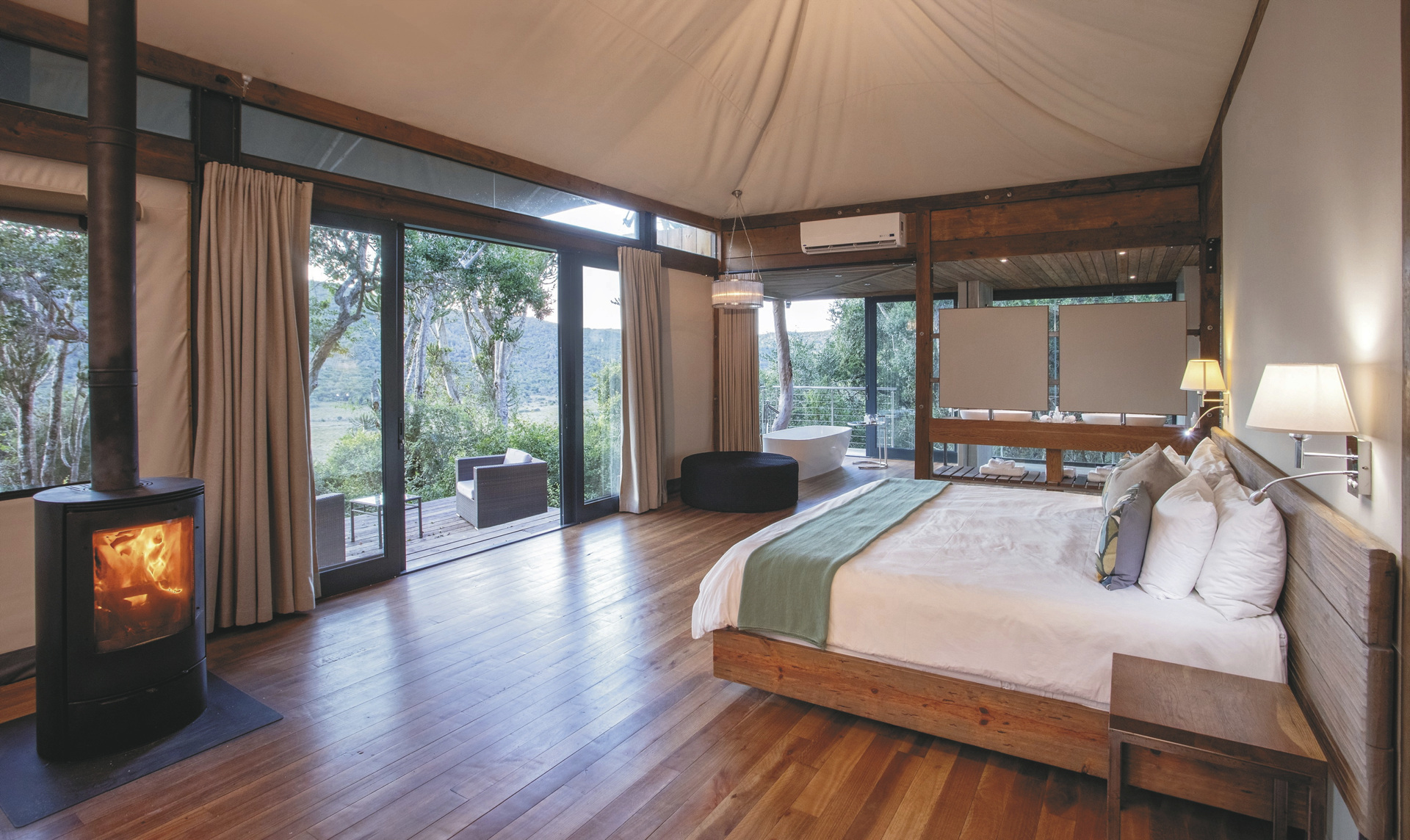 Die 9 luxuriösen Safarizelte im modernen Afrikastil sind an Komfort und Großzügigkeit kaum zu übertreffen, gerne möchte man hier den ganzen Tag verweilen. Das helle Bad punktet mit Innen- und Außendusche sowie einer frei stehenden Badewanne; im Loungebereich knistert am Abend der Kamin. Außerdem steht Ihnen eine Minibar, Telefon, Fön, Safe, Tee-/Kaffeezubereiter, Klimaanlage und ein Deckenventilator zur Verfügung. Über die große verglaste Front erreichen Sie Ihre private Terrasse, die einen atemberaubenden Blick über den Busch gewährt.