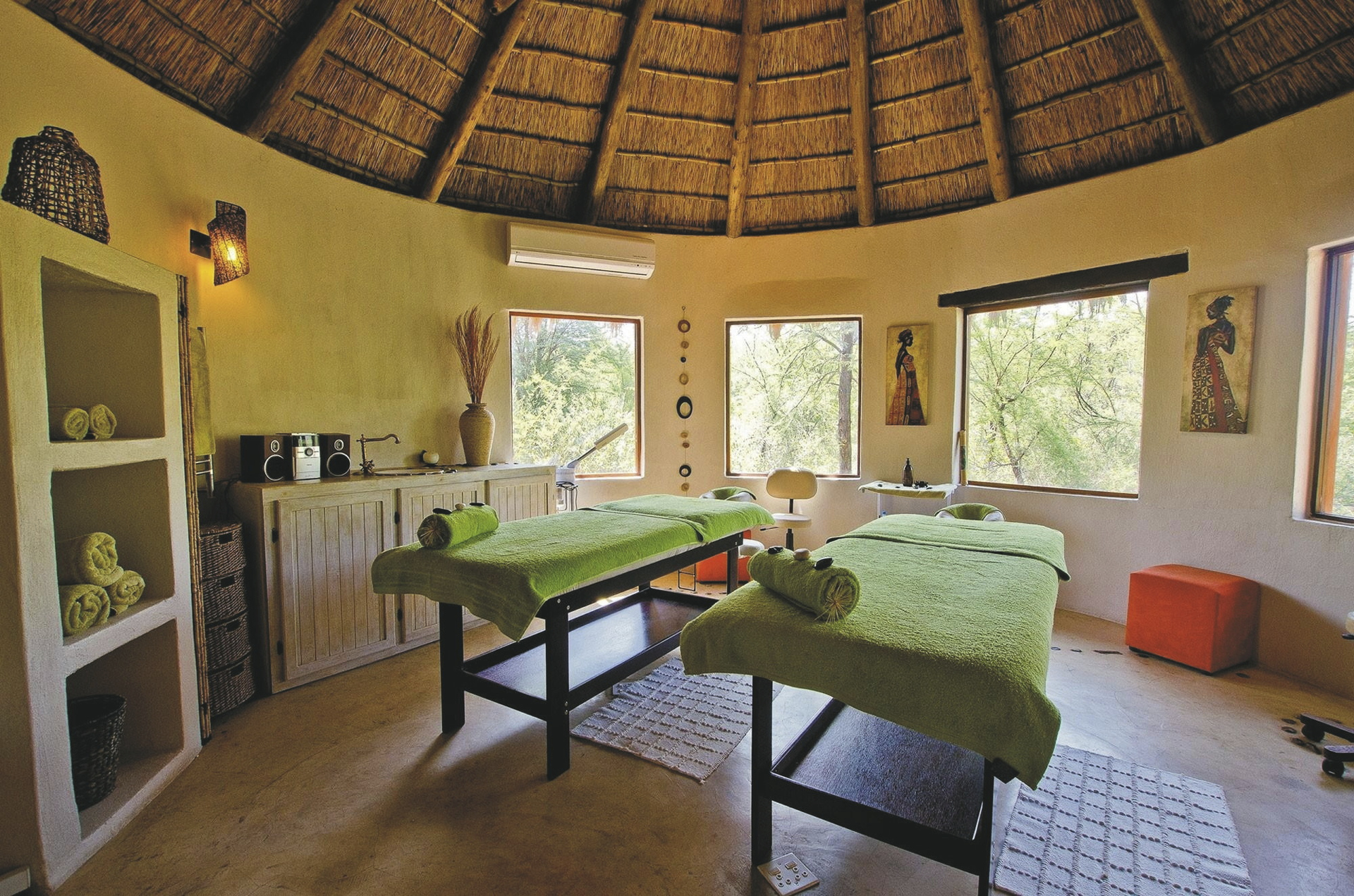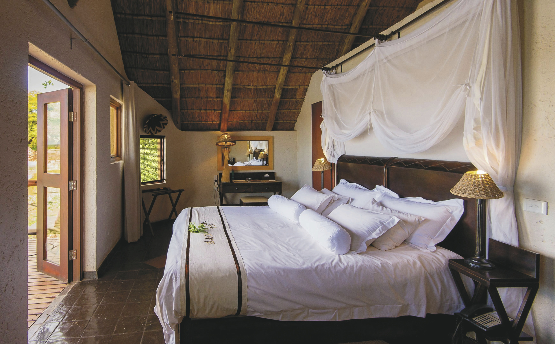 Die 30 Chalets im klassischen Busch-Design reihen sich links und rechts vom Hauptbereich entlang des Wasserloches auf. Jedes verfügt über ein eigenes Bad mit Außendusche, Klimaanlage/Heizung, Ventilator, Minibar, Tee-/Kaffeezubereiter, Telefon, Moskitonetz, Safe und eine private Terrasse mit herrlicher Aussicht. Die luxuriösen Deluxe-Chalets sind doppelt so groß mit zusätzlichem gemütlichen Wohnbereich und Schlafcouch für ein Kind. Für Familien gibt es außerdem ein Familienzimmer (Standard) und eine Familiensuite (Deluxe) mit jeweils 2 Schlaf- und Badezimmern und gemeinsamer Lounge.