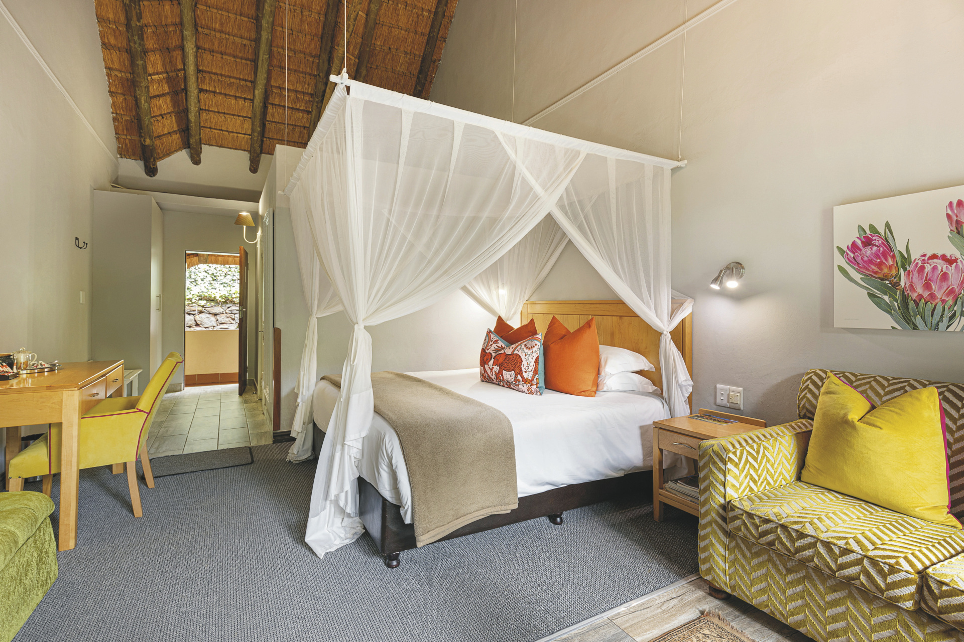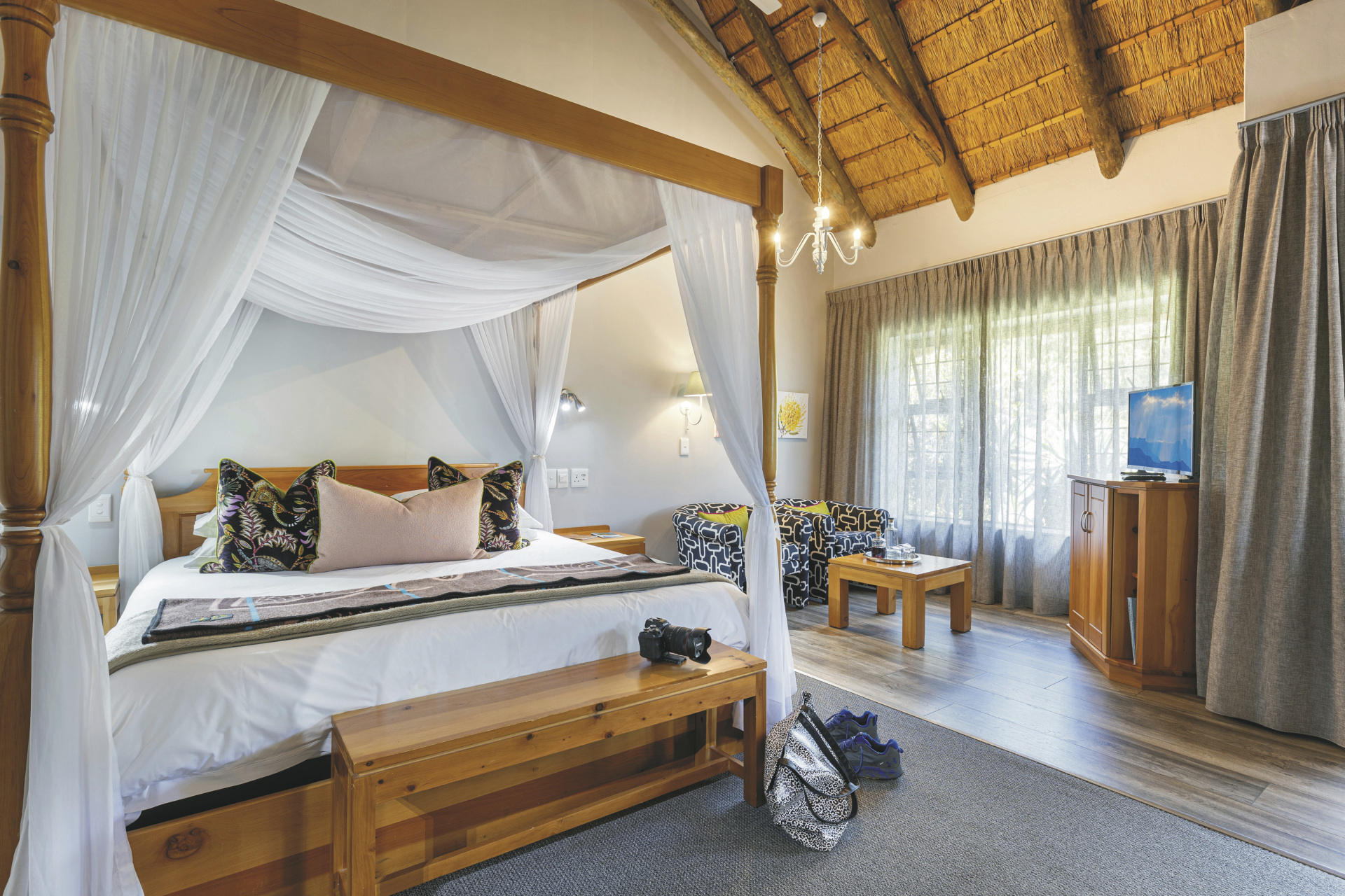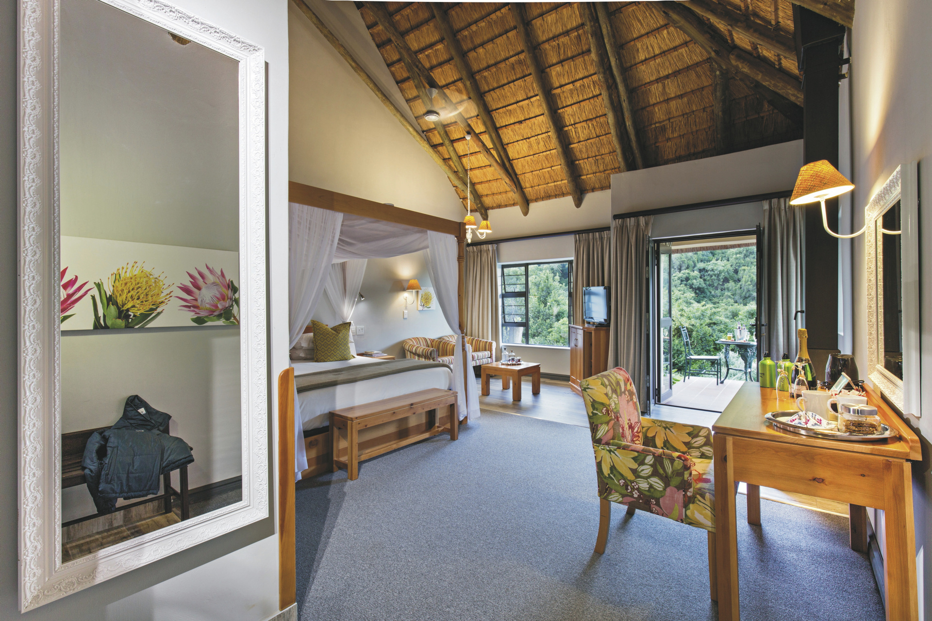 Es gibt insgesamt 55 behagliche Zimmer und Suiten in 3 Kategorien. Die Standardzimmer befinden sich im Garten, die Superior-Zimmer blicken auf einen wunderschönen Farnwald. Jedes der strohgedeckten Zimmer ist hell und modern ausgestattet und verfügt über ein eigenes Bad, Heizung, Ventilator, Tee-/Kaffeezubereiter, Terrasse oder Balkon. Die Superior-Zimmer haben zusätzlich ein Moskitonetz, eine Minibar und TV. Die geräumigen Suiten sind außerdem mit einem Kamin ausgestattet. Für Familien stehen in der Dreibettzimmer und Zimmer mit Verbindungstür zur Verfügung, aber auch Suiten mit 2 Schlaf- und Badezimmern sowie einer gemeinsamen Lounge.