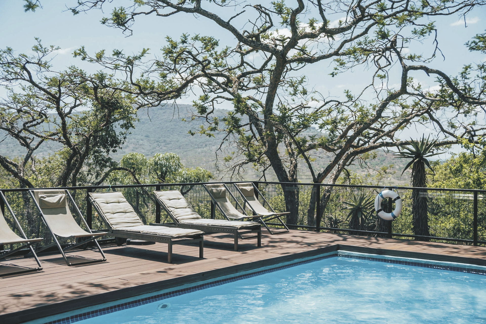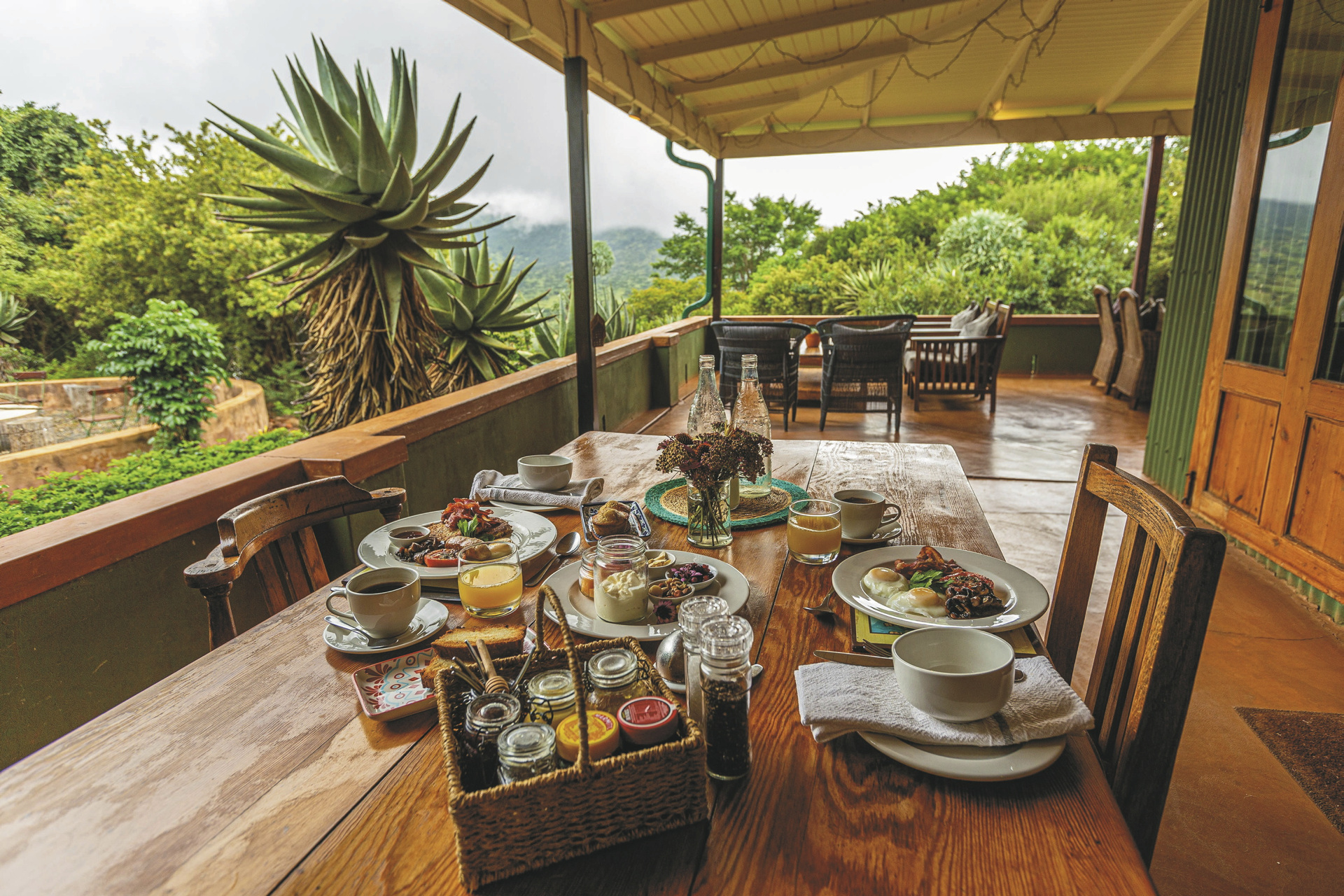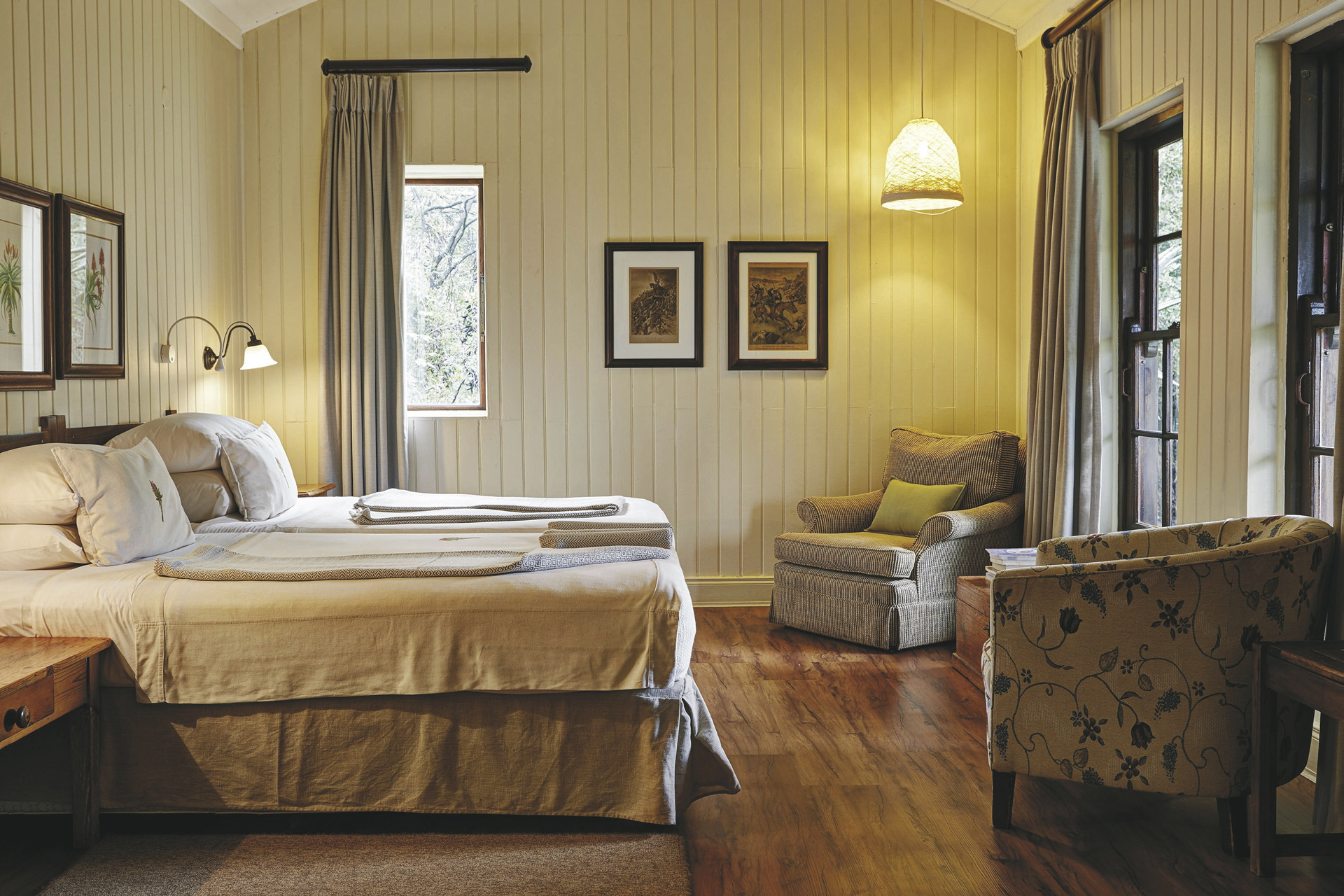 Sehr persönlich von den Inhabern mit viel Herzblut and Engagement geführte Lodge. Das Hauptgebäude im kolonialen Stil mit umlaufender Terrasse wirkt wie ein heimeliges Wohnhaus, alte Bilder und Erinnerungstücke laden zum Betrachten ein. Im eleganten Speisezimmer oder auf der Terrasse werden Ihnen schmackhafte Gerichte, selbst gebackenes Brot und hausgemachte Marmeladen serviert. Gleich nebenan stehen wuchtige Sessel zum gemütlichen Plausch bereit. Ihr Getränk nehmen Sie sich aus der Honesty-Bar. Ein paar interessante Bücher zur Geschichte und Kultur der Region stehen zum Schmökern und Blättern genauso bereit wie Spiele und Puzzle. Am Abend erwärmt ein behagliches Kaminfeuer den Raum. Kostenloses WLAN finden Sie hier auch. Im Nebengebäude ist vor eine umfangreiche Bibliothek mit über 3.000 Werken entstanden. Eine Etage tiefer erwartet Sie ein Weinkeller, der gerne auch für ein romantisches Abendessen gebucht werden kann. Ein paar Schritte entfernt befindet sich ein kleiner Pool mit einer schattigen Terrasse von der Sie eine grandiose Aussicht haben. Kleine Gäste können sich auf dem Außenspielbereich mit Klettergerüst, Trampolin, Hindernisparcours, Sandkasten und Fantasiehaus verausgaben. Etwas ganz Besonderes sind die Runden abends am Lagerfeuer, wenn Ihr Gastgeber die Geschichte rund um das Spioenkop Reservat lebendig werden lässt. Optionale Aktivitäten: geführte Ausritte, Mountainbike-Verleih, Buschwanderungen ab 12 Jahren, geführte Touren zu den historischen Schlachtfeldern (Battlefields) ab 16 Jahren, Village-Tour. Die Lodge unterstützt die Gemeinde im benachbarten Dorf Hambrook, allen voran die Frauen, die mit kleinen handwerklichen Arbeiten zum Lebensunterhalt der Familien beitragen. Ein Dorfbesuch gewährt Ihnen nicht nur Einblicke in die Kultur der Zulu, sondern gibt Ihnen auch die Möglichkeit mit den Bewohnern ins Gespräch zu kommen. Außerdem durchziehen diverse markierte Wanderwege das Farmgelände. Für Familien gibt es auf der Lodge und in der näheren Umgebung viele Aktivitäten, z.B. Besuch der Greifvogel-Station Falcon Ridge im Champagne Valley oder des Boys Choir, oder eine Fahrt mit dem Heißluftballon.