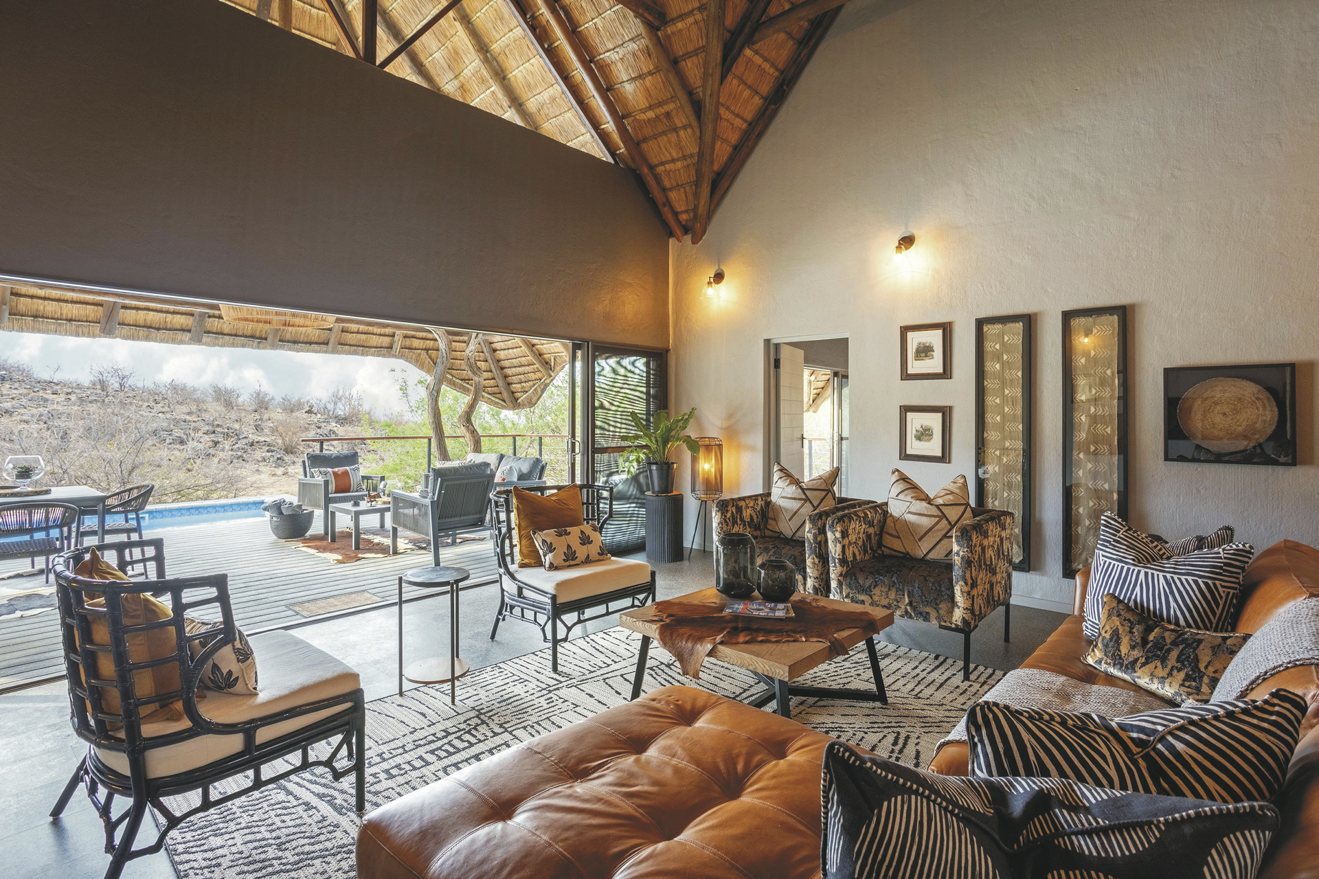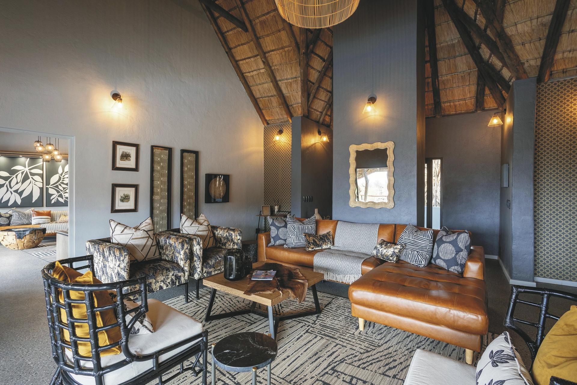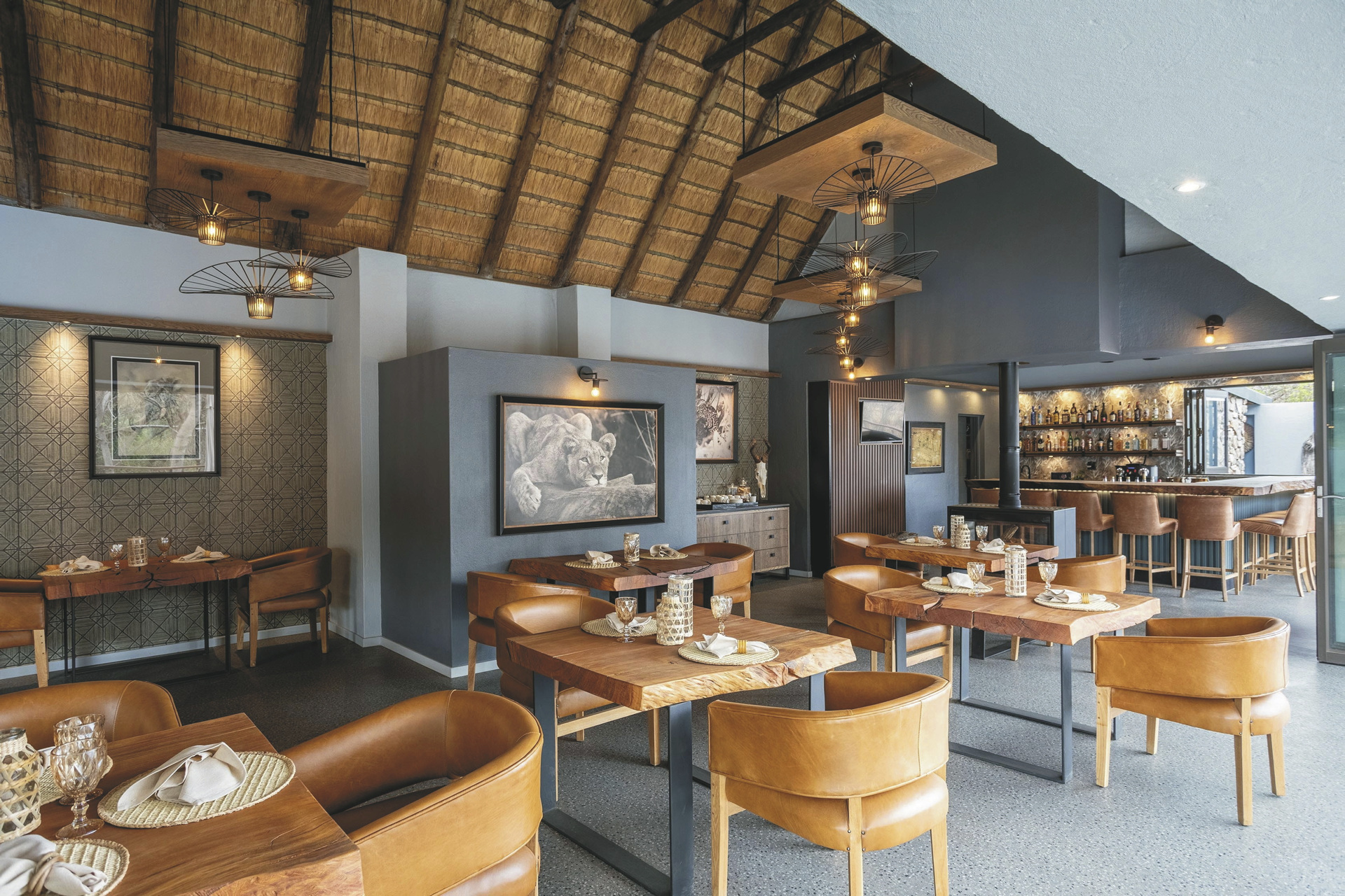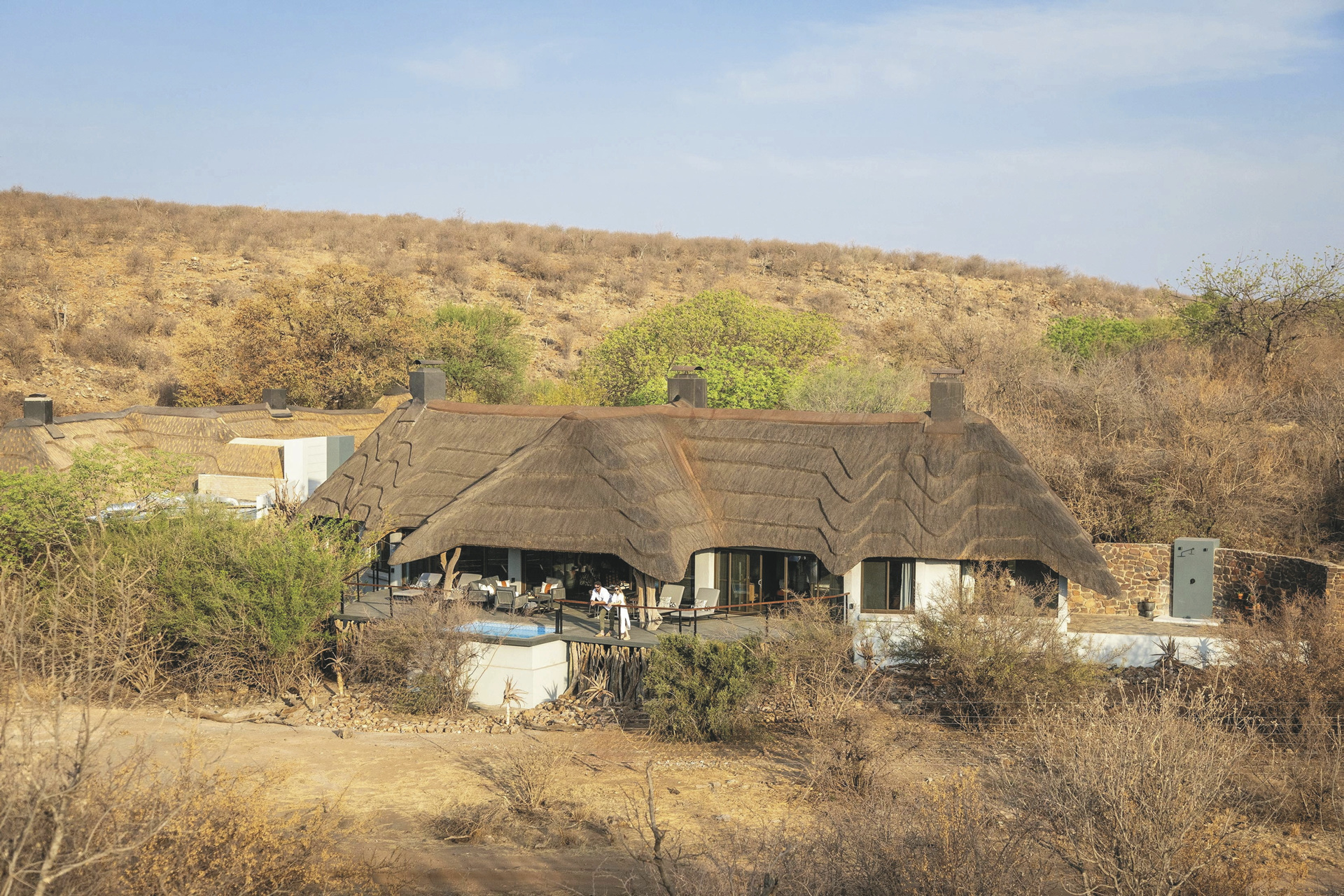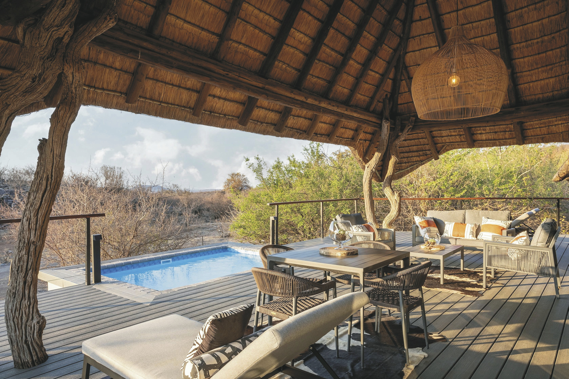 Das strohgedeckte Hauptgebäude der Lodge erstrahlt in modernem afrikanischem Stil, hier finden Sie auch kostenloses WLAN. Es verfügt über diverse gemütliche Sitzbereiche im Innen- und Außenbereich, einen eleganten Speisesaal, eine Bar, eine kleine Bibliothek, eine Kinderspielecke und einen herrlichen Pool mit Blick auf das Wasserloch, von dem aus Sie nur wenige Meter entfernt den Anblick und die Geräusche der Tiere genießen können. Etwas ganz Besonderes ist sicherlich das unterirdische Versteck am Wasserloch, wo Sie die verschiedenen Tiere aus ungewöhnlicher Perspektive ganz in Ruhe beobachten können. In der Boma, unter einem uralten Feigenbaum, oder auf der Terrasse werden nach Möglichkeit die Mahlzeiten serviert, feine Küche und eine Auswahl an Spitzenweinen erwarten Sie. Eine weitläufige Holzterrasse verbindet die verschiedenen Bereiche miteinander. Wer sportlich aktiv sein möchte, kann sich im hauseigenen Fitnesscenter verausgaben, hier finden Sie auch eine zweiten, kleineren Pool. Diverse Spa-Behandlungen können optional gebucht werden, diese genießen Sie dann auf der eigenen Terrasse. Eingeschlossene Aktivitäten: Pirschfahrten und Kinderprogramm (englisch & afrikaans).