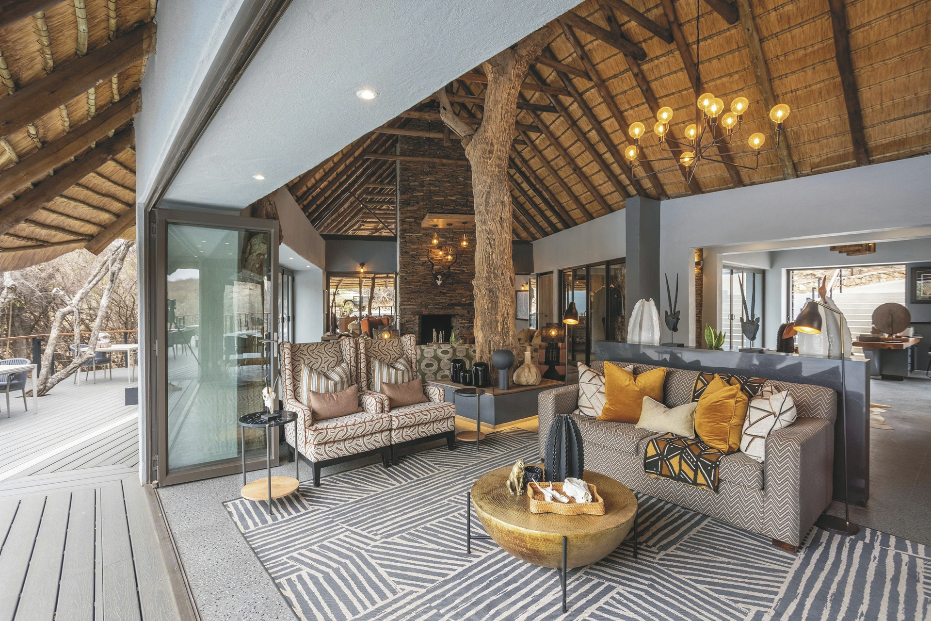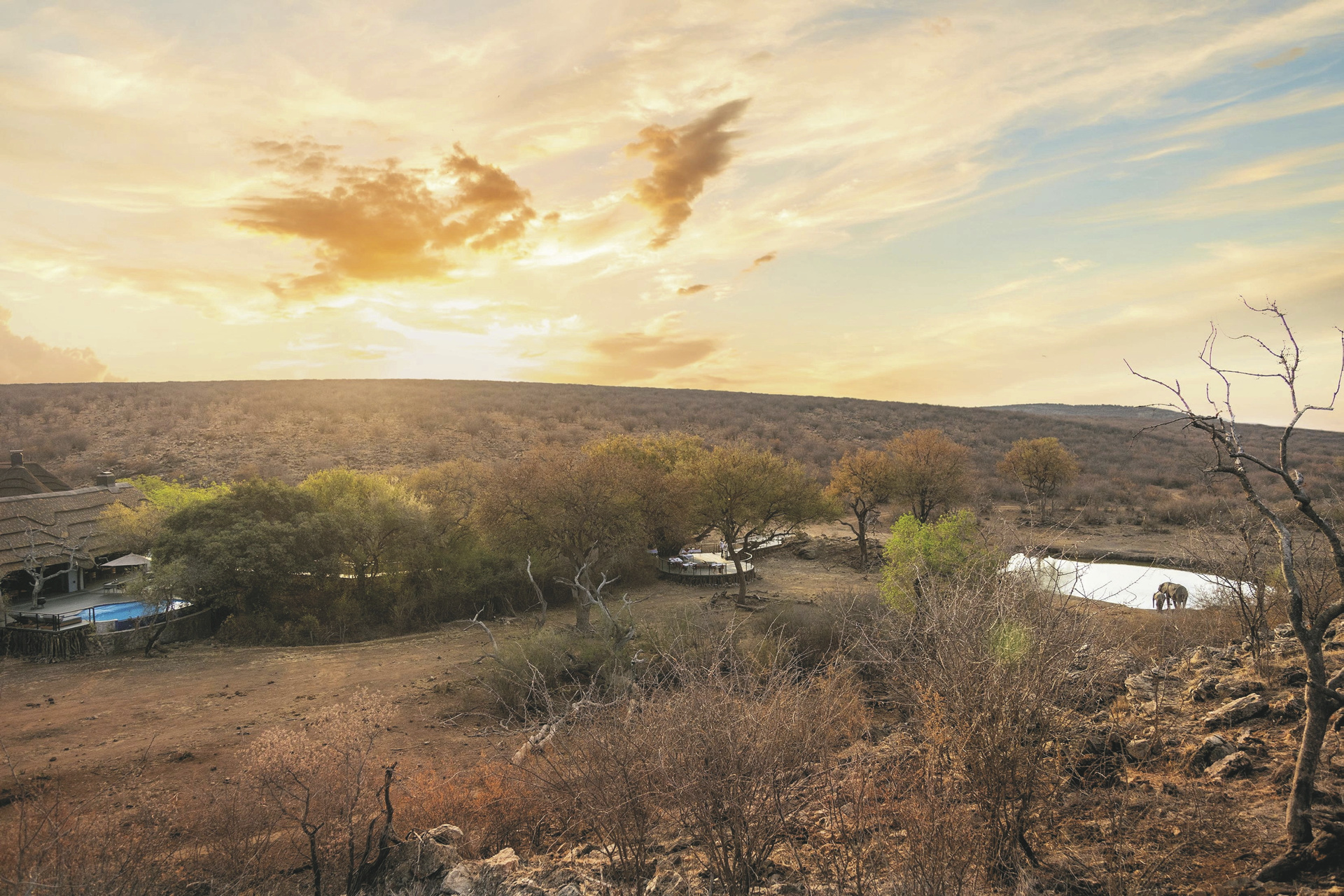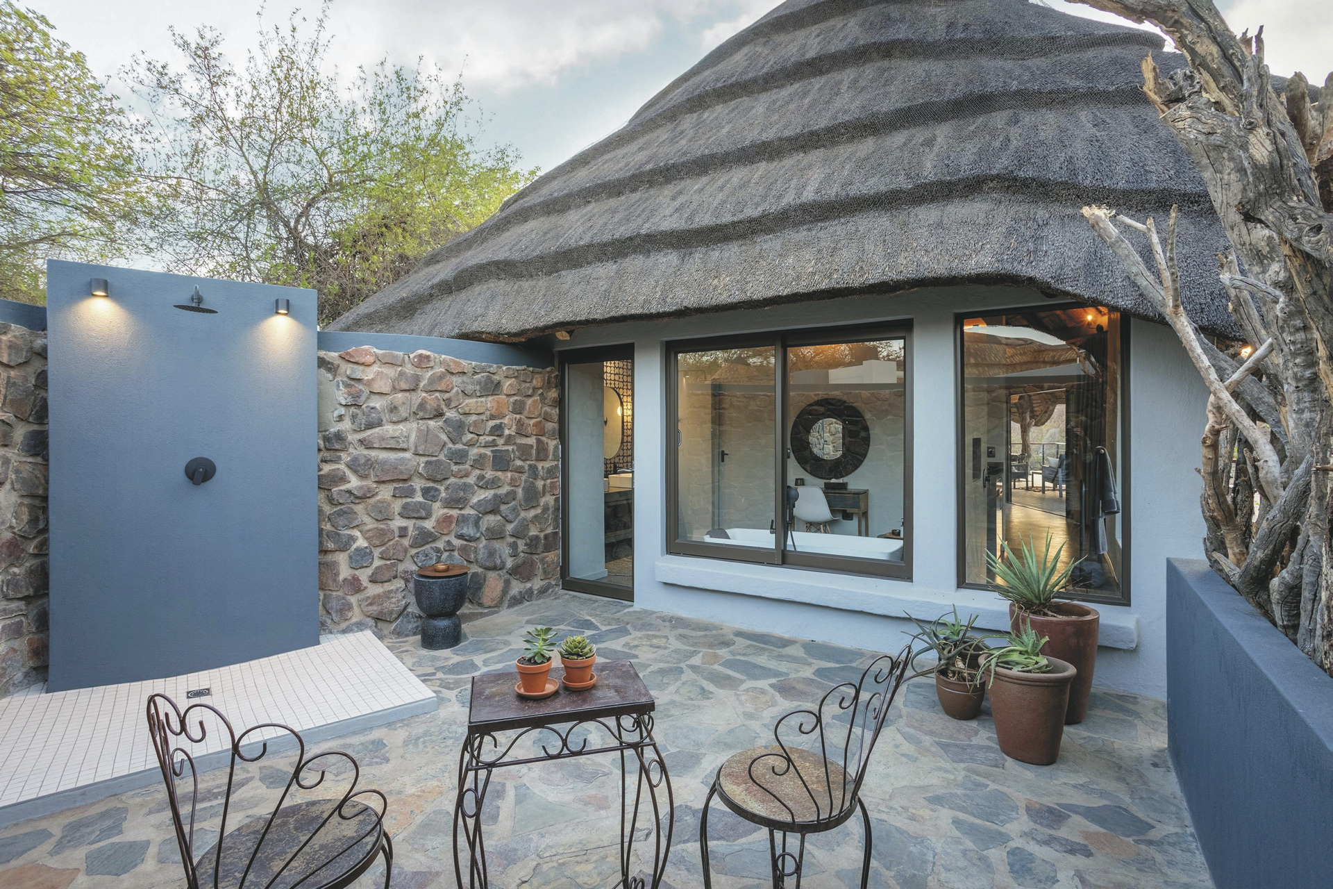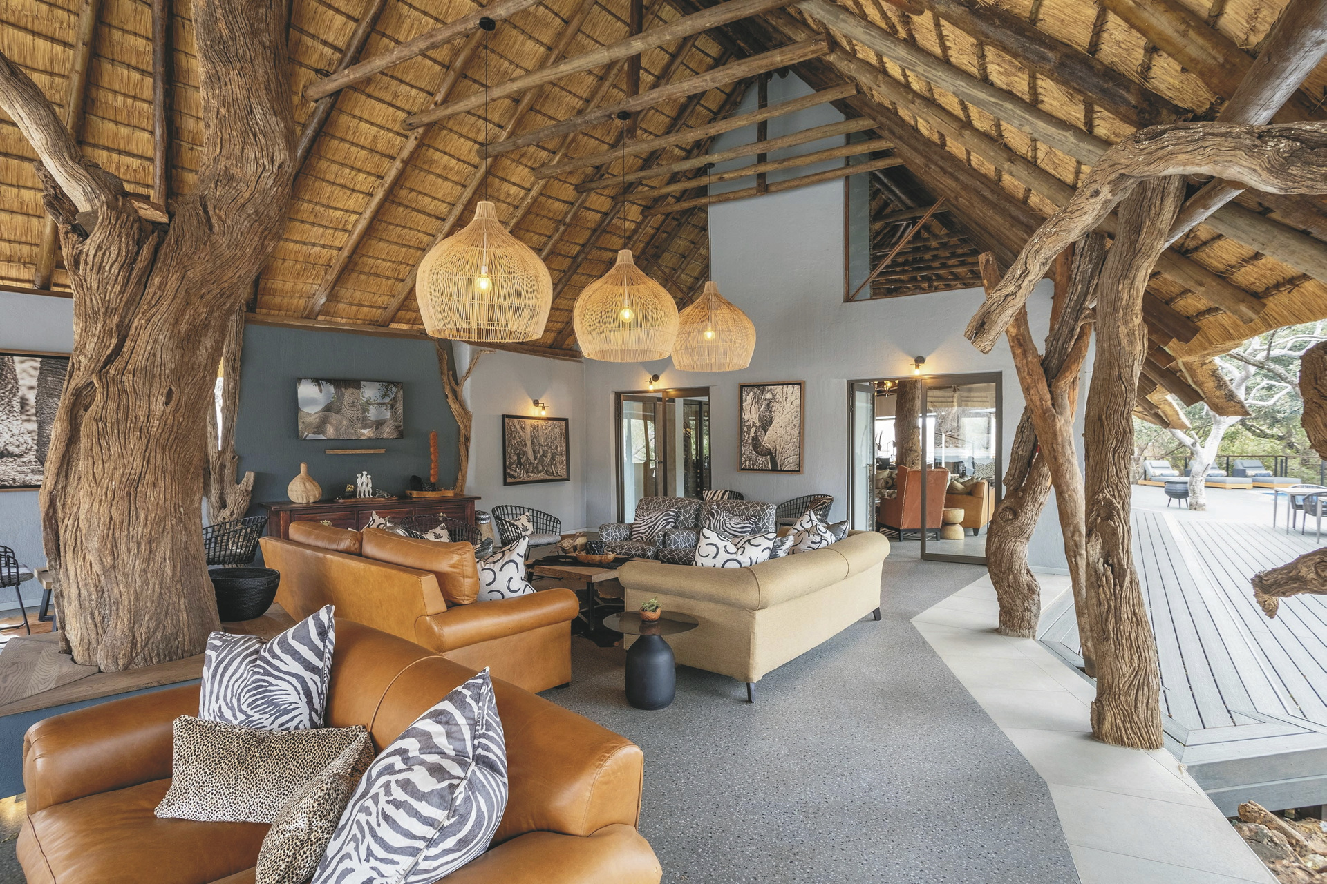 Das strohgedeckte Hauptgebäude der Lodge erstrahlt in modernem afrikanischem Stil, hier finden Sie auch kostenloses WLAN. Es verfügt über diverse gemütliche Sitzbereiche im Innen- und Außenbereich, einen eleganten Speisesaal, eine Bar, eine kleine Bibliothek, eine Kinderspielecke und einen herrlichen Pool mit Blick auf das Wasserloch, von dem aus Sie nur wenige Meter entfernt den Anblick und die Geräusche der Tiere genießen können. Etwas ganz Besonderes ist sicherlich das unterirdische Versteck am Wasserloch, wo Sie die verschiedenen Tiere aus ungewöhnlicher Perspektive ganz in Ruhe beobachten können. In der Boma, unter einem uralten Feigenbaum, oder auf der Terrasse werden nach Möglichkeit die Mahlzeiten serviert, feine Küche und eine Auswahl an Spitzenweinen erwarten Sie. Eine weitläufige Holzterrasse verbindet die verschiedenen Bereiche miteinander. Wer sportlich aktiv sein möchte, kann sich im hauseigenen Fitnesscenter verausgaben, hier finden Sie auch eine zweiten, kleineren Pool. Diverse Spa-Behandlungen können optional gebucht werden, diese genießen Sie dann auf der eigenen Terrasse. Eingeschlossene Aktivitäten: Pirschfahrten und Kinderprogramm (englisch & afrikaans).