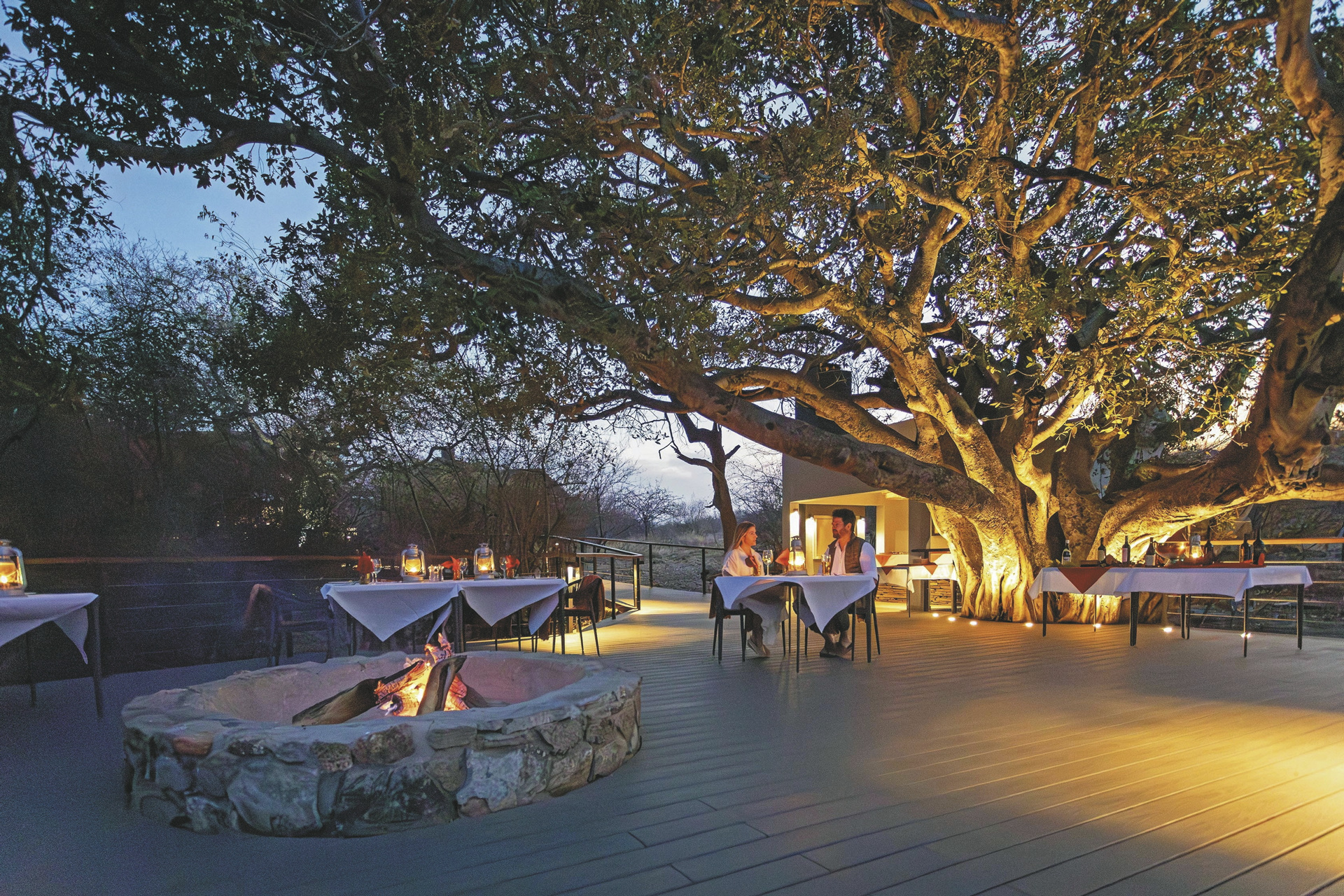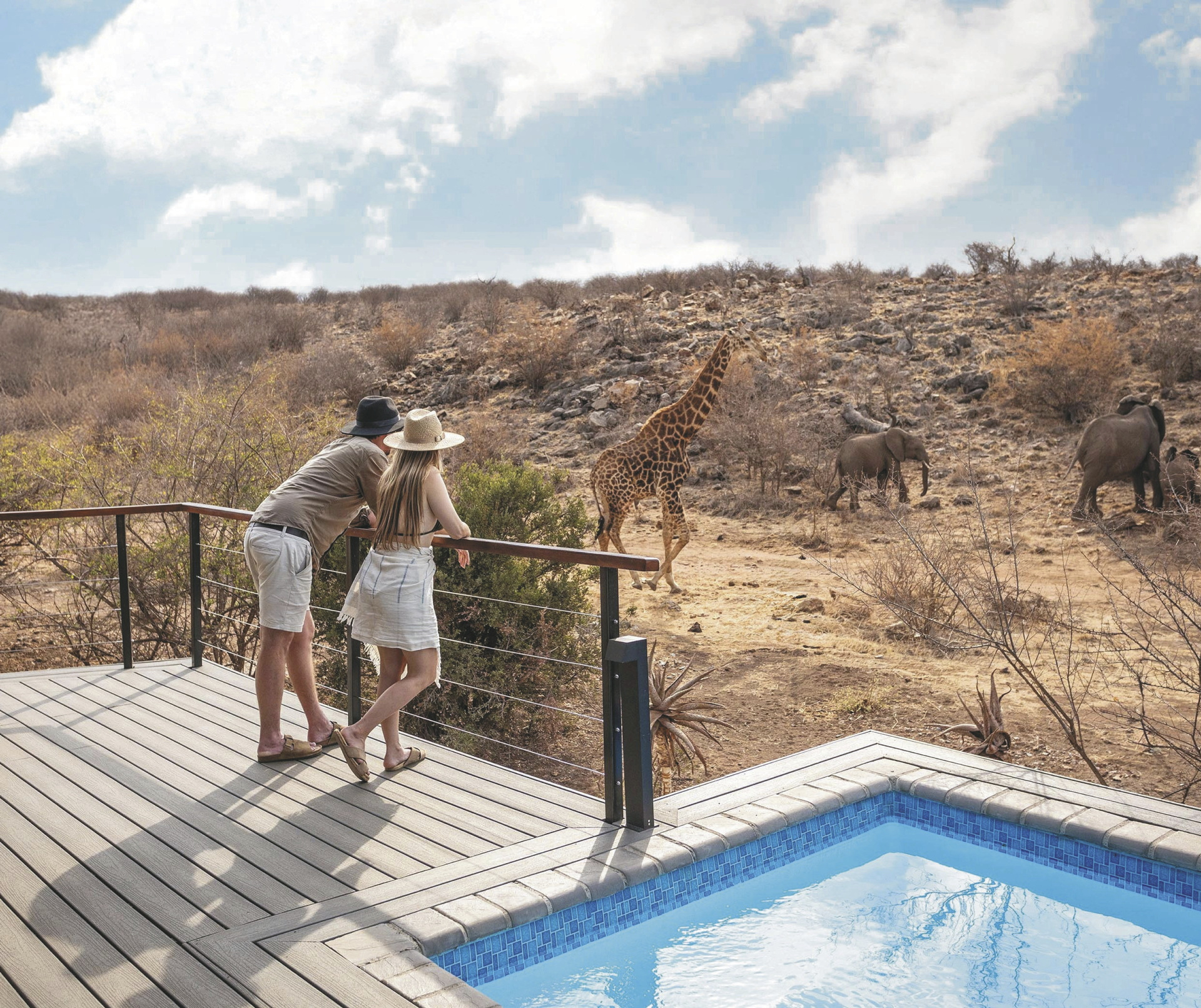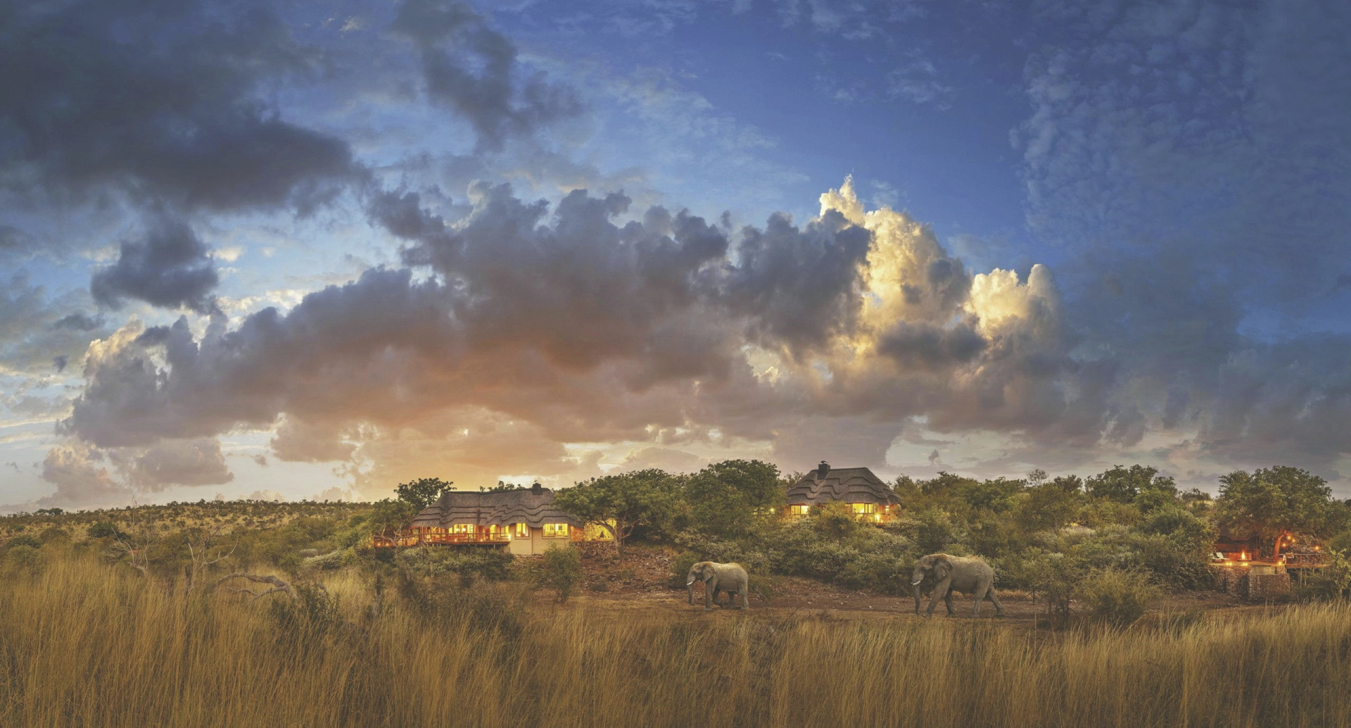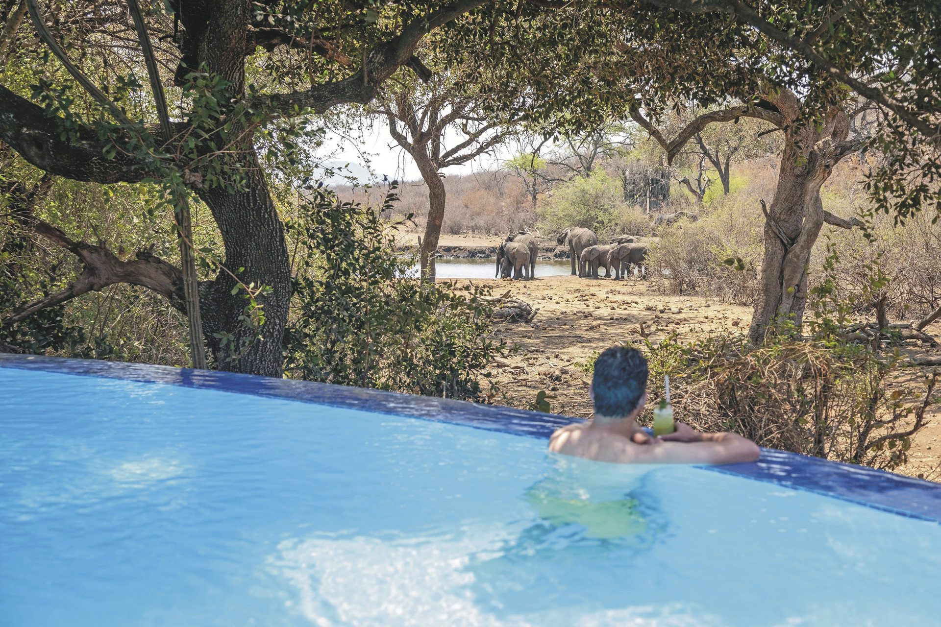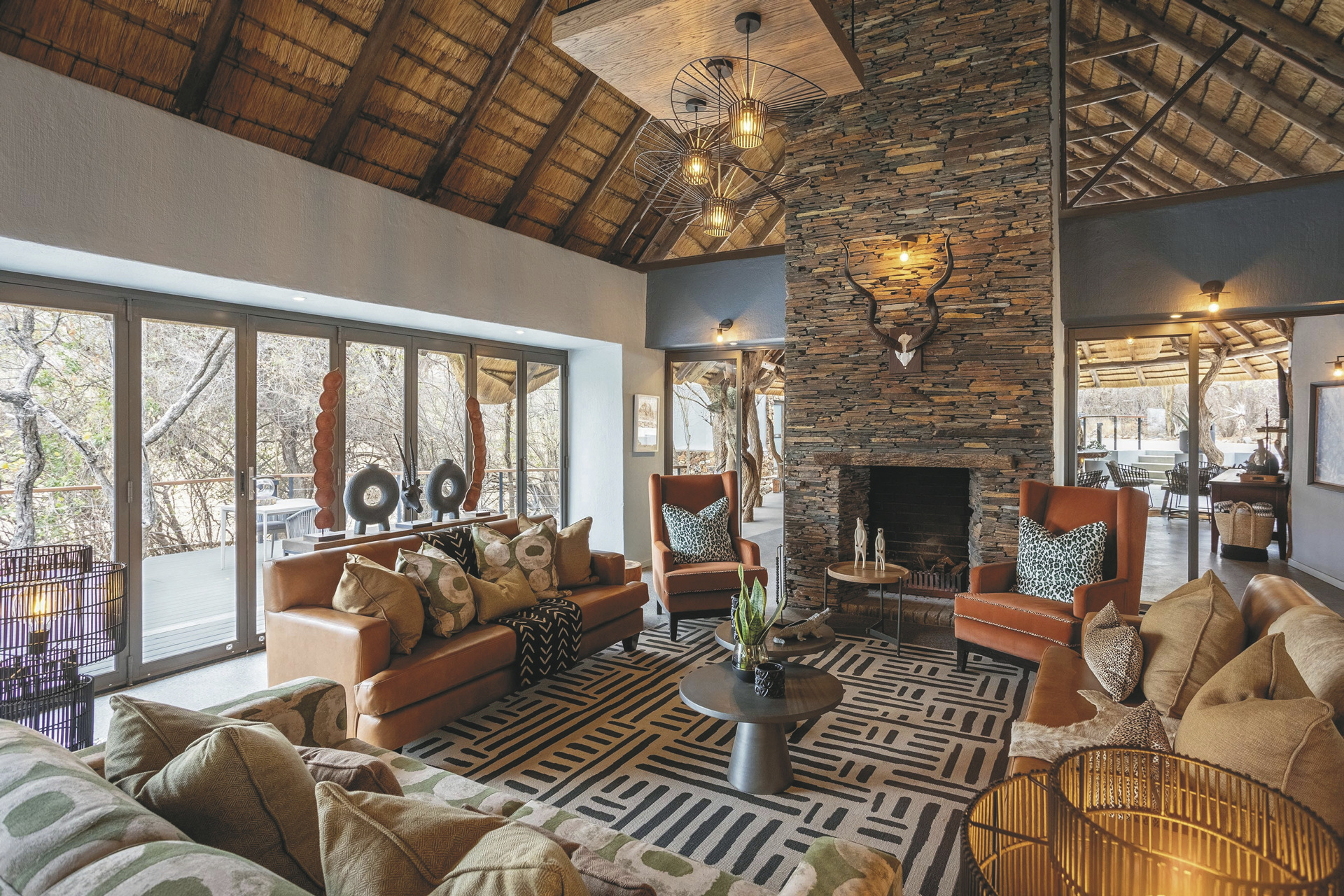 Das strohgedeckte Hauptgebäude der Lodge erstrahlt in modernem afrikanischem Stil, hier finden Sie auch kostenloses WLAN. Es verfügt über diverse gemütliche Sitzbereiche im Innen- und Außenbereich, einen eleganten Speisesaal, eine Bar, eine kleine Bibliothek, eine Kinderspielecke und einen herrlichen Pool mit Blick auf das Wasserloch, von dem aus Sie nur wenige Meter entfernt den Anblick und die Geräusche der Tiere genießen können. Etwas ganz Besonderes ist sicherlich das unterirdische Versteck am Wasserloch, wo Sie die verschiedenen Tiere aus ungewöhnlicher Perspektive ganz in Ruhe beobachten können. In der Boma, unter einem uralten Feigenbaum, oder auf der Terrasse werden nach Möglichkeit die Mahlzeiten serviert, feine Küche und eine Auswahl an Spitzenweinen erwarten Sie. Eine weitläufige Holzterrasse verbindet die verschiedenen Bereiche miteinander. Wer sportlich aktiv sein möchte, kann sich im hauseigenen Fitnesscenter verausgaben, hier finden Sie auch eine zweiten, kleineren Pool. Diverse Spa-Behandlungen können optional gebucht werden, diese genießen Sie dann auf der eigenen Terrasse. Eingeschlossene Aktivitäten: Pirschfahrten und Kinderprogramm (englisch & afrikaans).