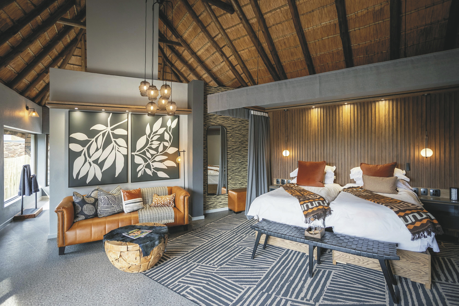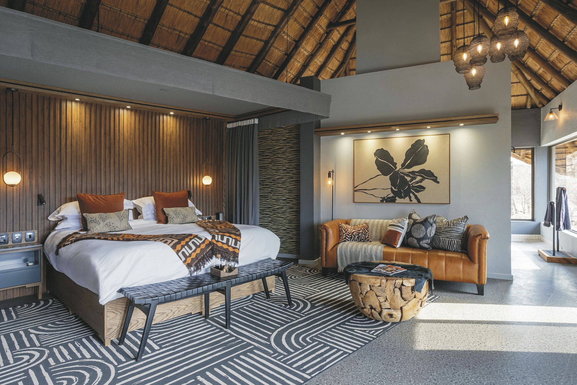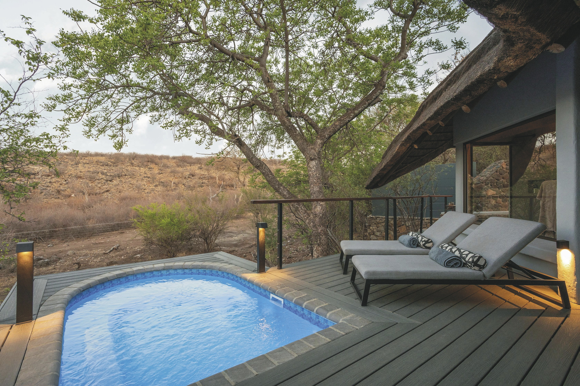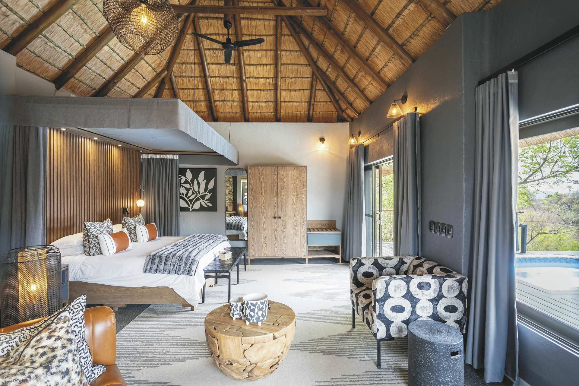 Die kleine, intime Lodge verfügt lediglich über 4 große Suiten und 2 exklusive Familiensuiten, die ebenfalls afrikanisch eingerichtet sind. Jede verfügt natürlich über ein eigenes Badezimmer mit Innen- und Außendusche, außerdem über eine Klimaanlage/Heizung, einen Kamin, der sowohl Schlaf- als auch Badezimmer beheizt, Minibar, Telefon, Moskitonetz, Fön, Safe und Tee-/Kaffeezubereiter. Von der großen, weitläufigen Terrasse genießen Sie den Blick in das Tal, das stets von einer Vielzahl von Wildtieren besucht wird.Die beiden Familiensuiten bestehen aus 2 Suiten, die durch einen Wohn-/Essbereich und eine Kitchenette miteinander verbunden sind. Wo immer möglich, werden versenkbare Türen und Fenster eingesetzt, um Raum zu schaffen und die Innenräume mit dem Busch zu verschmelzen. Bis Ende 2025 bekommen alle Suiten einen privaten Plunge Pool damit Sie Ihren privaten Bereich noch besser genießen können.