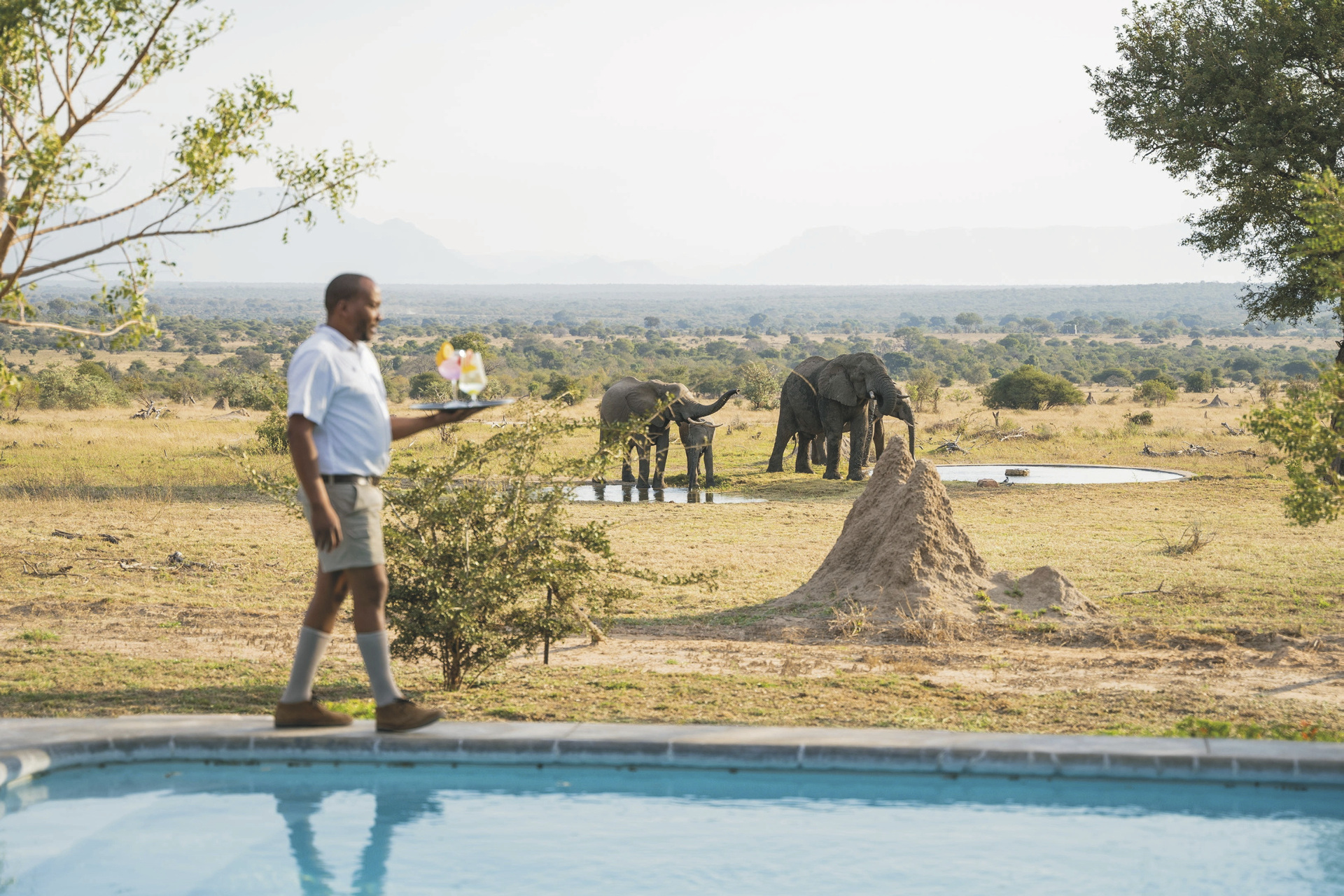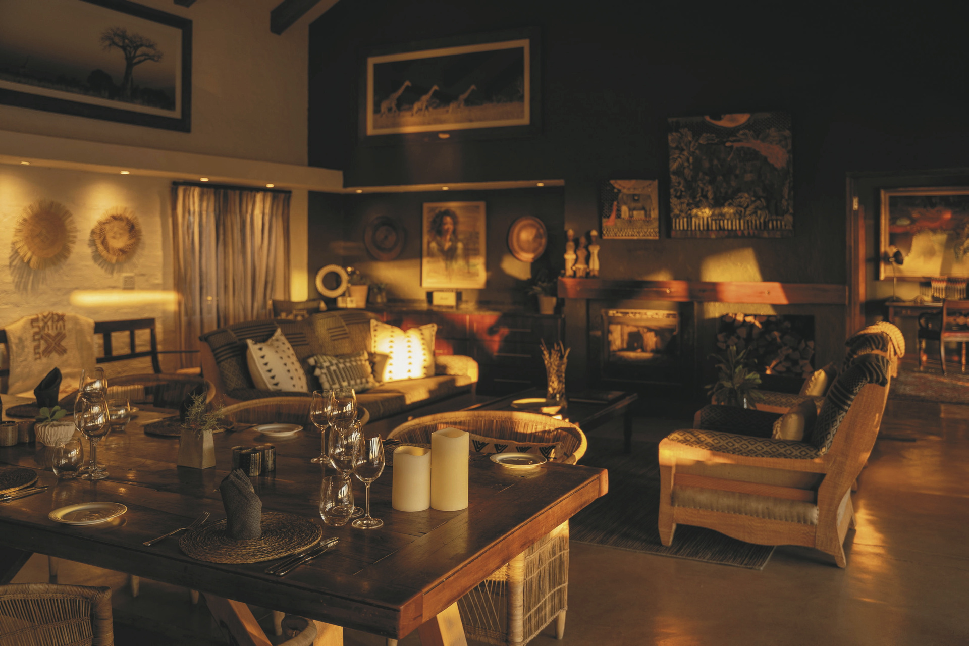 Das Haupthaus ist gemütlich wie ein privates Wohnhaus mit offener Küche, Lounge, Speisezimmer, Bar und TV-Zimmer eingerichtet. Licht durchflutet mit großen Fenstern, gemütlichen Sofas und Sitzecken auf der Terrasse lädt es zum Verweilen, Beobachten und Entspannen ein. Von der großen überdachten Terrasse, auf der bei gutem Wetter die Mahlzeiten eingenommen werden und dem Poolbereich hat man einen freien Blick auf das nahe gelegenen Wasserloch. Ein besonderer Höhepunkt sind immer die Abendessen in der Boma, rund um ein flackerndes Feuer unter den Sternen Afrikas. Eingeschlossene Aktivitäten: Pirschfahrten.