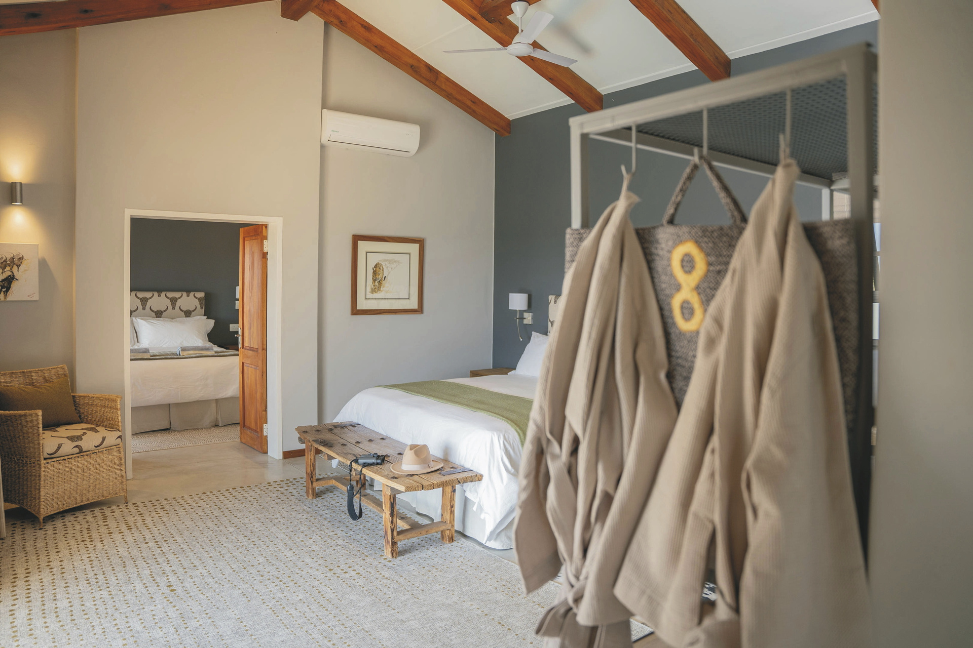 Die insgesamt 8 hellen und im modernen Safaristil eingerichteten Zimmer liegen alle direkt am Wildzaun und bieten somit einen tollen Blick durch die bodentiefen Fenster in die Savanne. Jedes verfügt über ein eigenes Badezimmer mit Außendusche, Klimaanlage, Ventilator, WLAN, Minibar, Safe und über eine überdachte Terrasse mit Plunge-Pool. Die 2 Familienzimmer haben ein zweites Badezimmer mit Innendusche und 4 Personen komfortabel Platz.