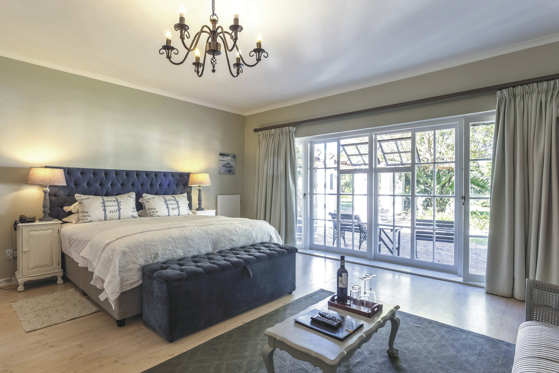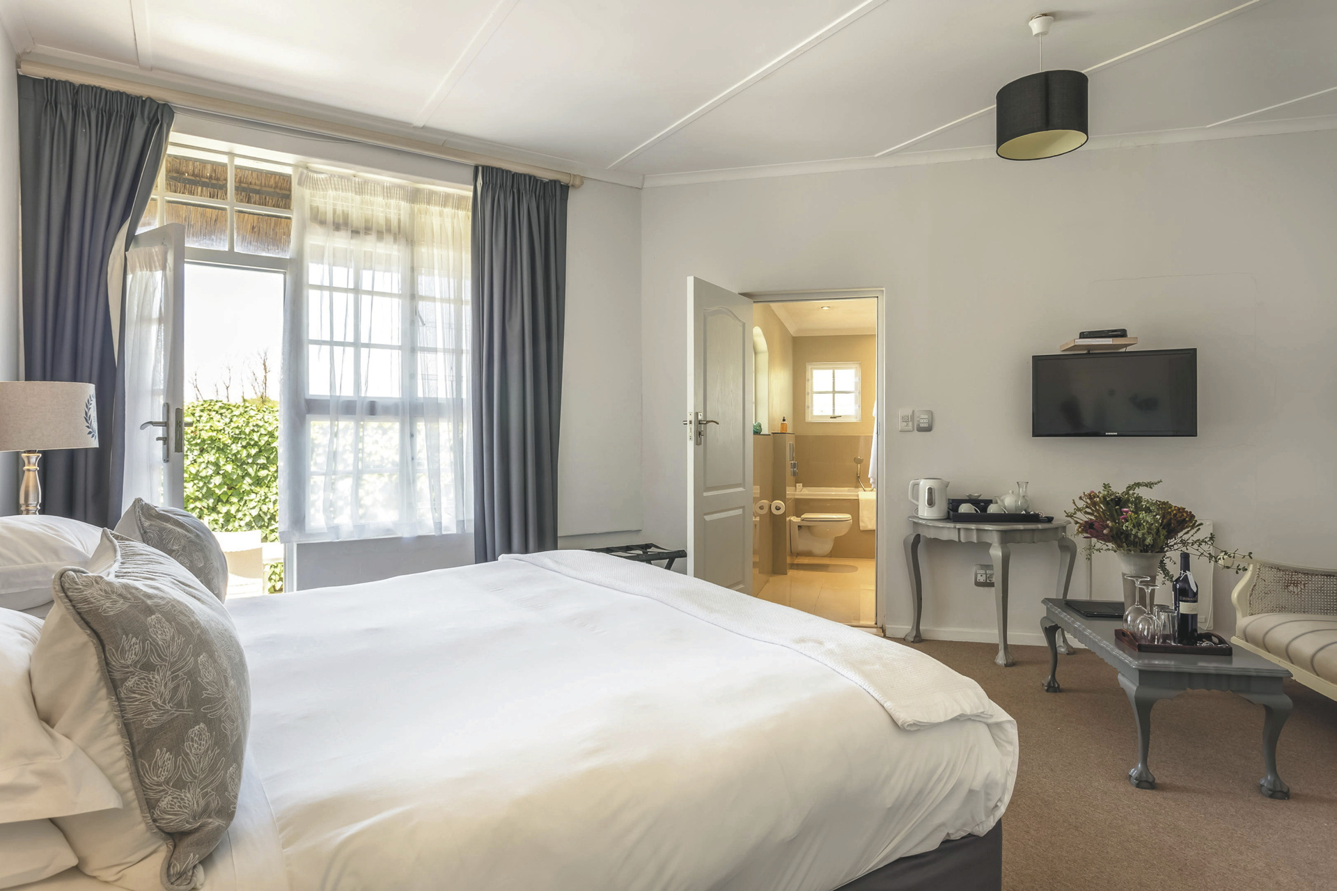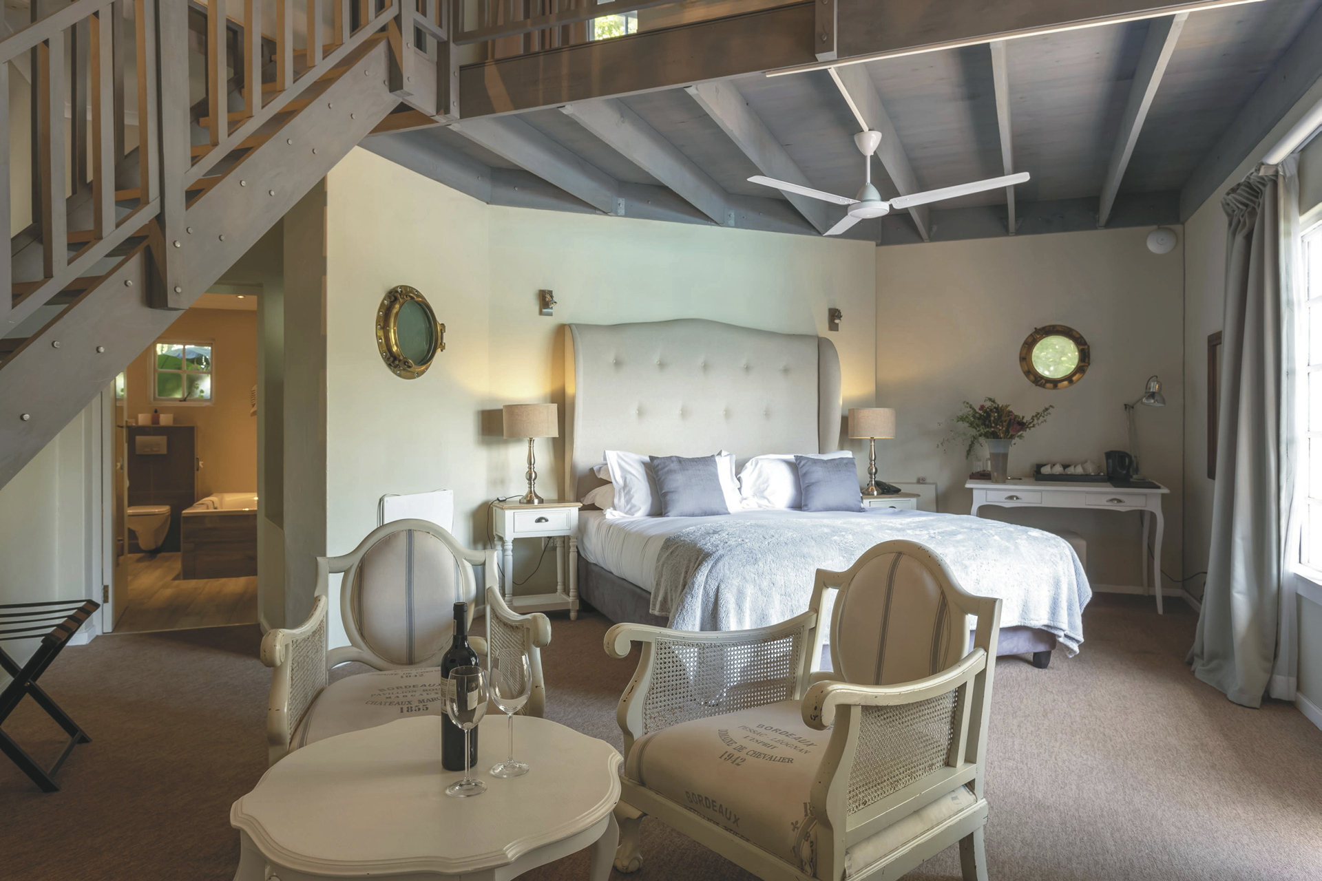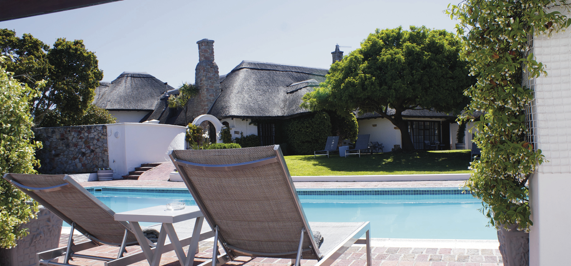 Die Lodge bietet 17 elegante und moderne Zimmer und Suiten im Haupt- oder Nebengebäude mit Balkon oder Terrasse. Alle mit eigenem Bad mit Dusche oder Badewanne; TV, Telefon, Ventilator, Fön, Safe, Tee-/Kaffeezubereiter, kostenlosem WLAN, Minibar; Heizung und elektrischen Heizdecken für kalte Winterabende. Die Gartensuiten sind größer als die Gartenzimmer und bieten einen Kamin. Die Meerblicksuite liegt in der oberen Etage. Die geräumige Executive-Suite verfügt zusätzlich über einen großen Loungebereich und ein Ankleidezimmer.Für Familien mit Kindern gibt es die Luxus-Familiensuite mit zwei Schlafzimmern, ein Gartenzimmer mit Schlafmöglichkeit für 2 Kinder im Loft sowie eine Garten-Familiensuite mit zwei Schlafräumen und einem gemeinsamen Badezimmer.