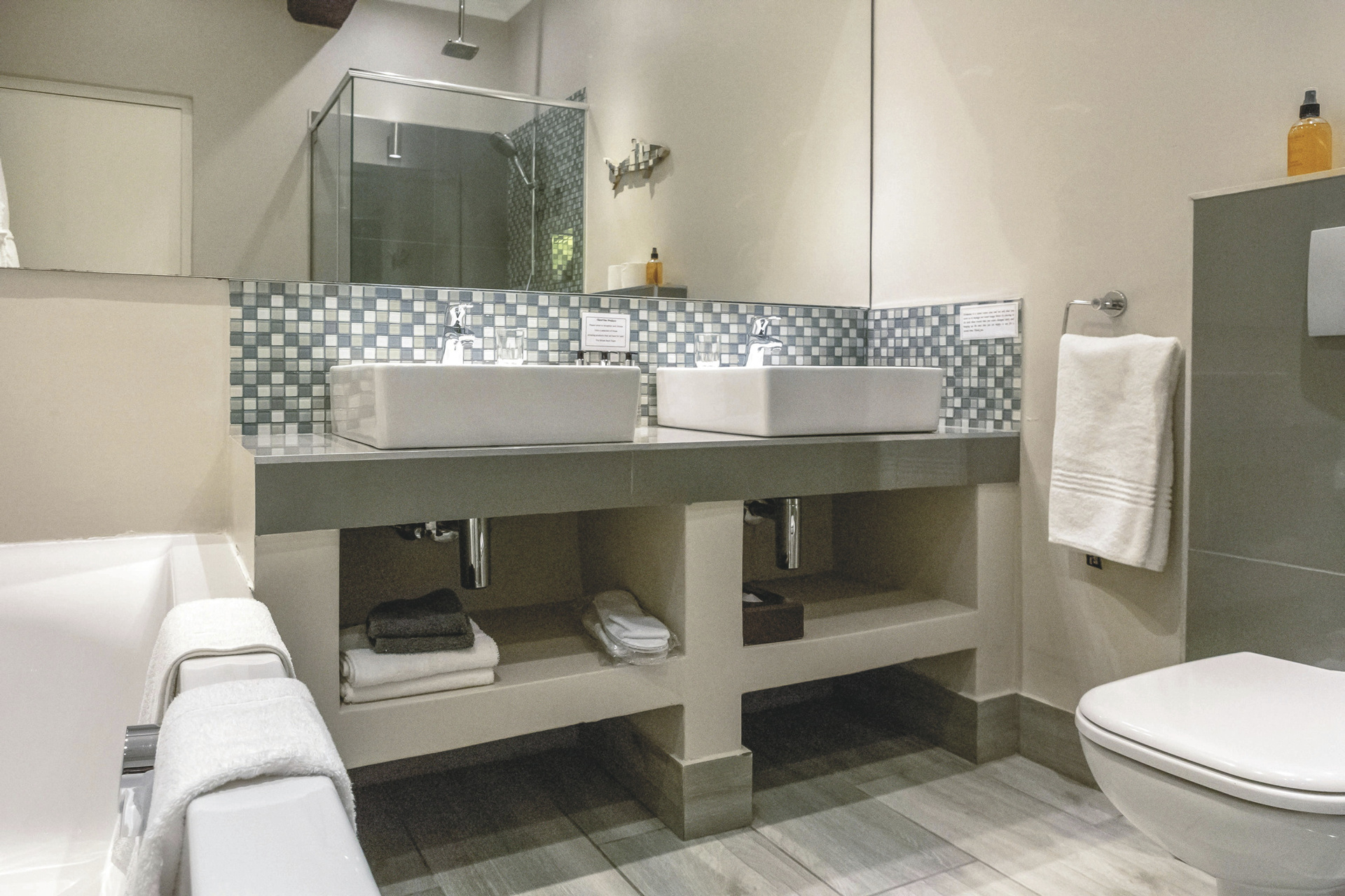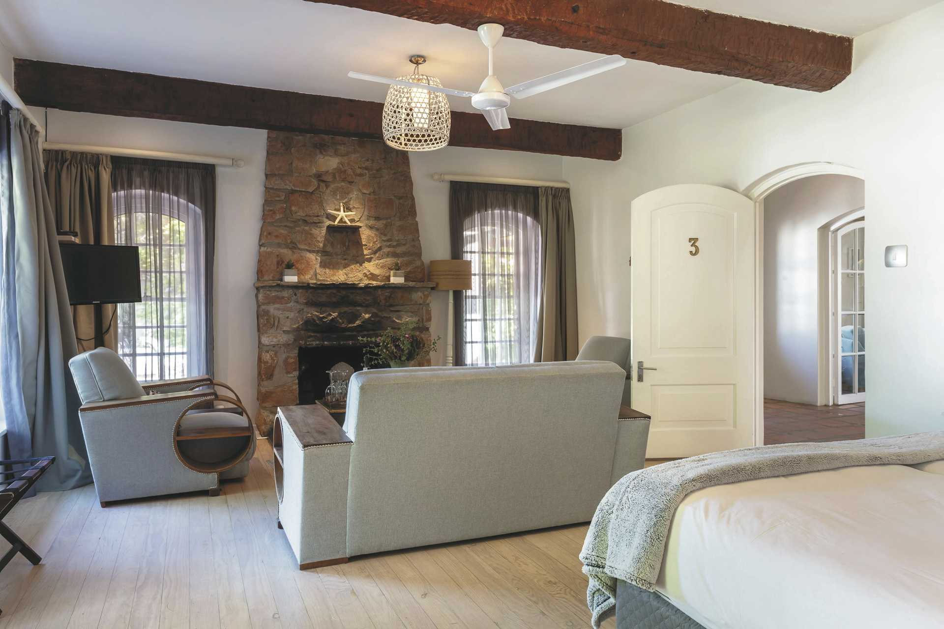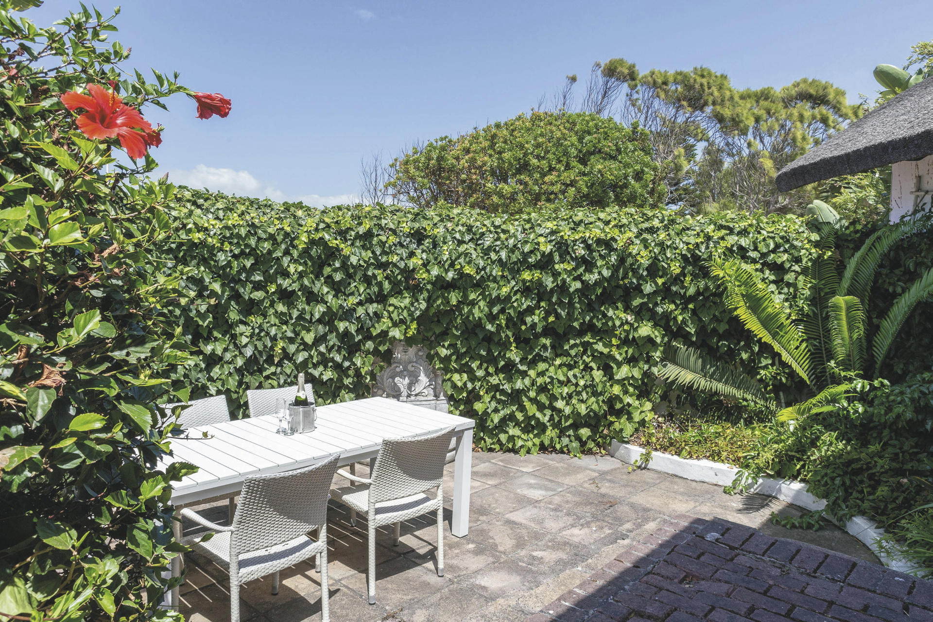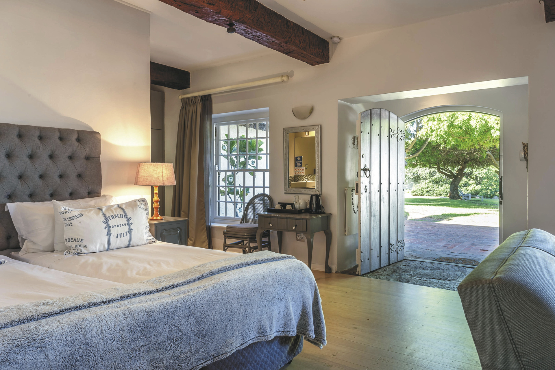 Die Lodge bietet 17 elegante und moderne Zimmer und Suiten im Haupt- oder Nebengebäude mit Balkon oder Terrasse. Alle mit eigenem Bad mit Dusche oder Badewanne; TV, Telefon, Ventilator, Fön, Safe, Tee-/Kaffeezubereiter, kostenlosem WLAN, Minibar; Heizung und elektrischen Heizdecken für kalte Winterabende. Die Gartensuiten sind größer als die Gartenzimmer und bieten einen Kamin. Die Meerblicksuite liegt in der oberen Etage. Die geräumige Executive-Suite verfügt zusätzlich über einen großen Loungebereich und ein Ankleidezimmer.Für Familien mit Kindern gibt es die Luxus-Familiensuite mit zwei Schlafzimmern, ein Gartenzimmer mit Schlafmöglichkeit für 2 Kinder im Loft sowie eine Garten-Familiensuite mit zwei Schlafräumen und einem gemeinsamen Badezimmer.