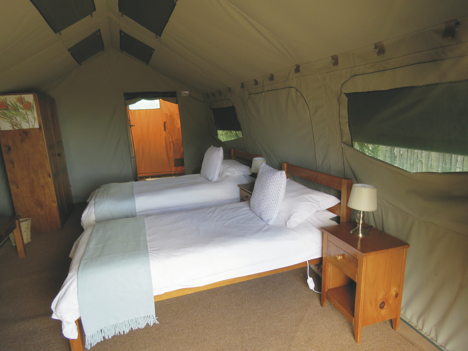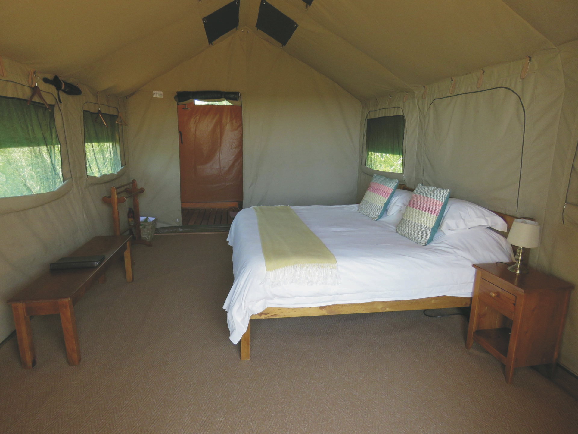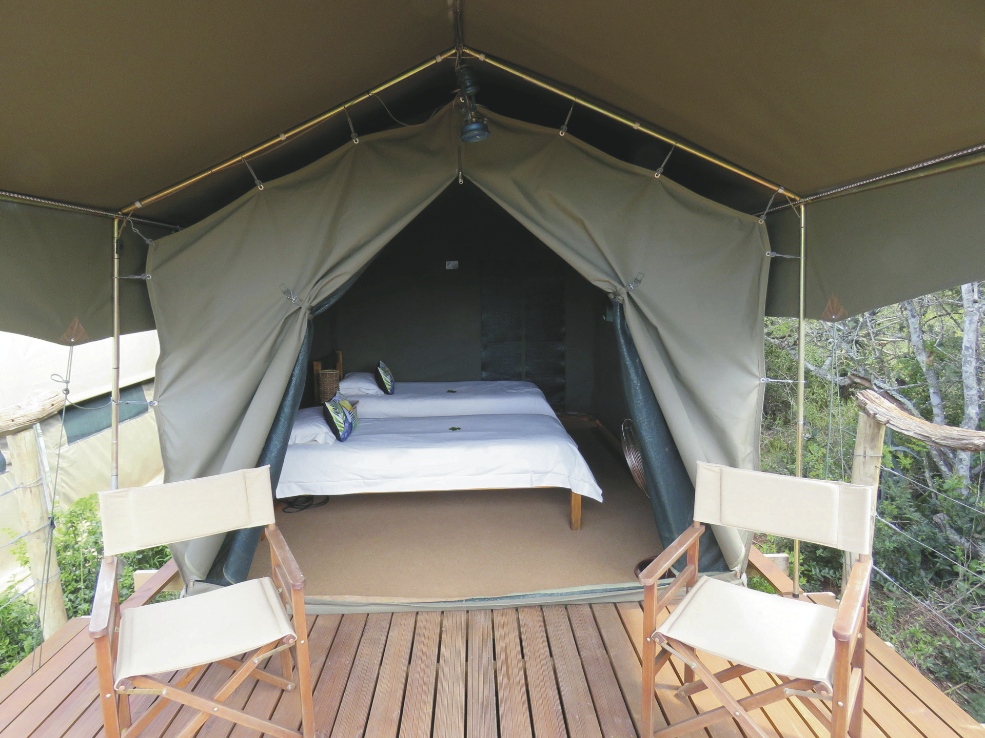 Die 10 auf erhöhten Holzplattformen gebauten Safarizelte sind liebevoll in den Busch integriert, die meisten blicken über das Tal. Alle verfügen über ein eigenes Bad, Tee-/Kaffeezubereiter, Fön, Ventilator, Safe und eine Terrasse. Die 2 Familieneinheiten bestehen jeweils aus 2 Zelten und einem gemeinsamen Bad und einer verbindenden Terrasse.