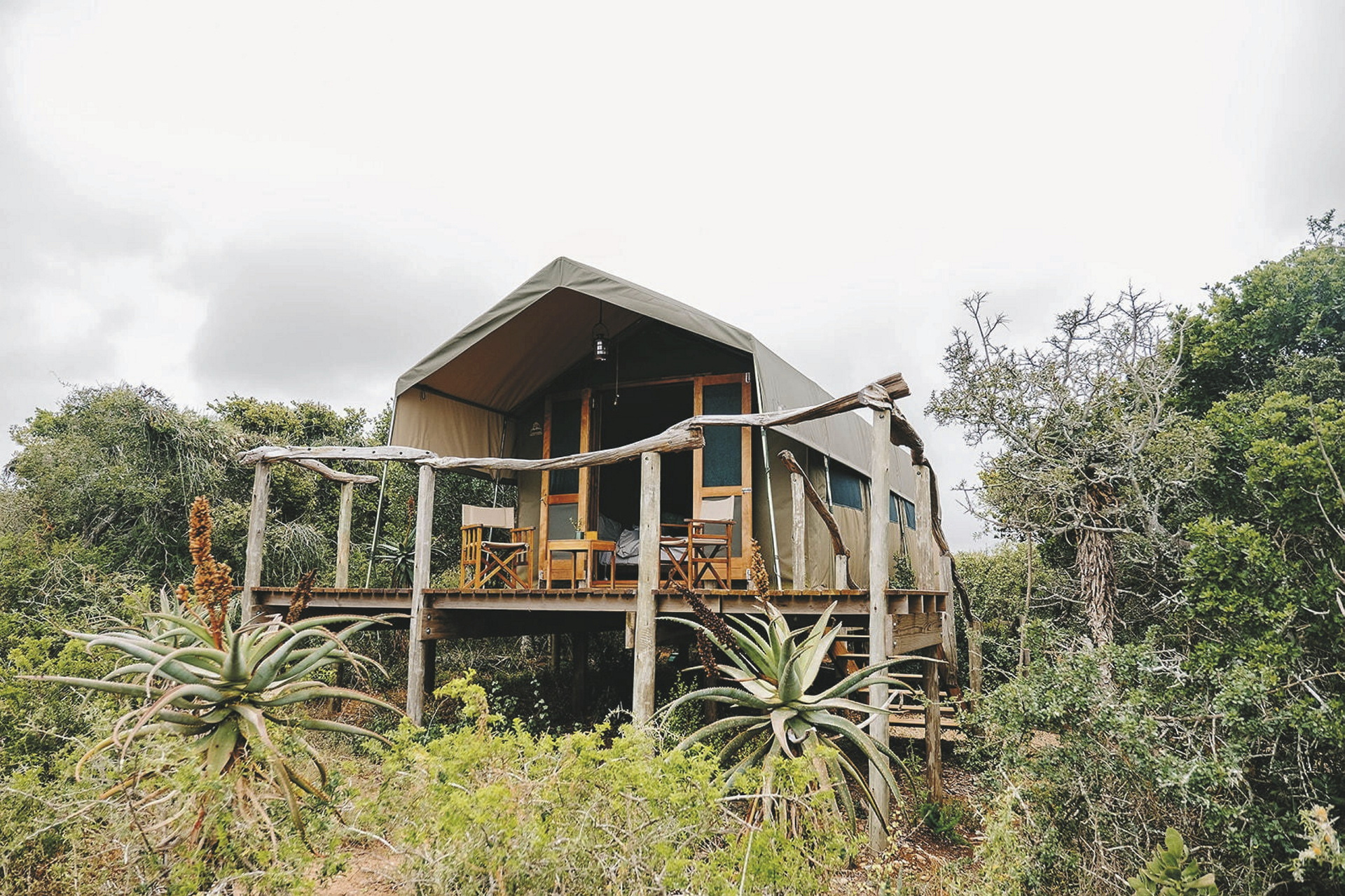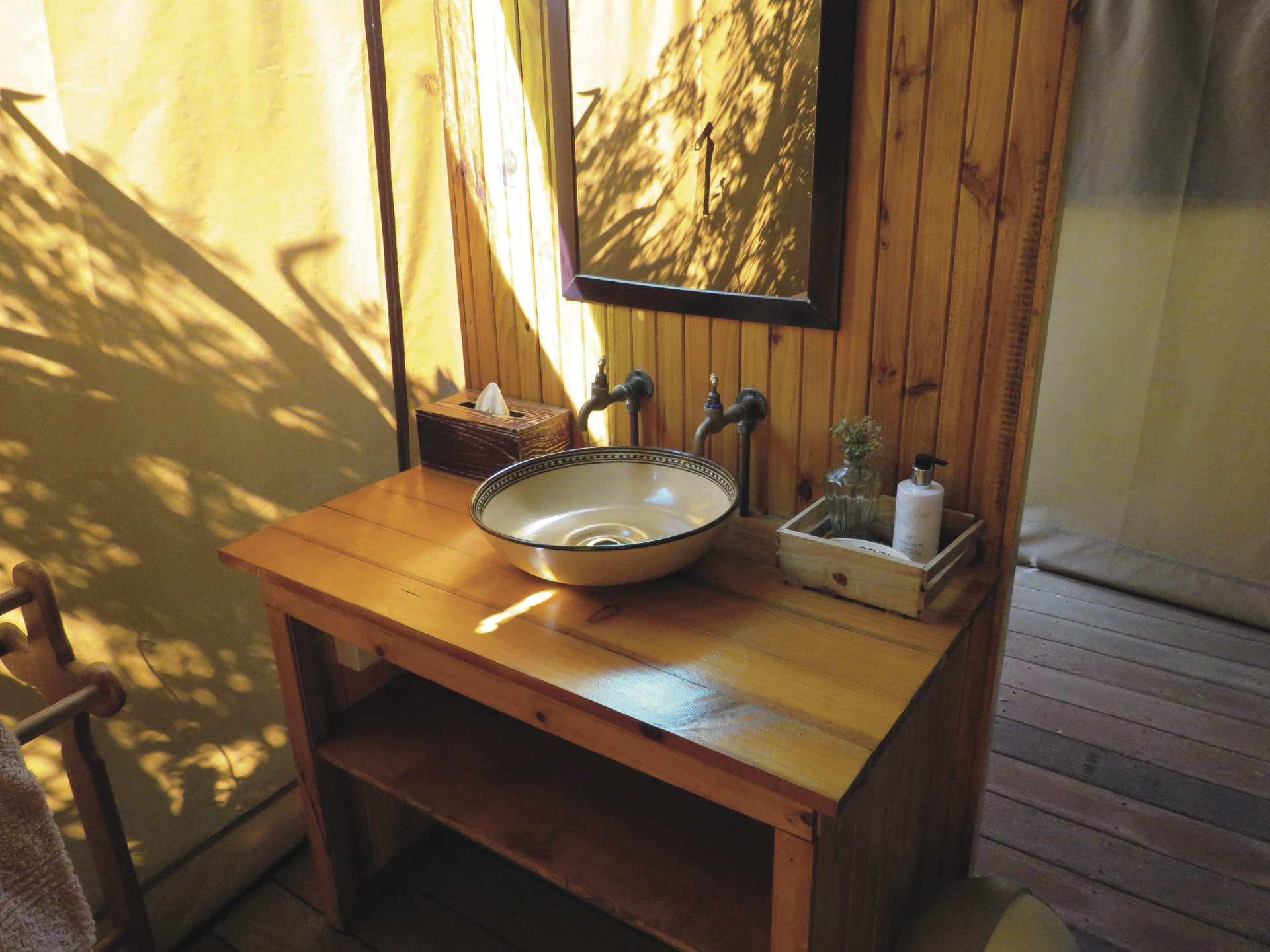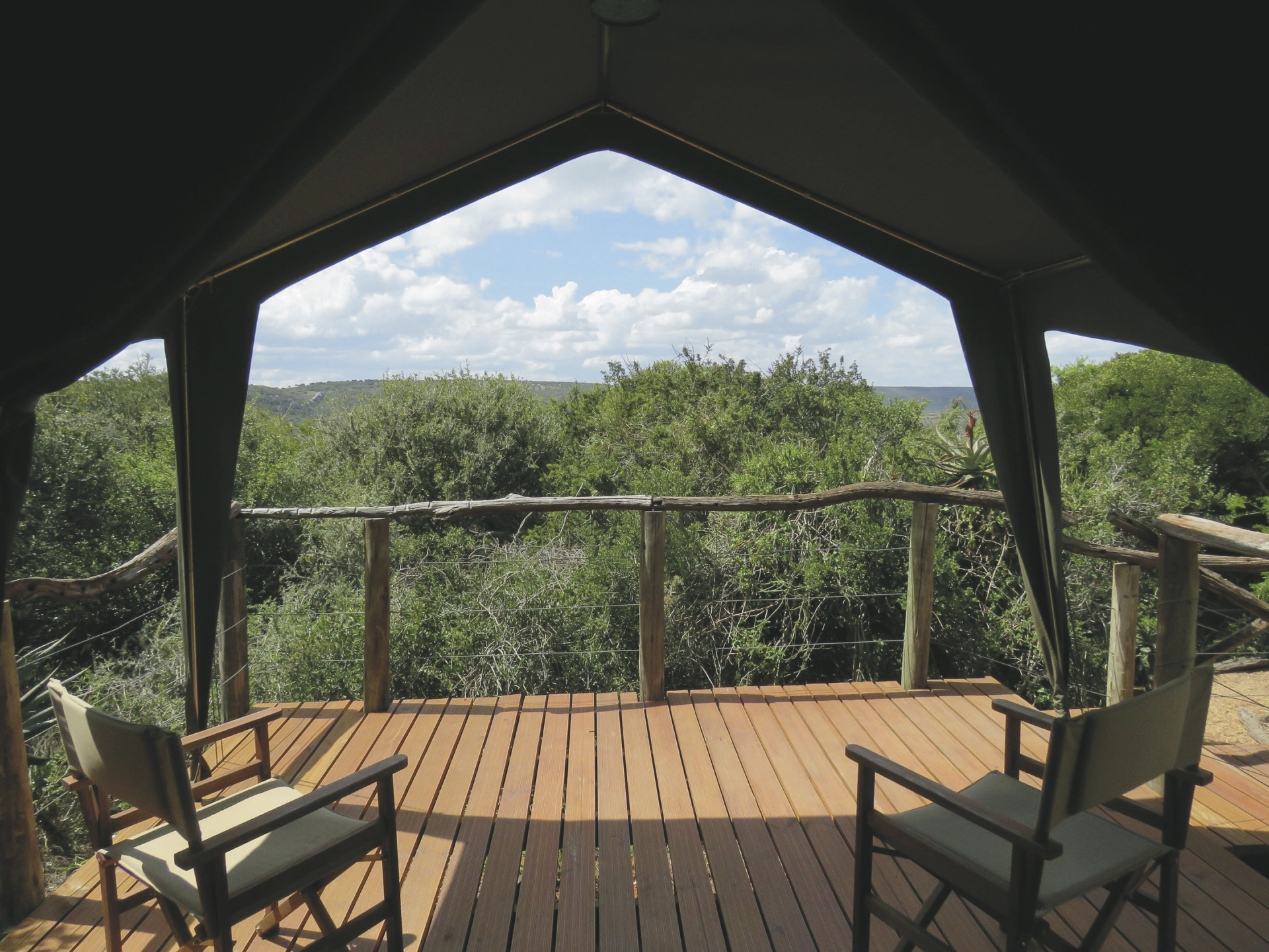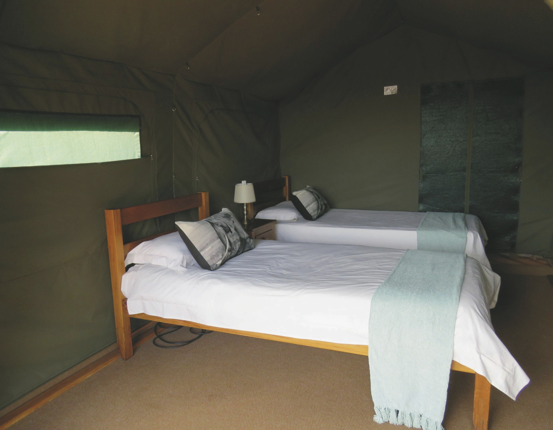Die 10 auf erhöhten Holzplattformen gebauten Safarizelte sind liebevoll in den Busch integriert, die meisten blicken über das Tal. Alle verfügen über ein eigenes Bad, Tee-/Kaffeezubereiter, Fön, Ventilator, Safe und eine Terrasse. Die 2 Familieneinheiten bestehen jeweils aus 2 Zelten und einem gemeinsamen Bad und einer verbindenden Terrasse.