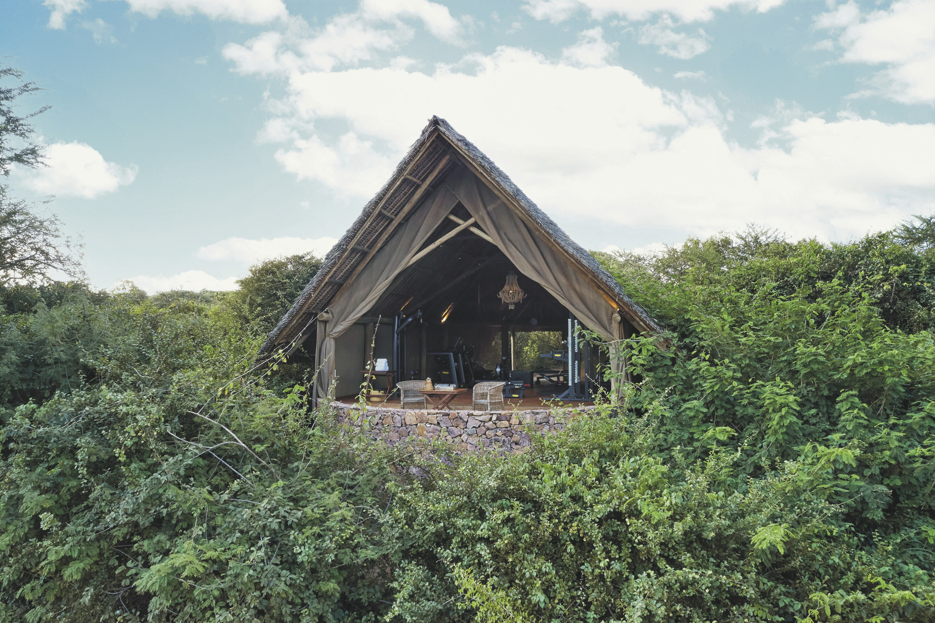 10 auf Plattformen errichtete Safarizelte mit Makutidach, Bad, Fön, Safe, Ventilator und überdachter Veranda. Beobachten Sie von hier aus die Tiere im Busch, die auf der Suche nach Wasser vorbeiziehen.
