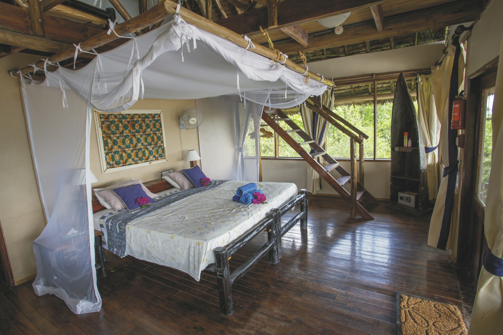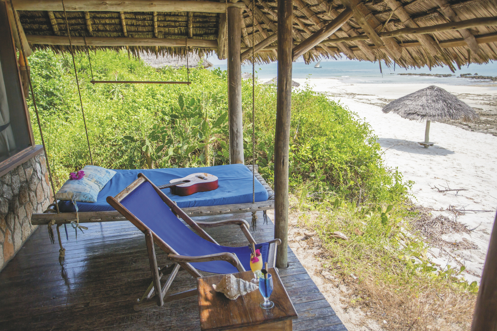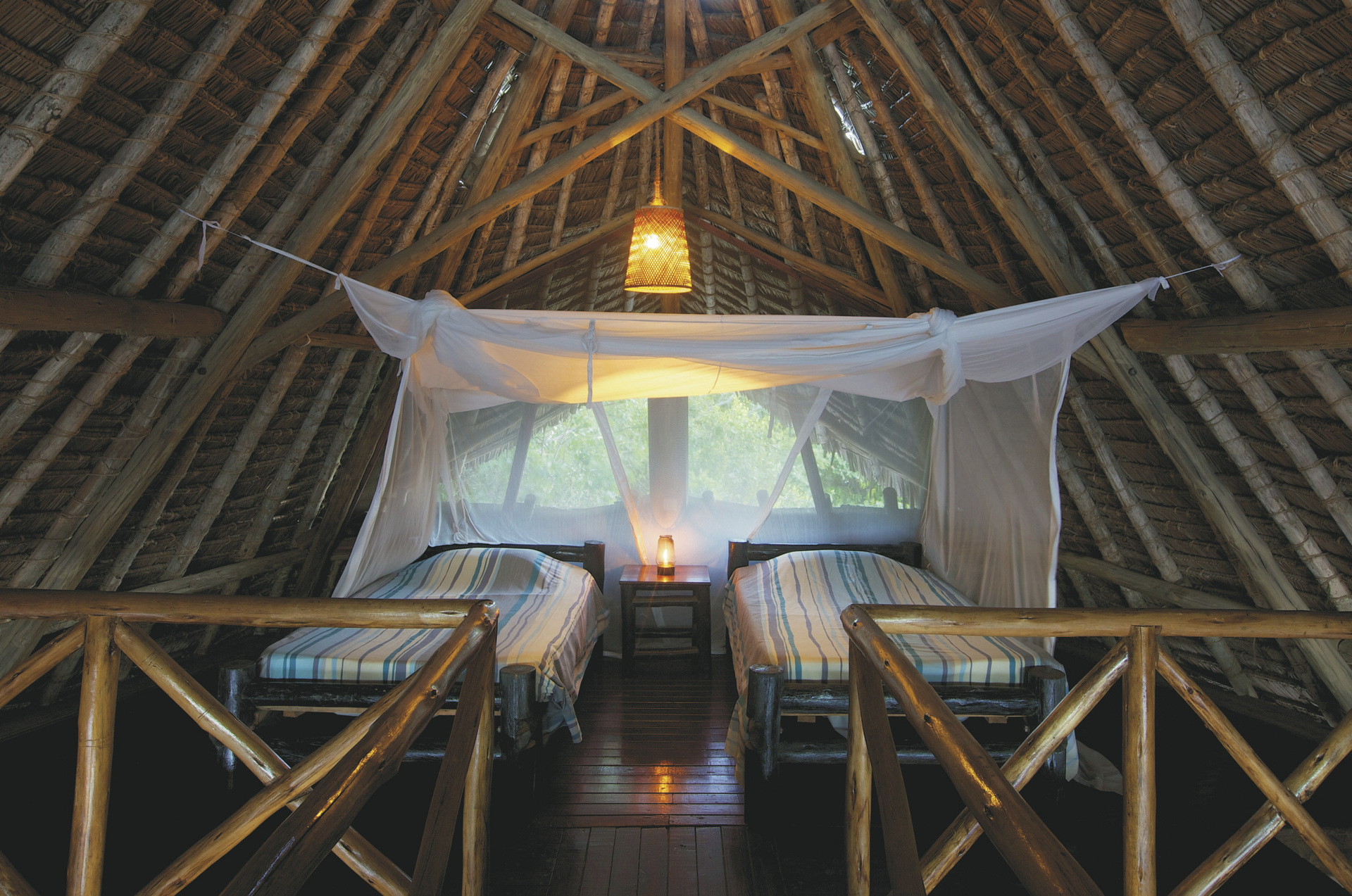 Die 12 geräumigen Bandas im rustikalen Stil erstrecken sich über zwei Ebenen. Im Erdgeschoß befindet sich das Bad und zwei Einzelbetten oder ein Doppelbett. Von der Veranda mit Meerlick haben Sie direkten Zugang zum Strand. Das Loft im Obergeschoss hat zwei Einzelbetten, ideal für ältere Kinder, und einen Balkon.