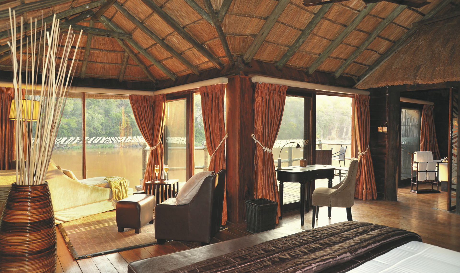 12 luxuriöse Zimmer in reetgedeckten Fachwerkchalets mit privater Aussichtsplattform und kleinem Pool. Jedes Zimmer ist mit Safari-Antiquitäten und modernen Möbeln aus Leder und Rattan eingerichtet.