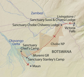 Auf dieser exklusiven Flug-Safari beginnt Ihre Reise in Livingstone, wo die majestätischen Viktoria Wassserfälle ein spektakuläres Naturerlebnis bereithalten. Anschließend führt Sie die Route in den Chobe Nationalpark, das Paradies der Elefanten und Heimat einer außergewöhnlichen Tierwelt entlang des Chobe Flusses. Den krönenden Abschluss bildet das Okavango Delta, eine grüne Oase inmitten der Kalahari. Dank seines permanenten Wasser- und Nahrungsreichtums offenbart sich hier eine unvergleichliche Vielfalt an Land- und Wassersäugetieren sowie eine faszinierende Vogelwelt. Während der gesamten Reise wohnen Sie in den exklusiven Camps der A&K Sanctuary Retreats – Orte, die höchsten Komfort mit authentischem Safari-Flair vereinen.