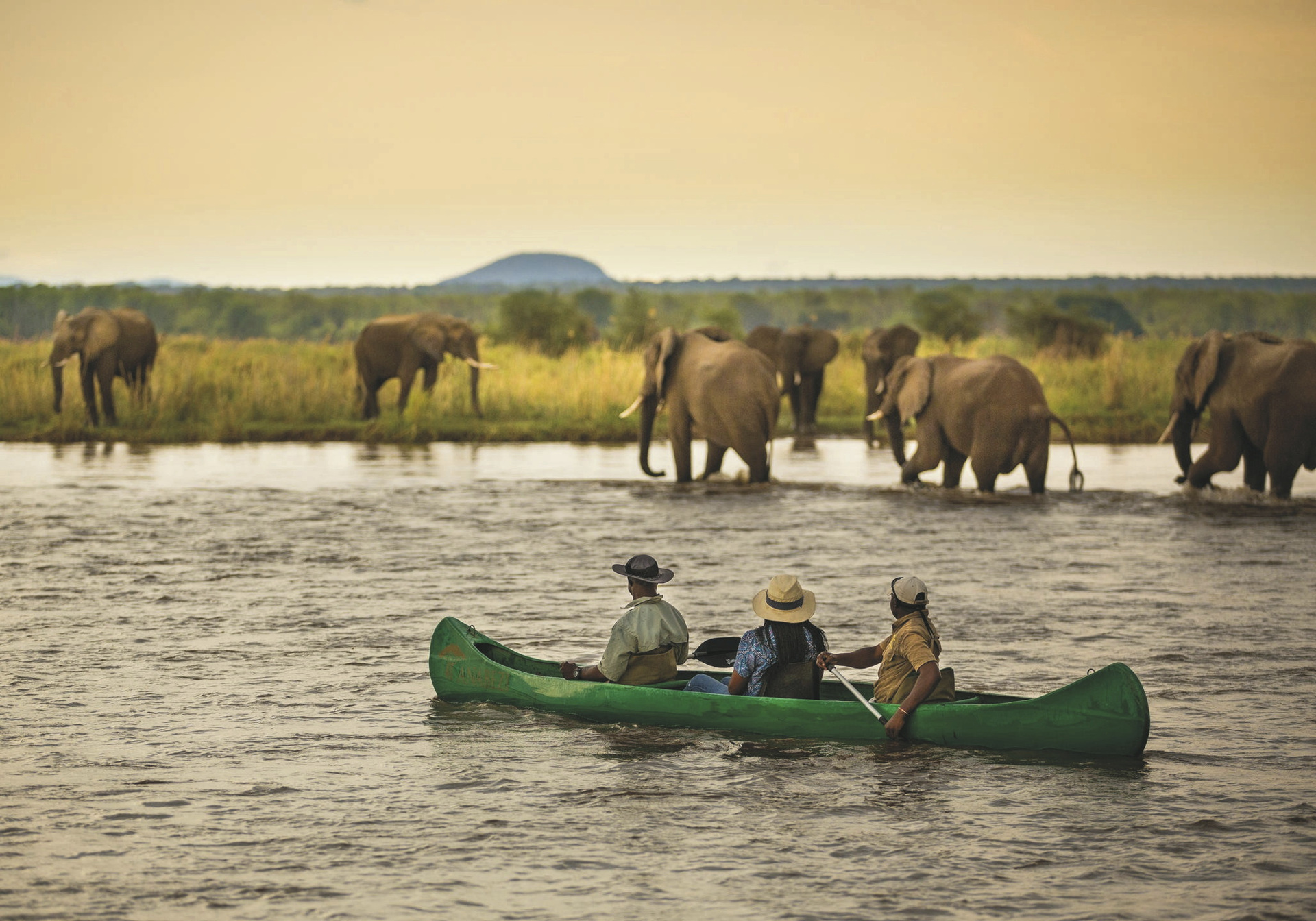 1/20©Dulini Anabezi / Rachel RebiboElefanten im Zambezi Fluss vor dem Anabezi Camp