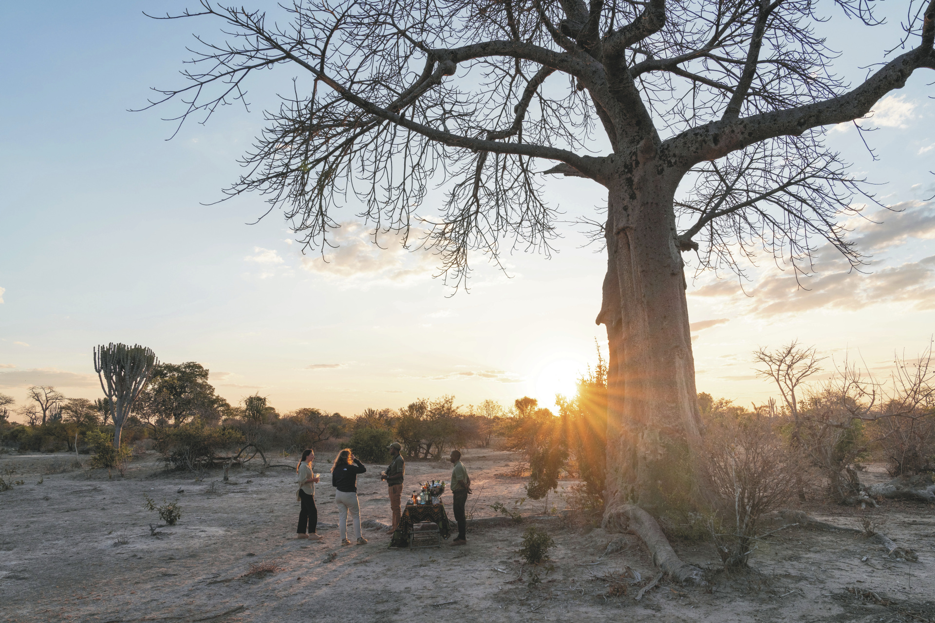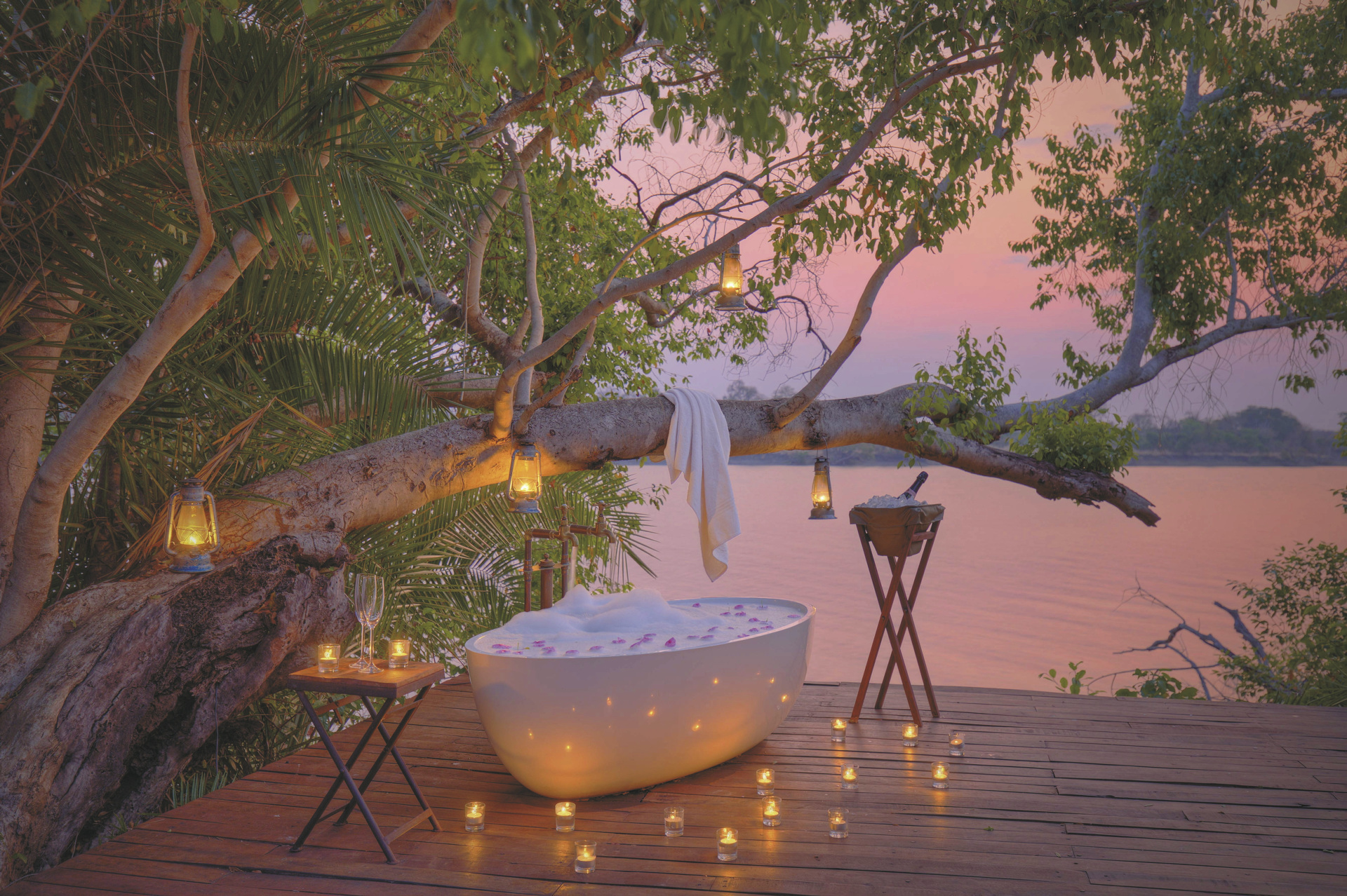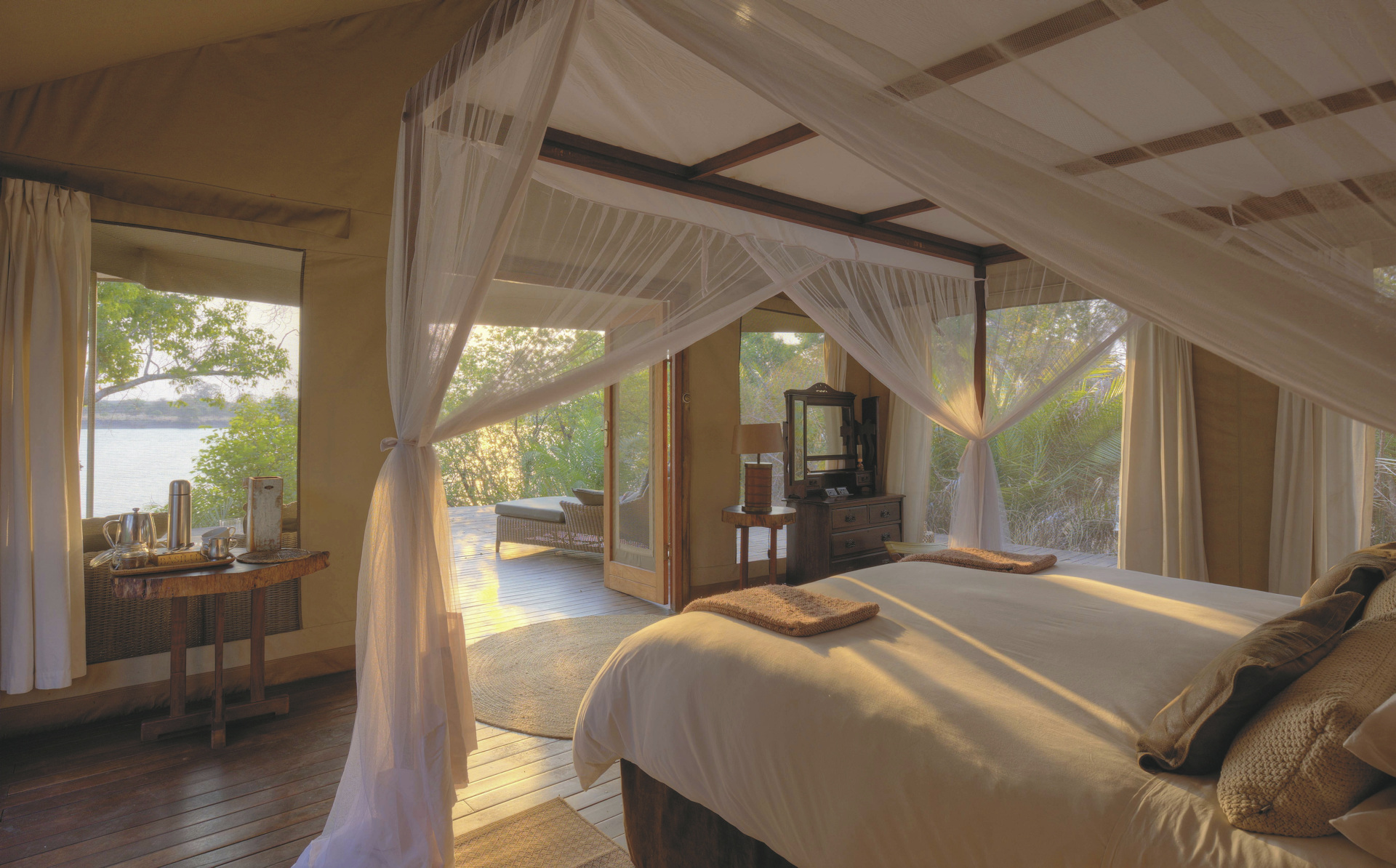 Die luxuriösen Zelte liegen direkt am Fluss und bieten einen weiten Blick über die Landschaft. Sie verfügen über großzügige Schlafbereiche mit Kingsize-Betten, offene Badezimmer mit Doppelwaschbecken aus lokalen Materialien sowie einer Innendusche. Einige Zelte bieten zusätzlich eine Außendusche oder eine freistehende Badewanne auf der privaten Terrasse – ideal für ein entspannendes Bad bei Sonnenuntergang. Moskitonetze und solarbetriebene Stromversorgung sorgen für Komfort und Sicherheit.