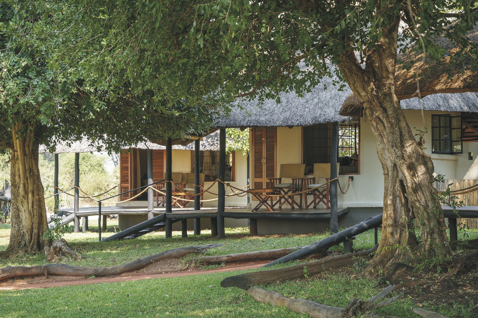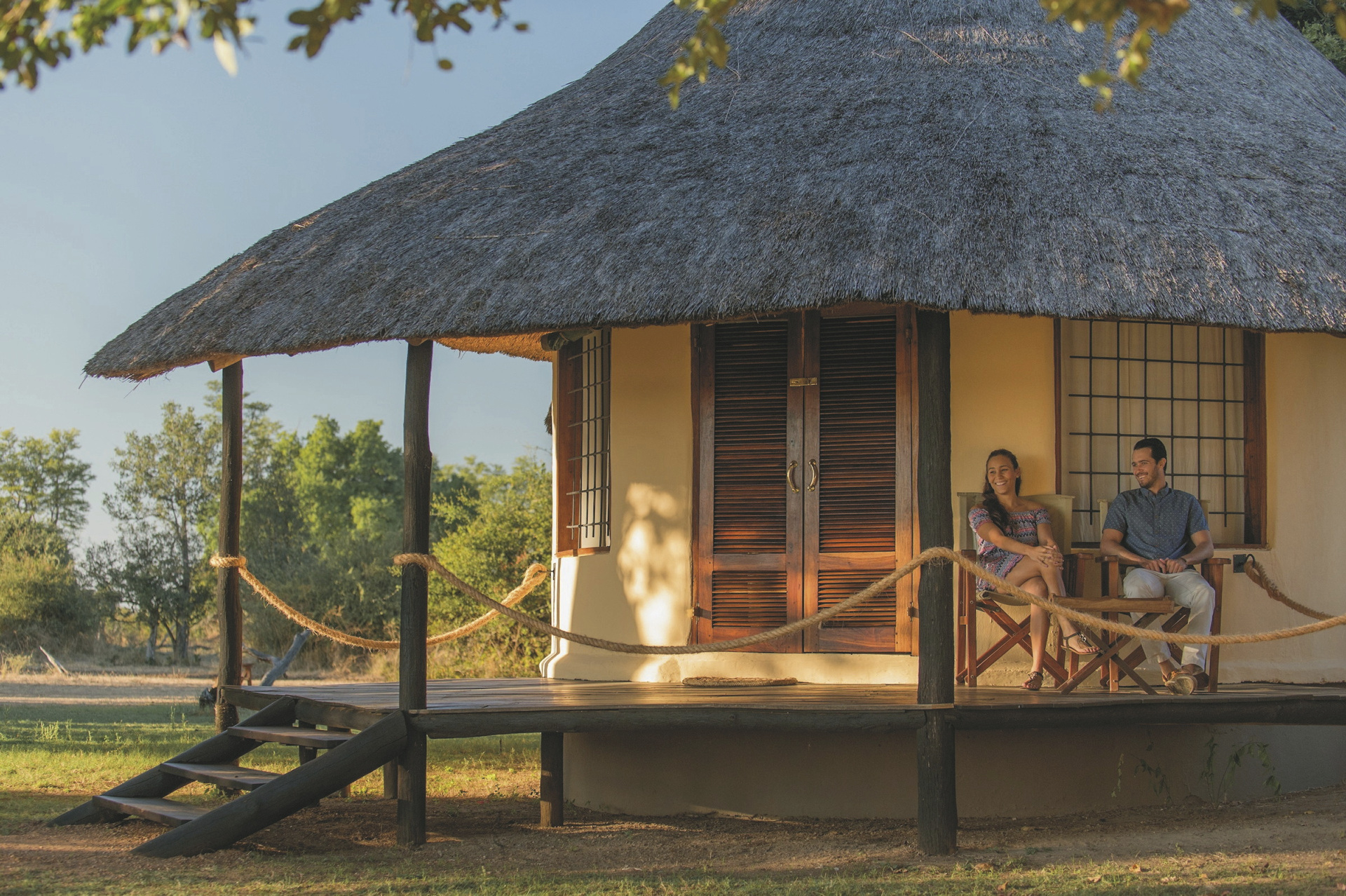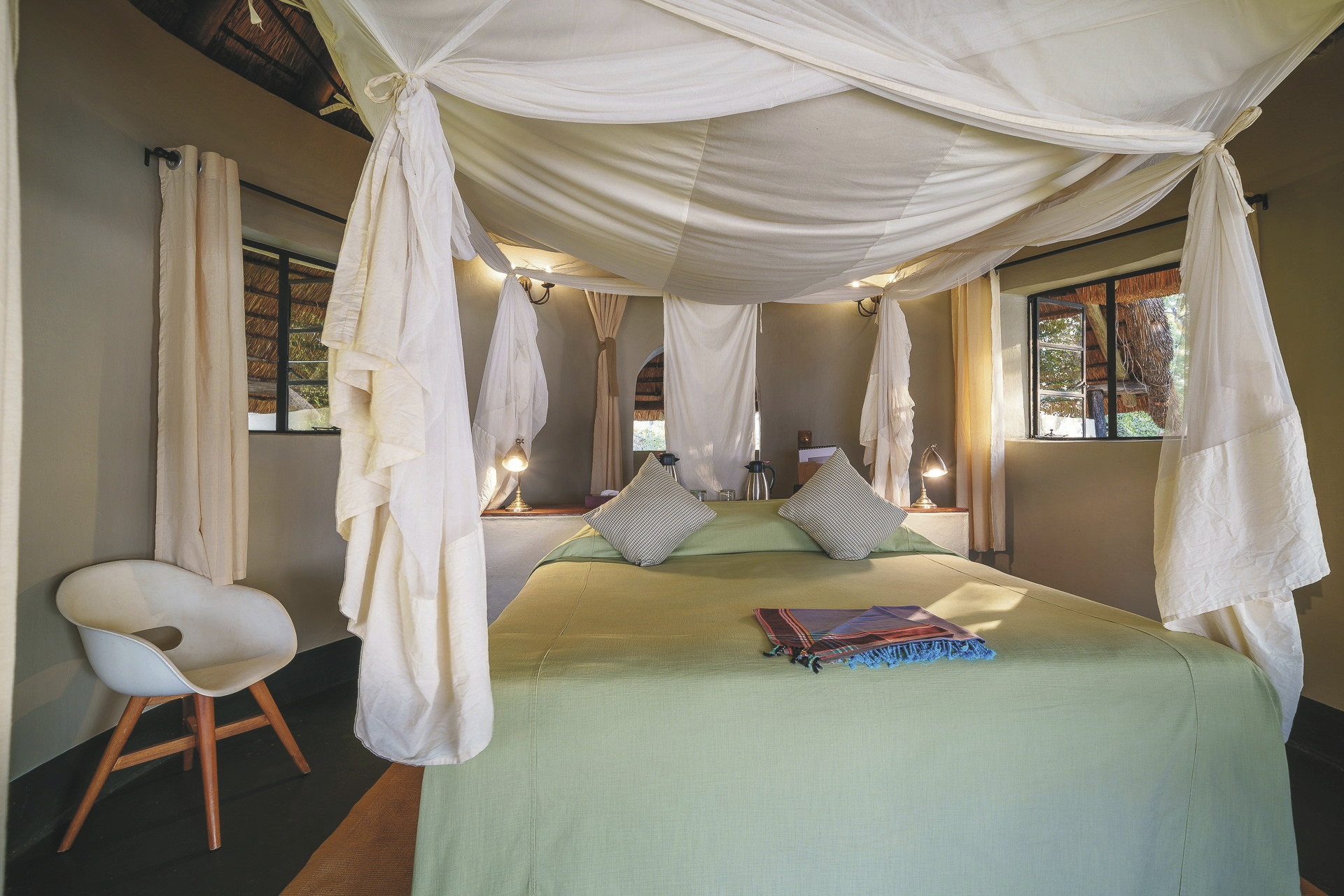 Die 6 strohgedeckten Rondavels verfügen große Betten mit Moskitonetzen und ein eigenes Bad mit DU/WC sowie eine Terrasse mit Sitzgelegenheiten. Jedes Rondavel hat einen tollen Blick auf den Luangwa Fluss.