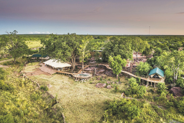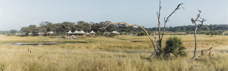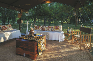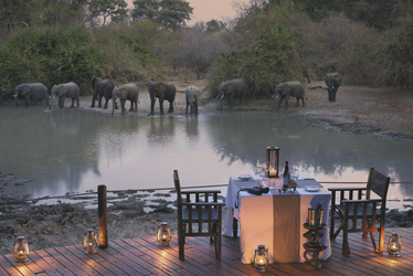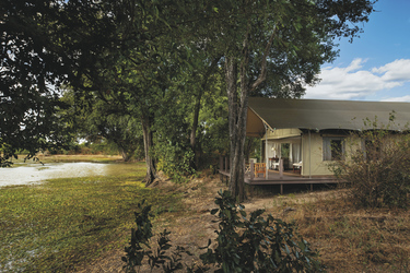 Das offene, nicht eingezäunte Camp liegt idyllisch an einem von Wasser umgebenen Ort und lädt mit seiner ruhigen Lage zu entspannten Tierbeobachtungen direkt vom komfortablen Sessel aus ein. Immer wieder ziehen Elefanten durch das Camp...