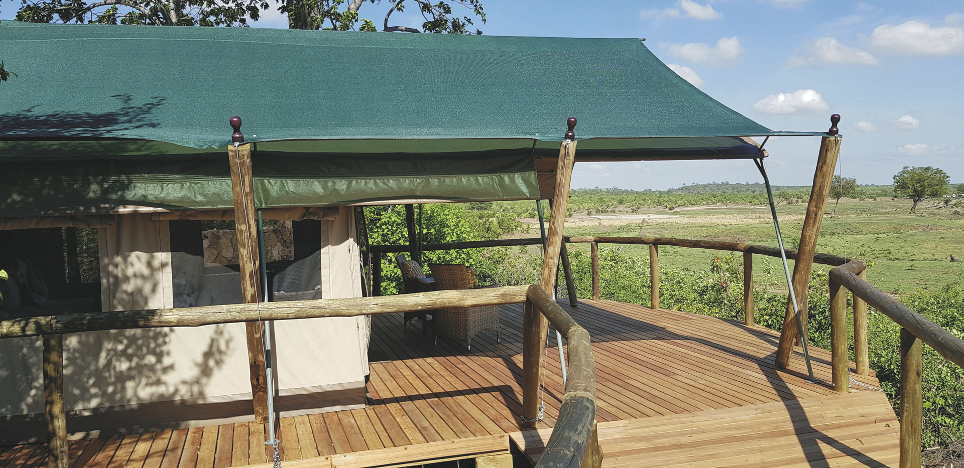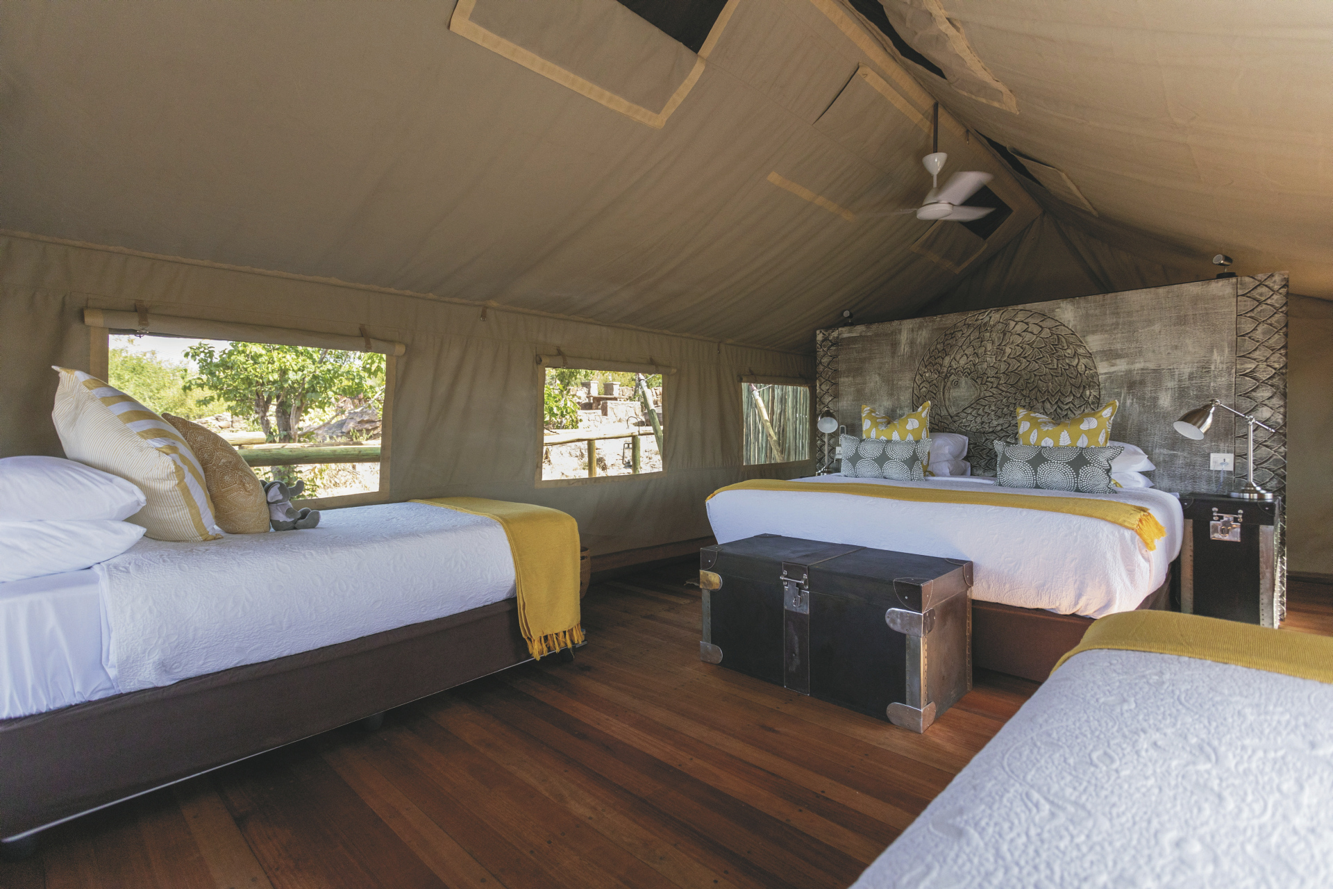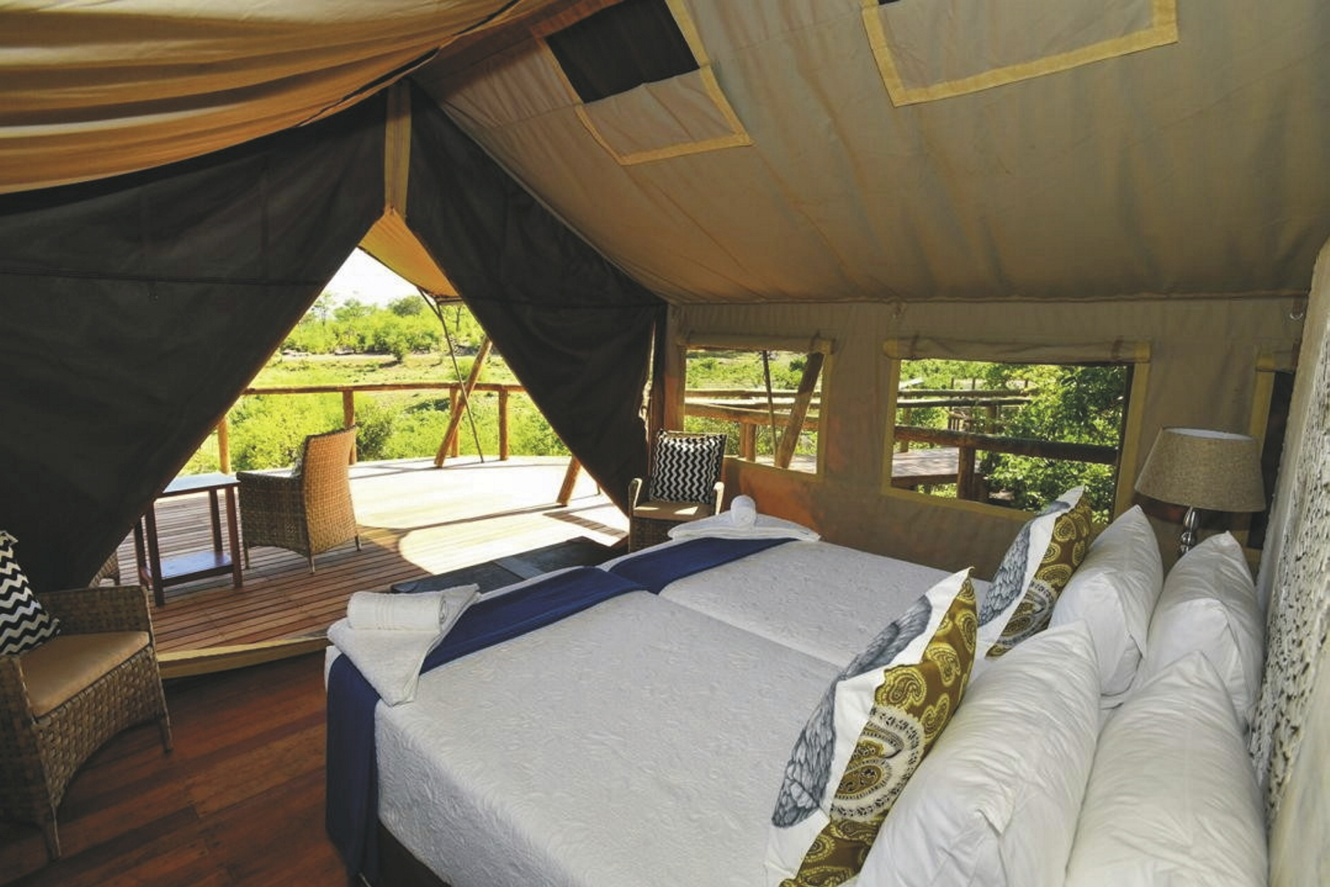 Die 8 Safarizelte sind erhöht auf Holzplattformen erbaut und versprühen viel afrikanisch-rustikalen Charme und vermitteln die Nähe zur Natur. Alle verfügen über ein eigenes, modernes Bad; Ventilator und eine überdachte Terrasse von der Sie, durch die exponierte Lage, gefahrlos und nah die Tiere beobachten können. Ein Zelt ist für Familien mit zwei Kindern geeignet.