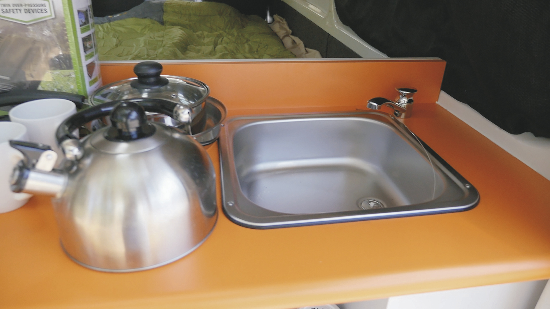 • Heckküche mit Stauraum und Spüle mit Kaltwasser (Handpumpe)