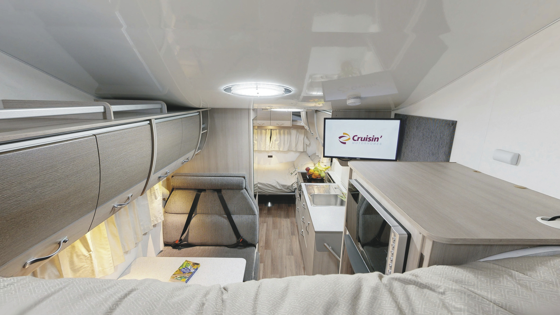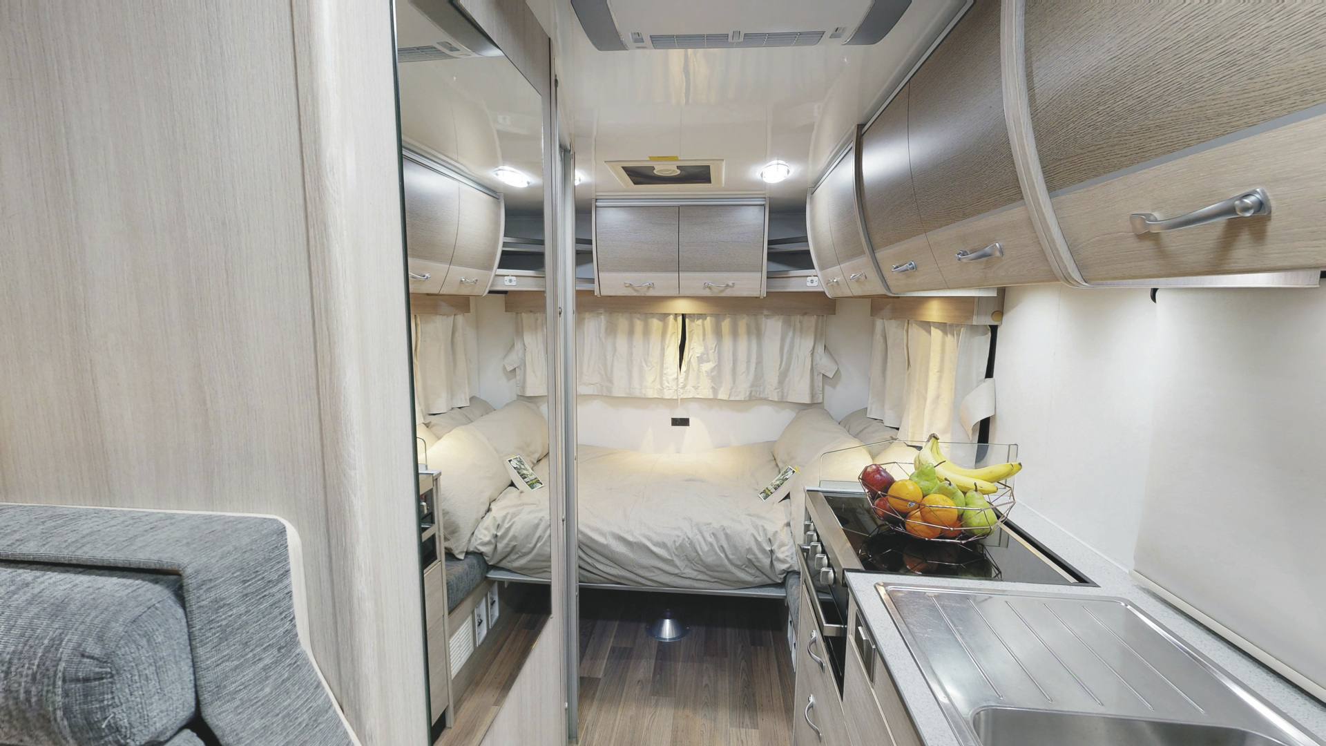 • Doppelbett über der Fahrerkabine 2,00 x 1,30 m• Sitzgruppe im Heck, zum Doppelbett umbaubar: 2,10 x 1,40 m