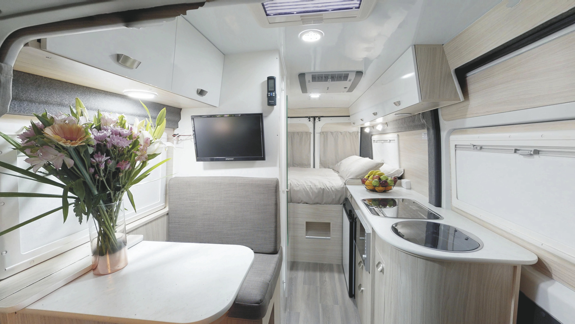 Kompakter Camper im modernen europäischen Design mit komfortabler Ausstattung und Automatikgetriebe für entspanntes Reisen zu Zweit.