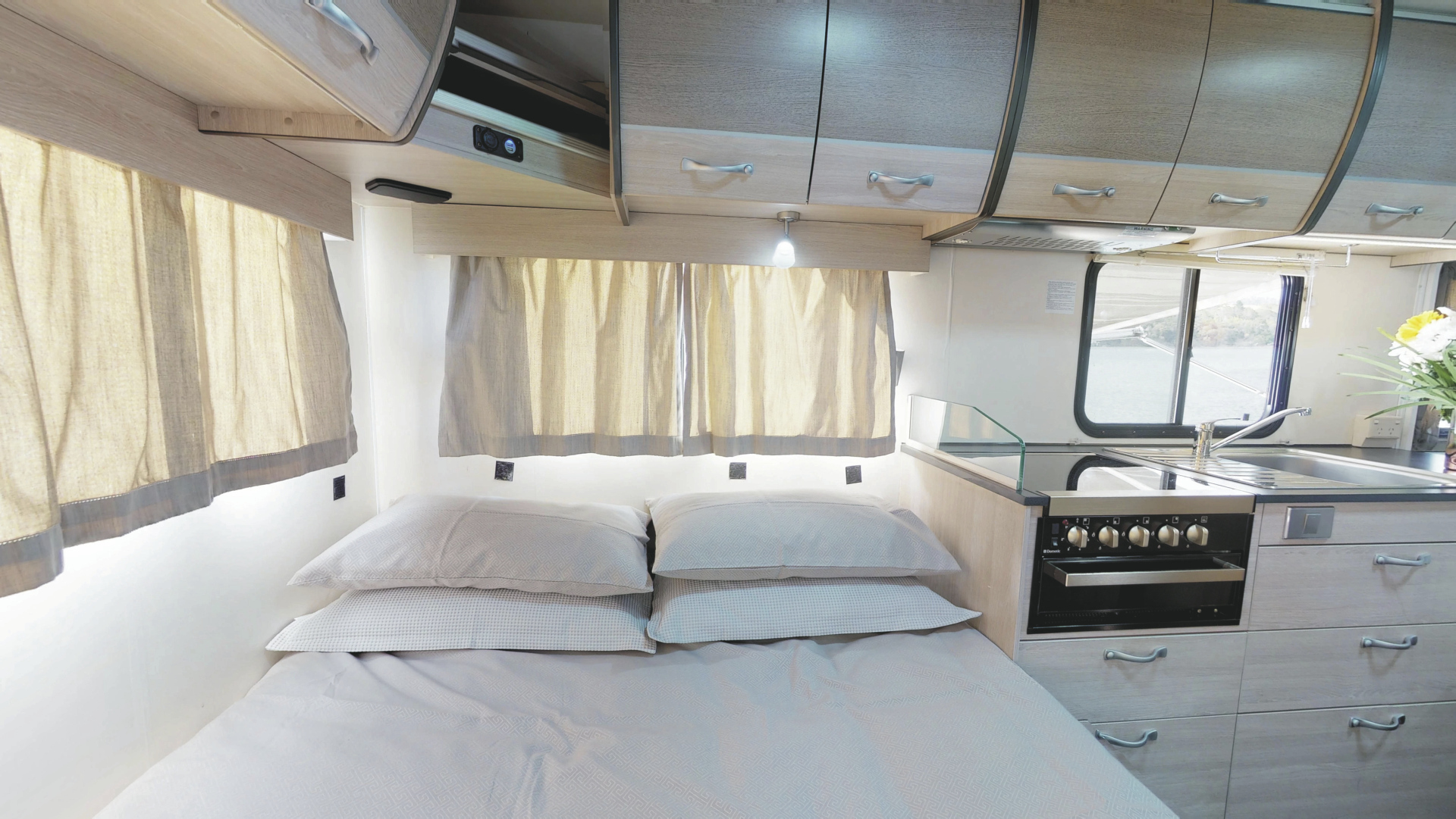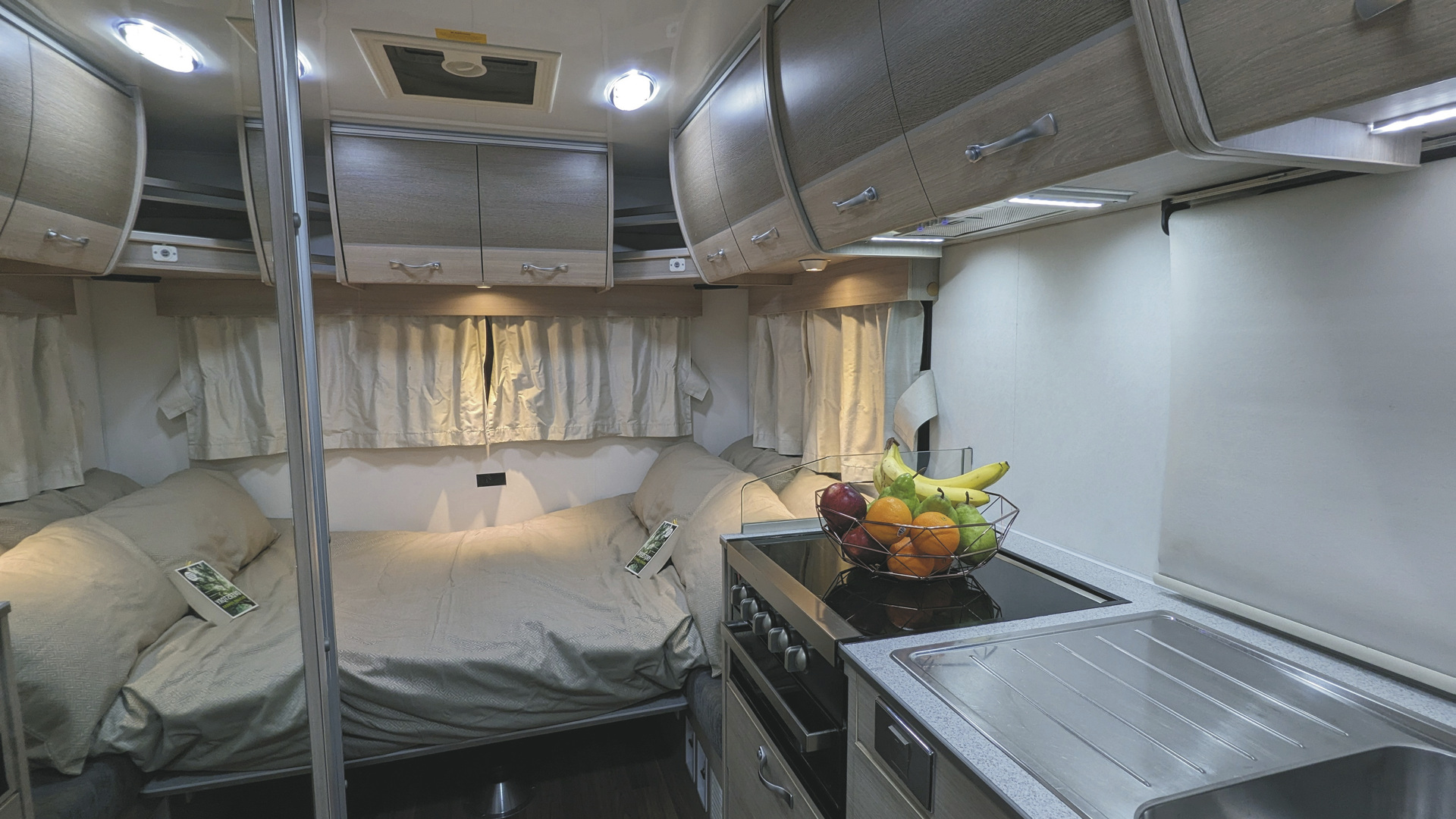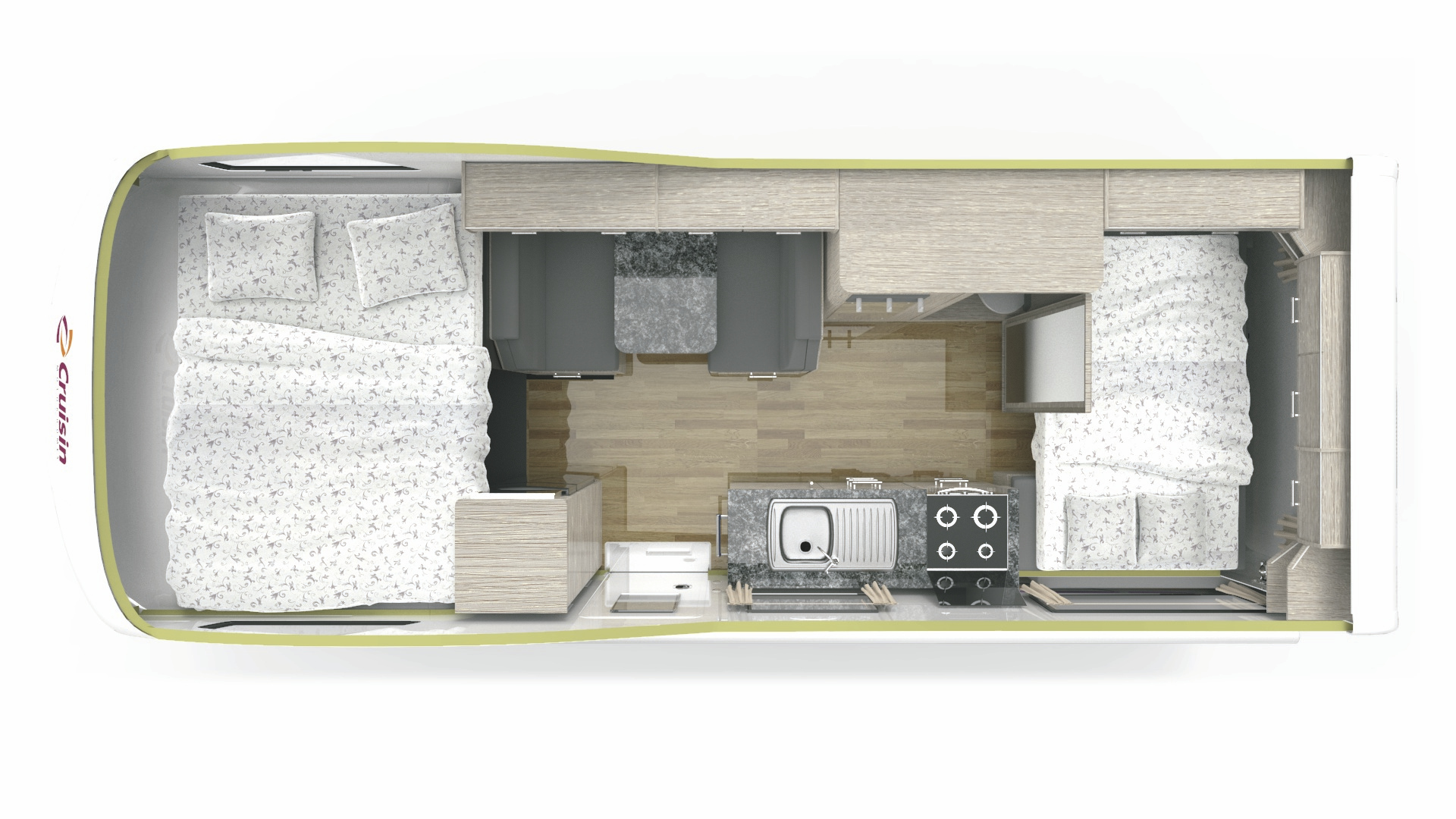 • Doppelbett über der Fahrerkabine 2,00 x 1,30 m• Festes Doppelbett im Heck: 2,10 x 1,40 m