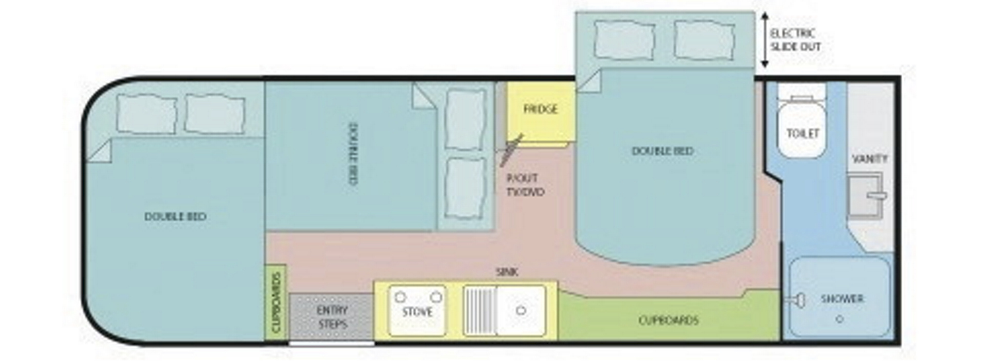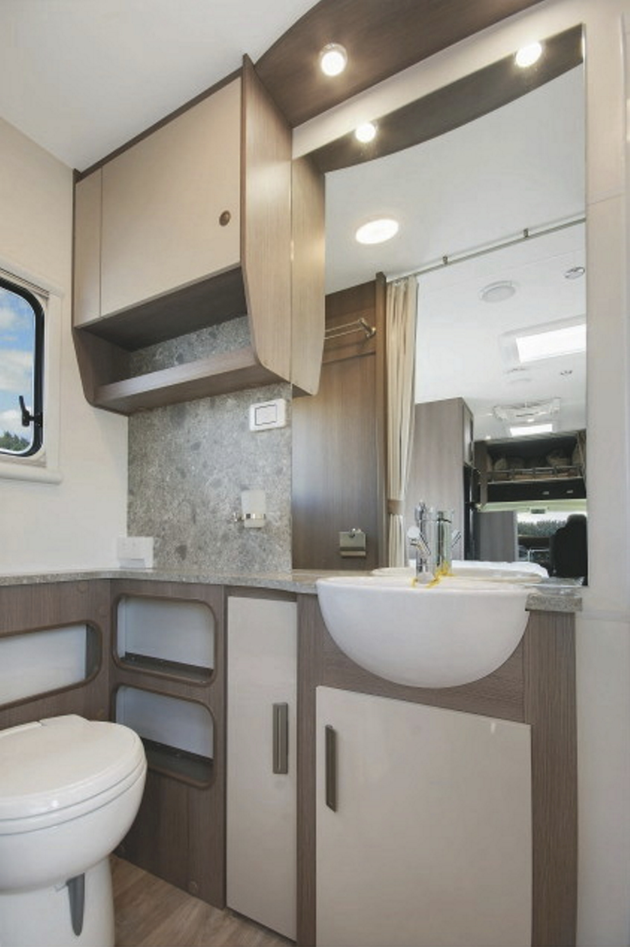 Das luxuriöse Royal-Wohnmobil ist auch für max. 6 Personen buchbar. Es verfügt über ein bequemes Inselbett, extra Platz durch seitlichen Slide-out und ein Bad im Heck über die gesamte Fahrzeugbreite. Einzigartig!