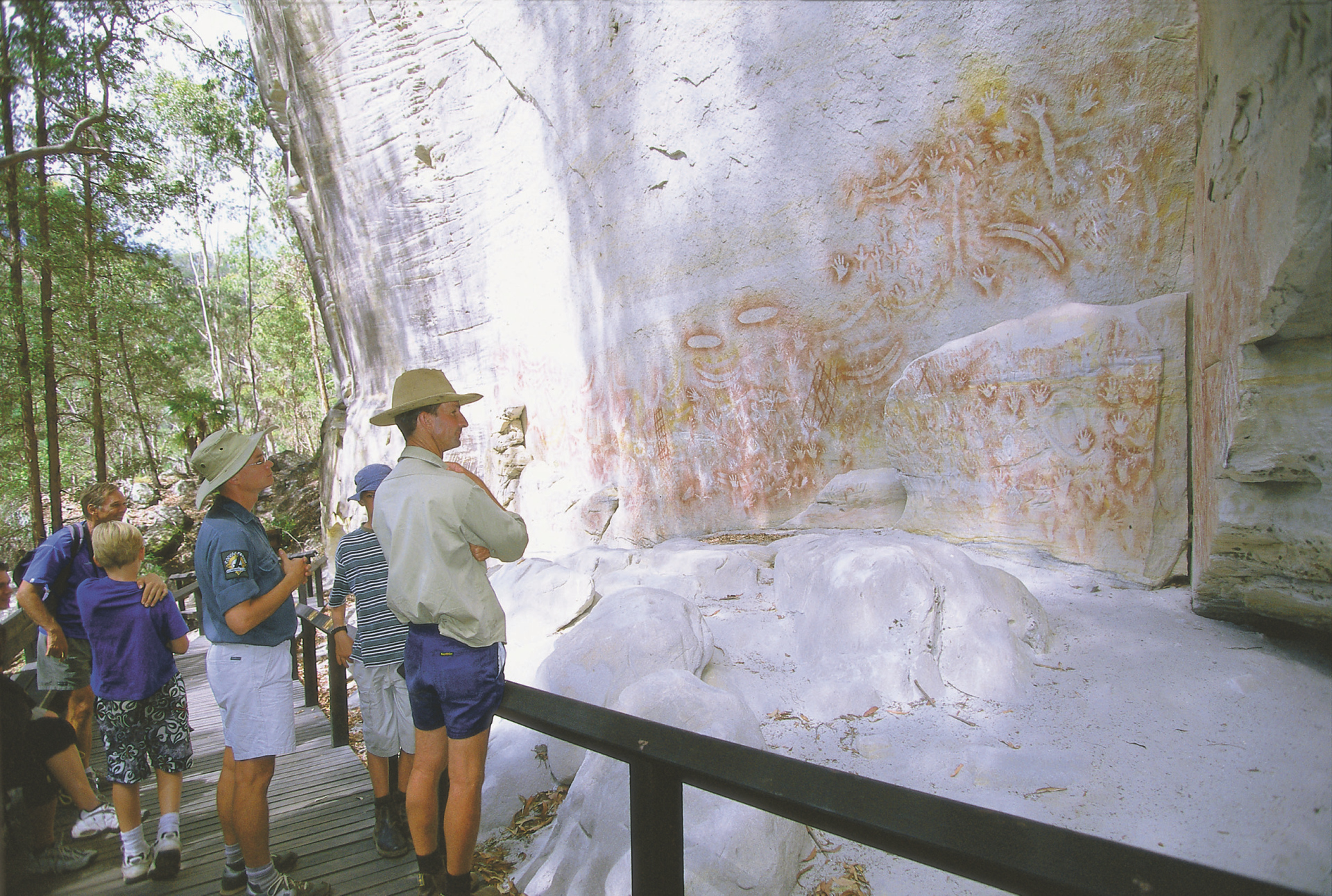 Carnarvon Gorge Nationalpark (F).Der Carnarvon Nationalpark liegt mit seinen seltenen Farnen, Palmen und Moosen wie eine Oase im weiten, trockenen Hinterland. Hier finden Sie hohe Sandsteinschluchten und Felsmalereien der Ureinwohner, die über Tausende von Jahren erhalten geblieben sind. Die Galerien an den Wänden zählen zu den größten Kunststätten Zentralqueenslands und zeigen eine der besten Kollektionen von Schablonenmalerei. Die Hauptwerke befinden sich in der Art Gallery, in der Cathedral Cave und in der Kenniff Cave. Beeindruckende Wanderungen führen durch das üppige Grün.