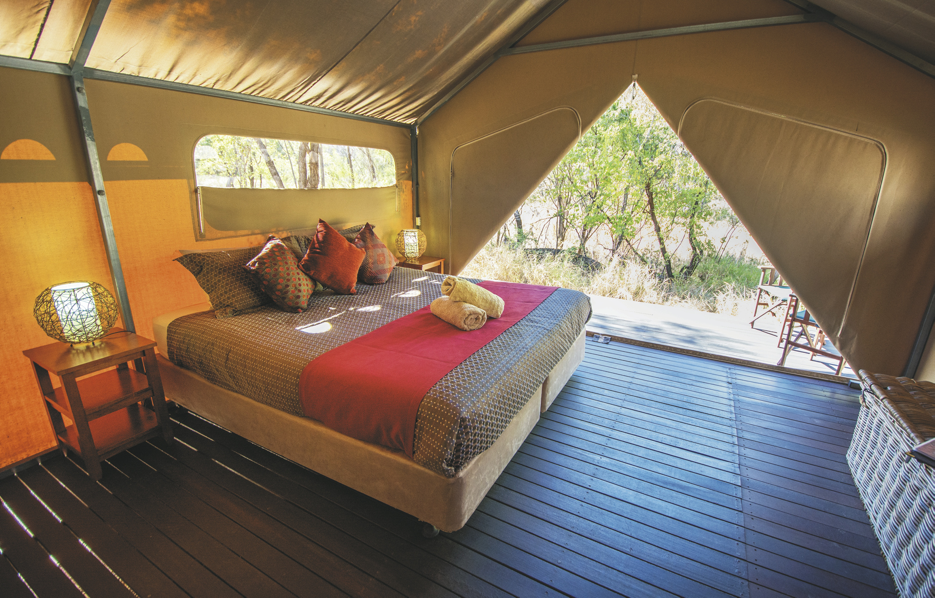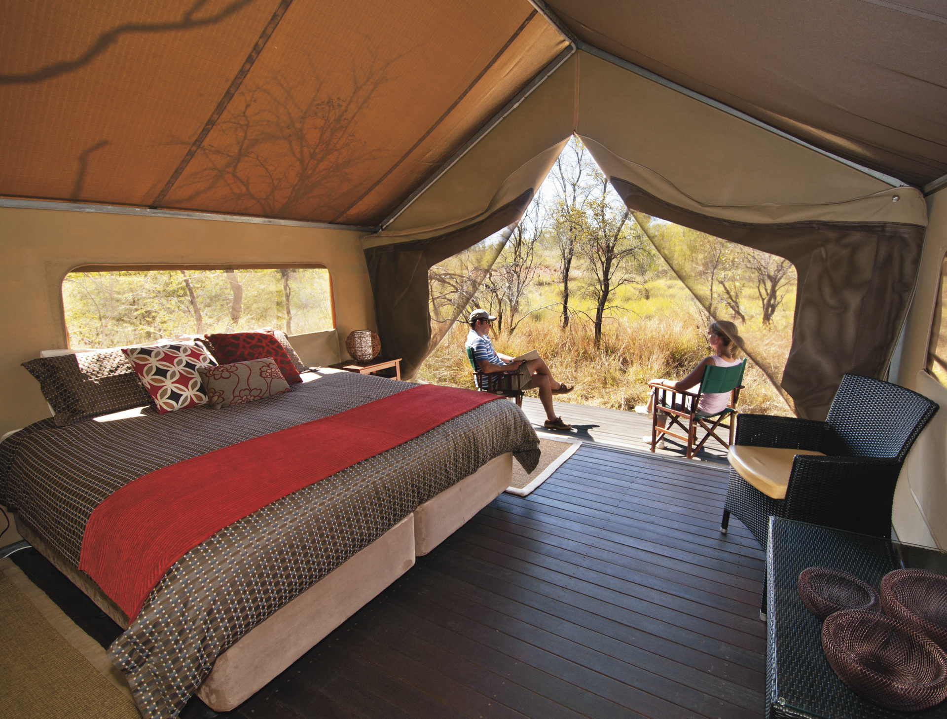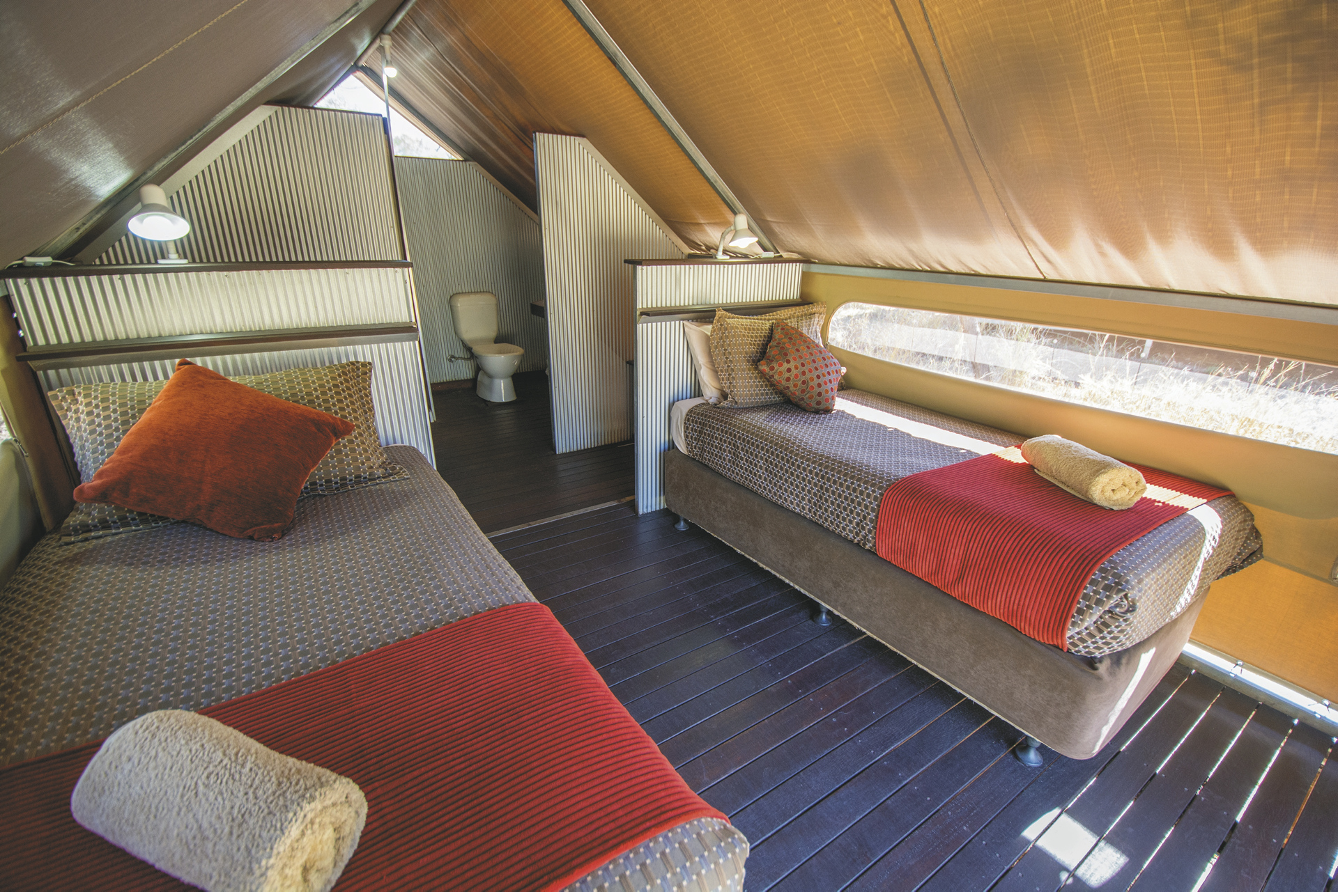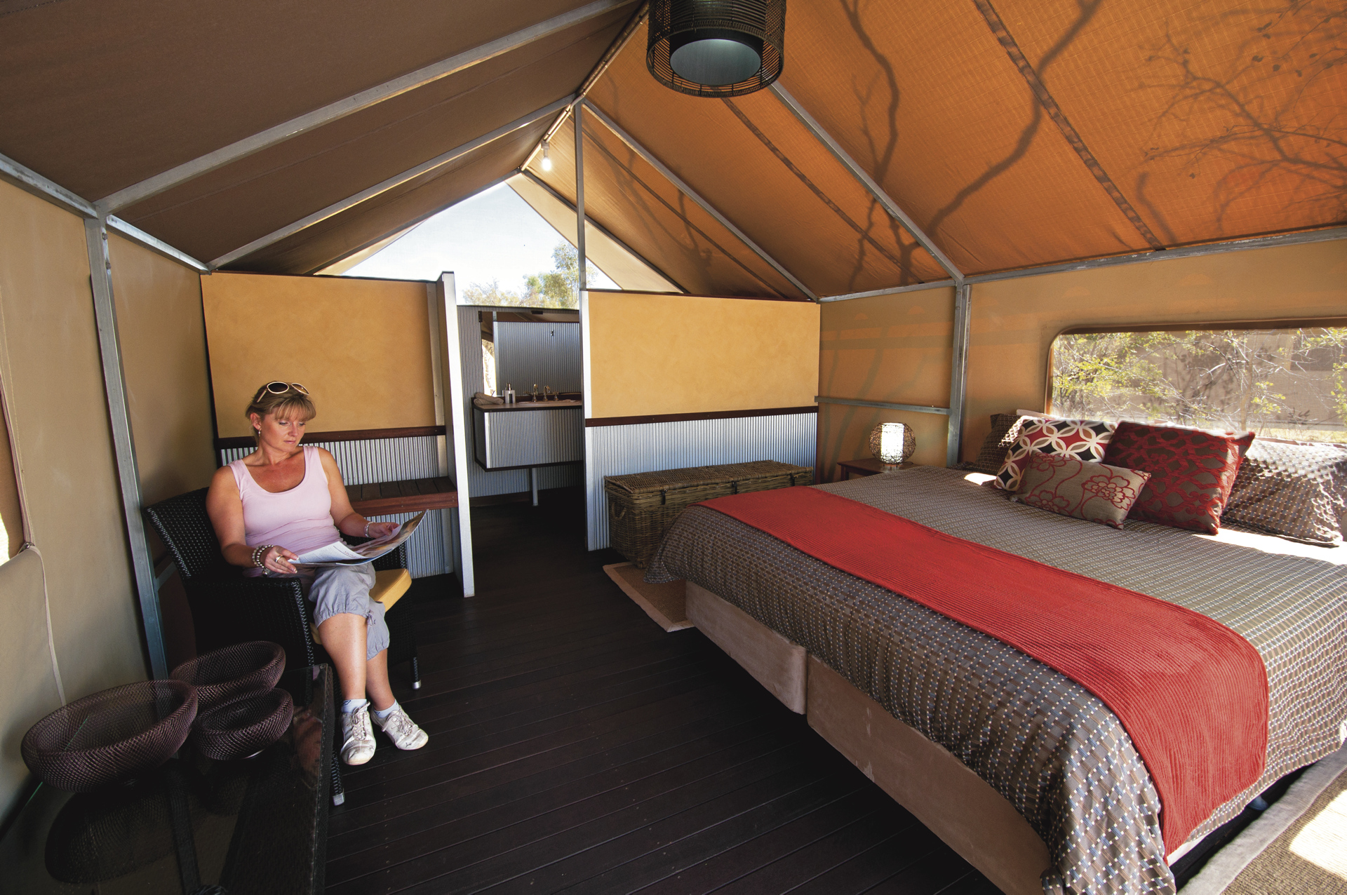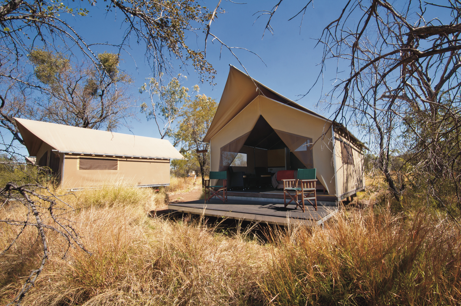 Die Bellburn Campsite verfügt über 30 Standard- und Superior-Zelte, die Piccaninny Campsite über 10 Superior-Zelte. Alle mit festen Holzfußböden und eigenem Bad mit Dusche/WC. Die Standardzelte (6 x 3 m groß) sind mit zwei Einzelbetten, Nachttisch, Gepäckablagen, elektrischem Licht sowie einem kleinen Deck mit Stühlen ausgestattet. Superior-Zelte sind deutlich geräumiger und wahlweise mit Doppelbett oder zwei Einzelbetten buchbar.
