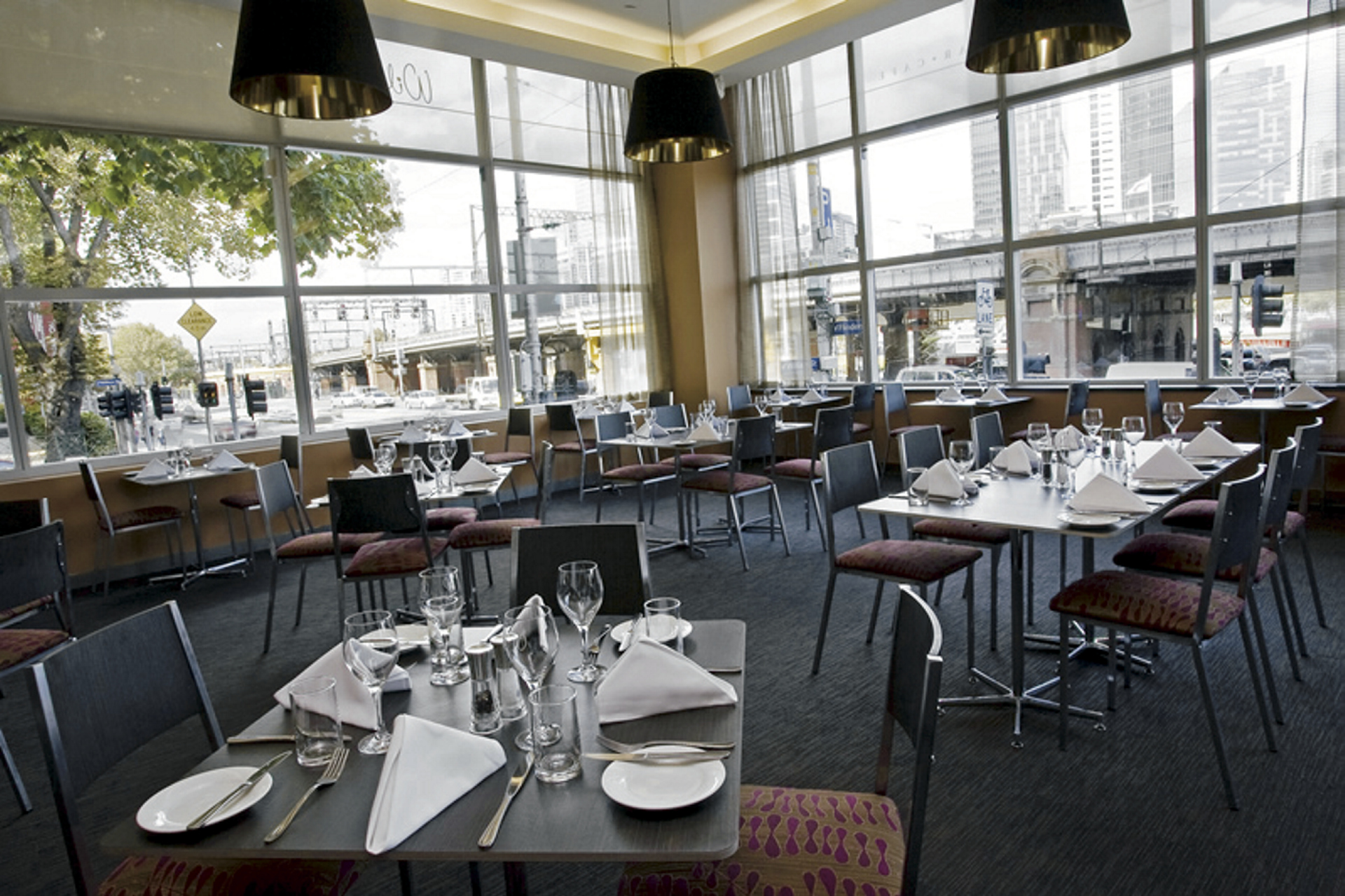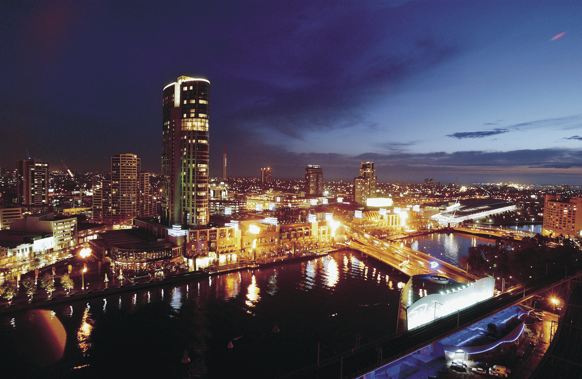 In der William Street mit Blick über den Yarra River auf das Casino. Vom Fluss nur durch eine Straße und die Bahngleise getrennt.