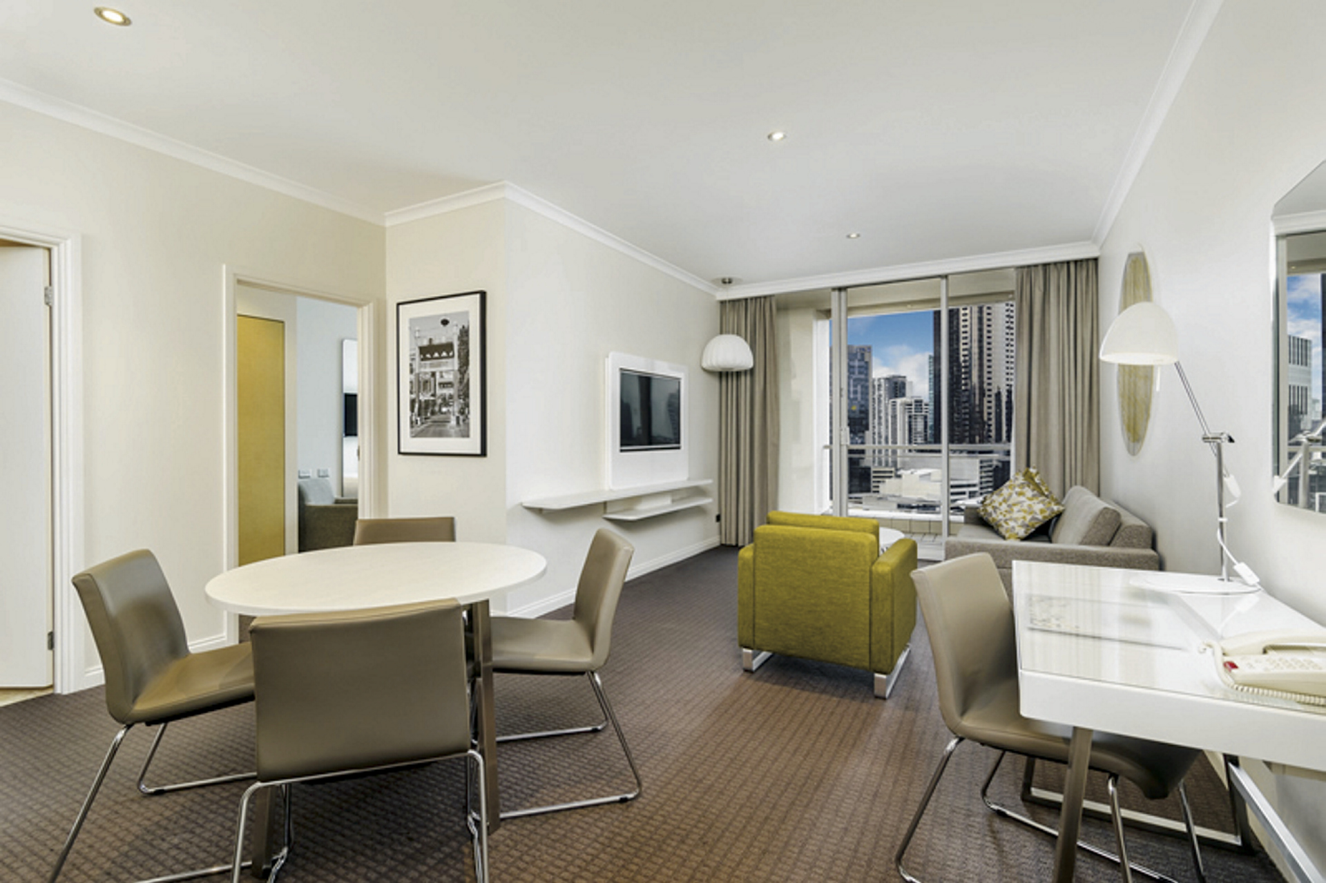 122 Studios und Apartments, alle u.a. mit Klimaanlage, TV, Minibar, Bad/WC. Studios mit kleiner Küchenzeile, Apartments mit Küche, Waschmaschine/Trockner und Schlafzimmer(n). 24-Stunden-Zimmer-Service sowie tägliche Reinigung.