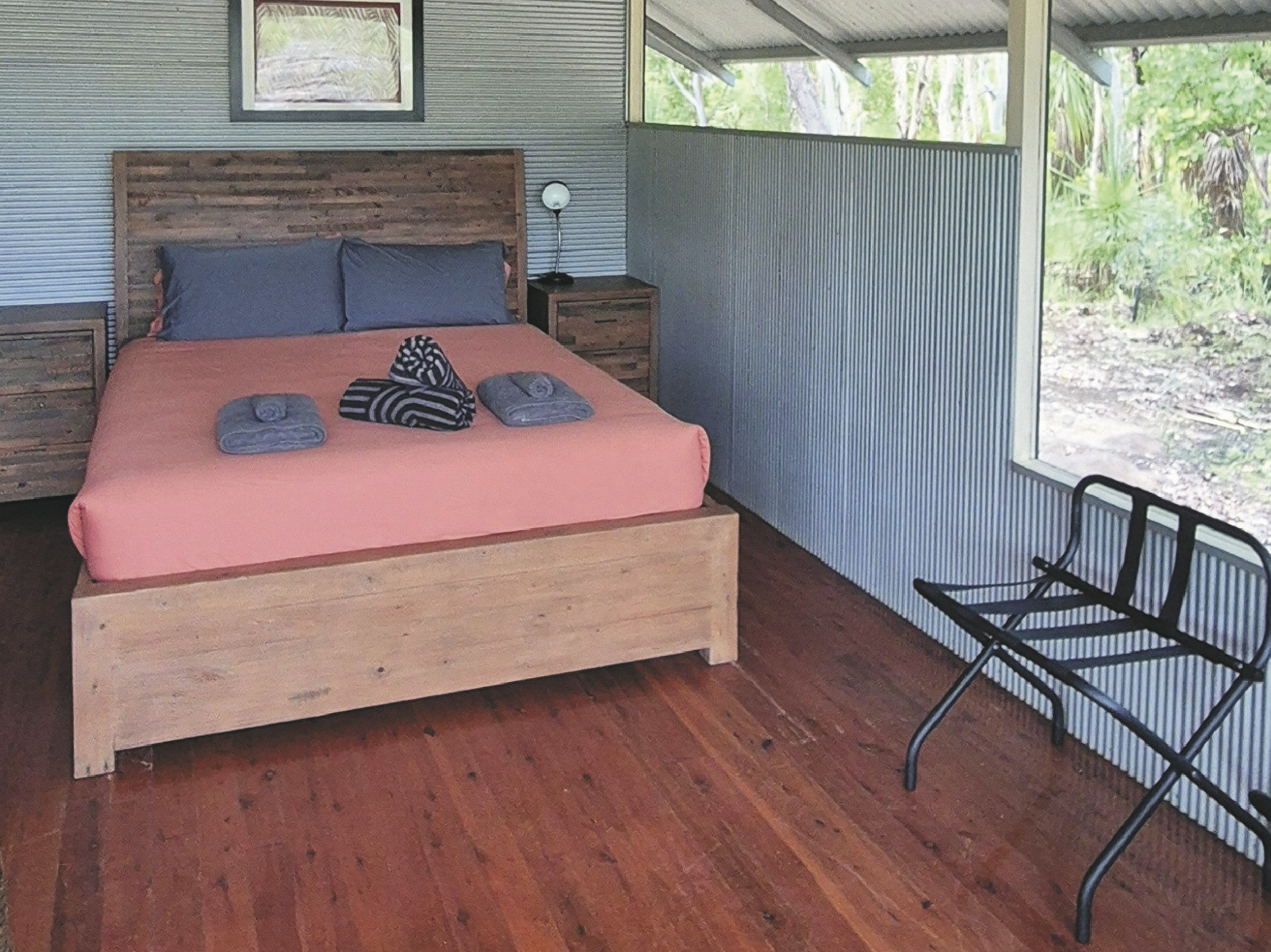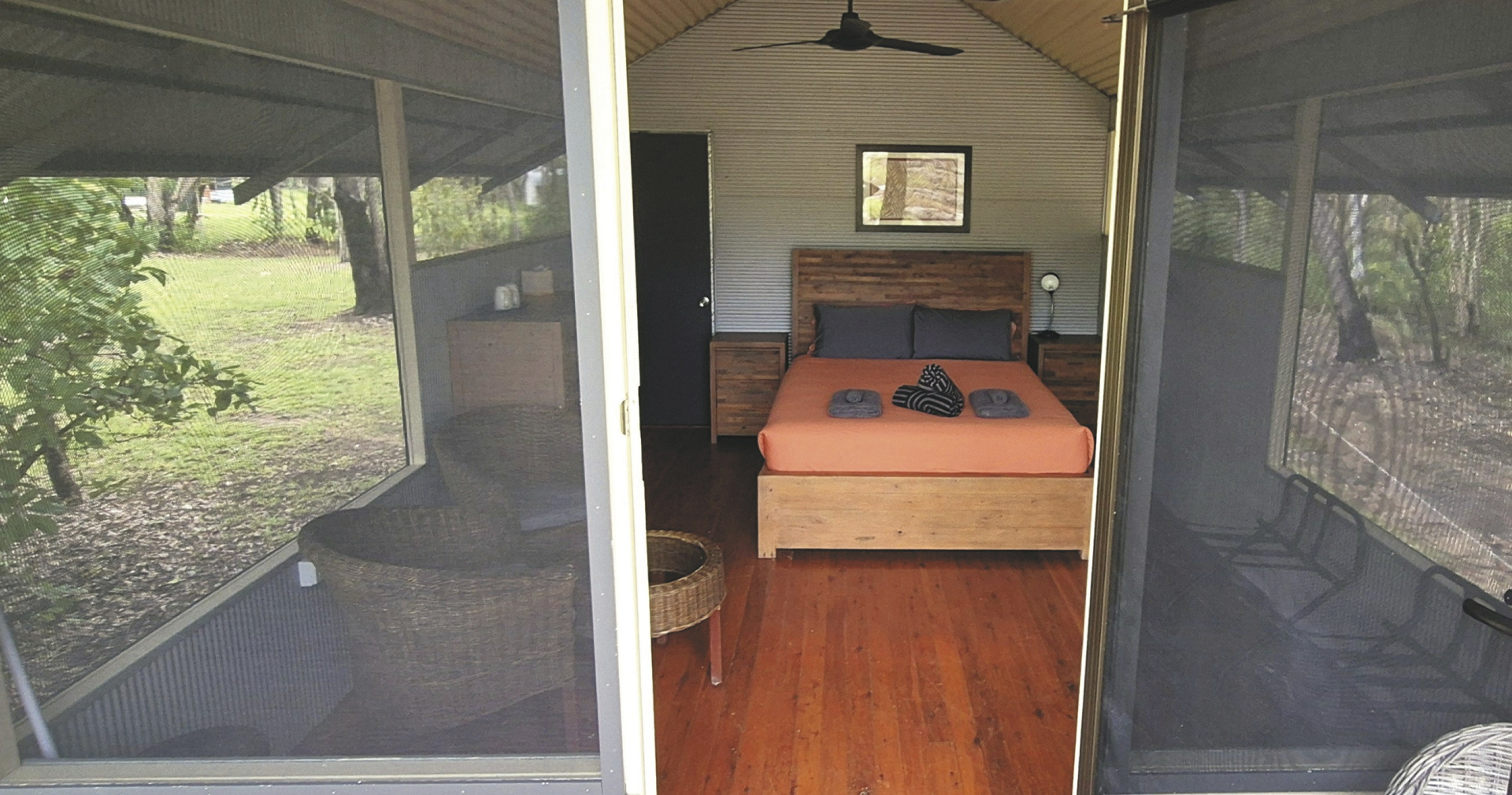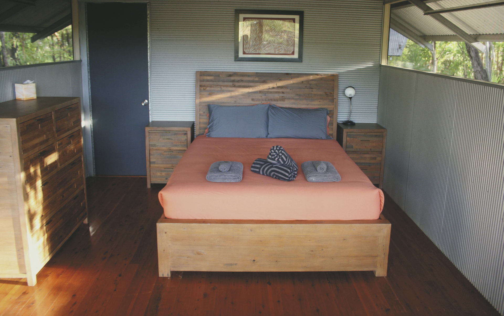 20 moderne Cabins in einem Halbkreis um das Haupthaus. Alle mit festem Holzfußboden, Dusche/WC, Stromanschluss und großflächigen Moskitonetzen an Vorderfront und Seitenwänden. Standard Cabins verfügen über zwei Einzelbetten, die etwas größeren Deluxe Cabins über ein Doppelbett sowie Stühle, Tisch und Kommode.