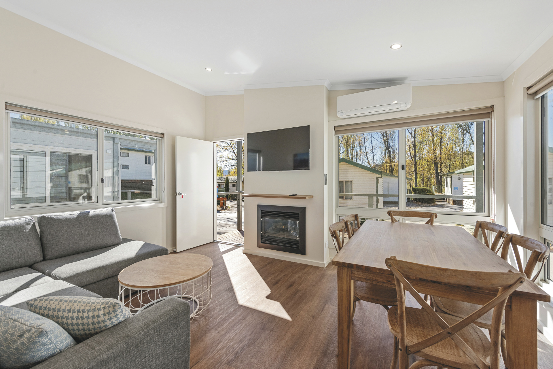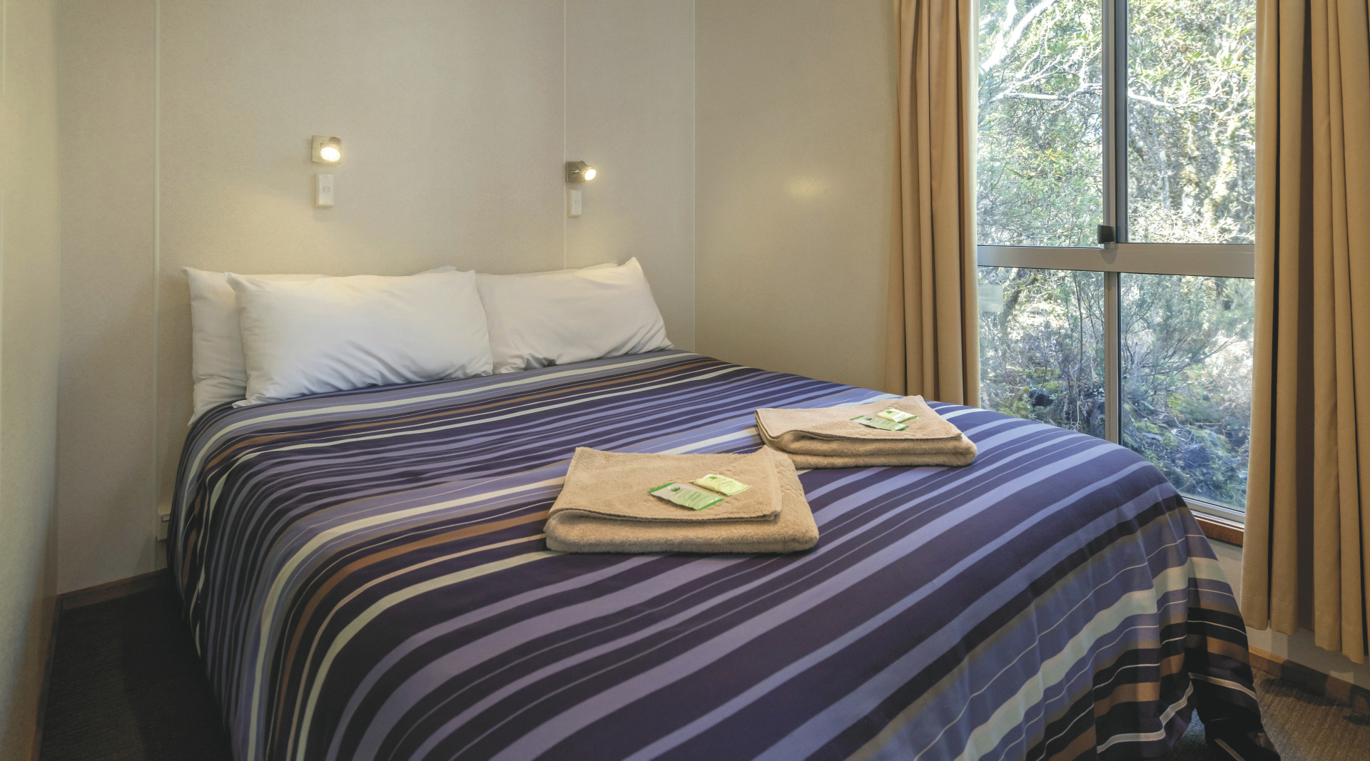 Mehr als 40 freistehende Cabins (Bungalows), alle mit Klimaanlage/Heizung, eigenem Bad/WC und Küchenzeile. Standard Cabins haben zwei Schlafzimmern (1x Queensize-Bett, 1x Stockbetten) und einen kompakten Wohn-/Essbereich. Standard Cottages haben zwei Schlafzimmer mit jeweils einem Doppelbett und einen größeren Wohnbereich mit Kaminofen. Superior Cabins sind etwas moderner eingerichtet und verfügen über zwei Schlafzimmer (1x Queensize-Bett, 1x zwei Einzelbetten). Deluxe Cabins sind besonders geräumig sowie modern und komfortabel eingerichtet, verfügen über zwei Schlafzimmer (meist 1x Queensize-Bett, 1x zwei Einzelbetten) sowie über eine überdachte Veranda.
