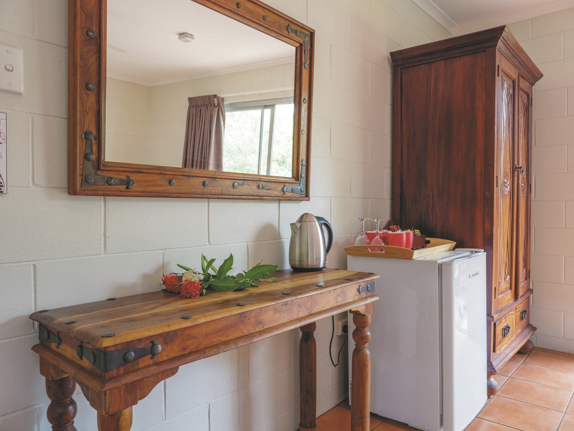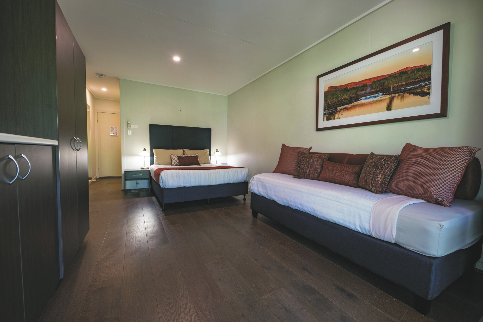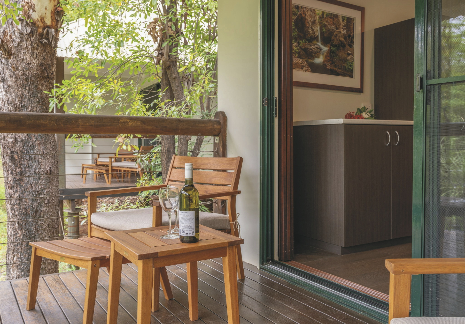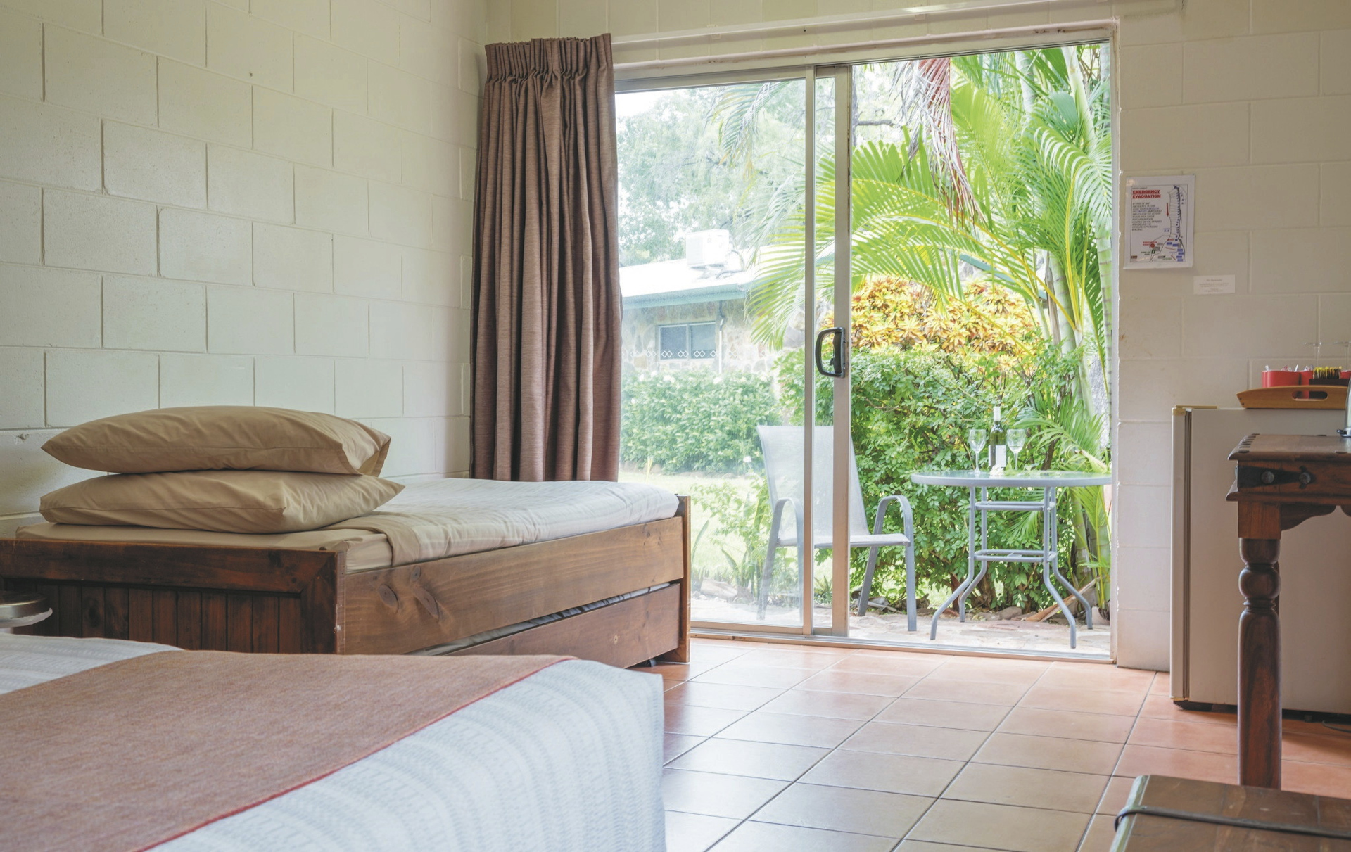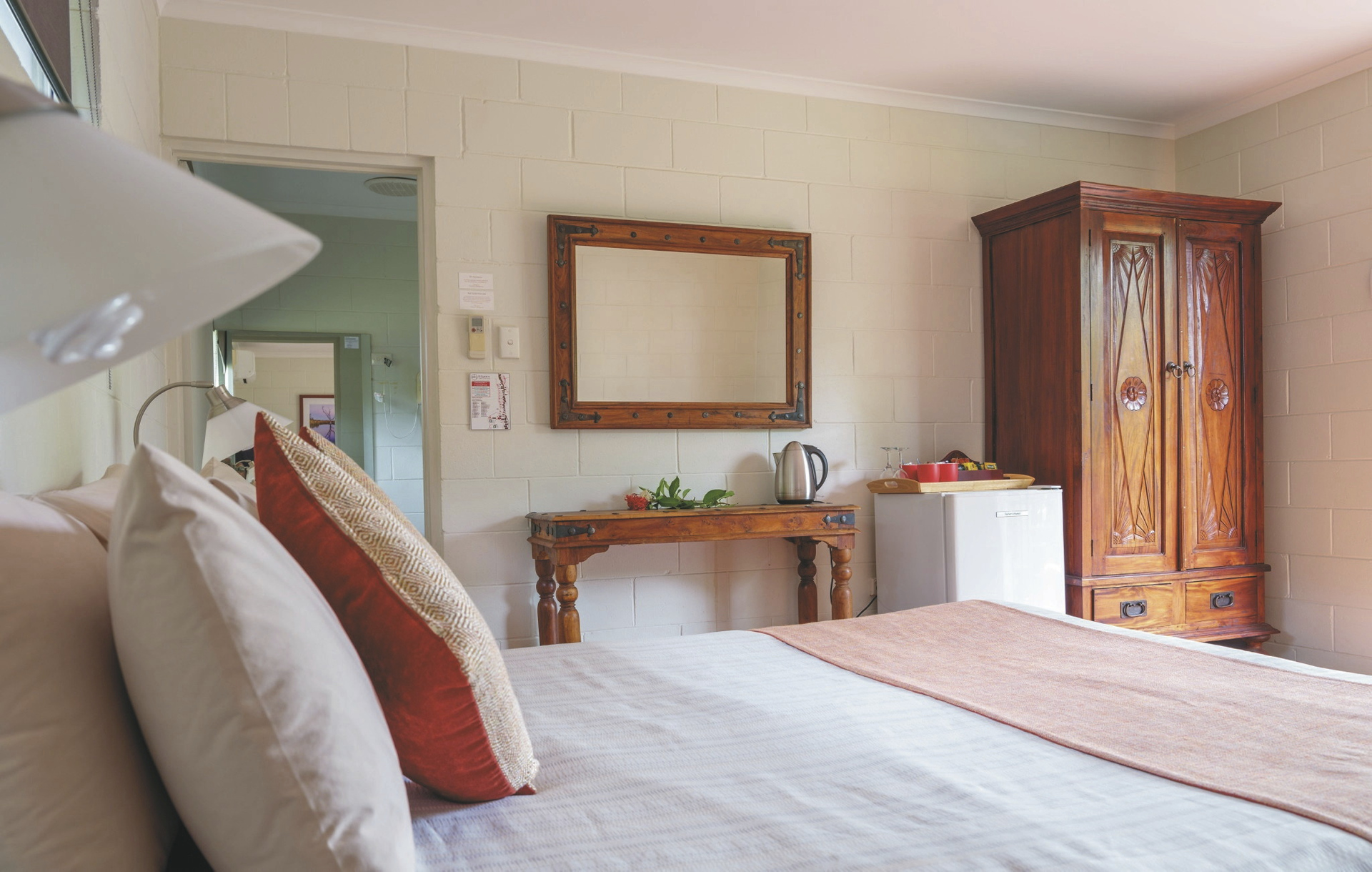 12 Zimmer in 6 Bungalows, teilweise errichtet mit Steinen aus Flüssen der Kimberley-Region. Alle ausgestattet u.a. mit Klimaanlage, Bad, Fön, Kühlschrank, Tee- und Kaffeekochgelegenheit, Bügeleisen/-brett sowie Balkon oder Terrasse mit Blick auf den Garten oder den Fluss.